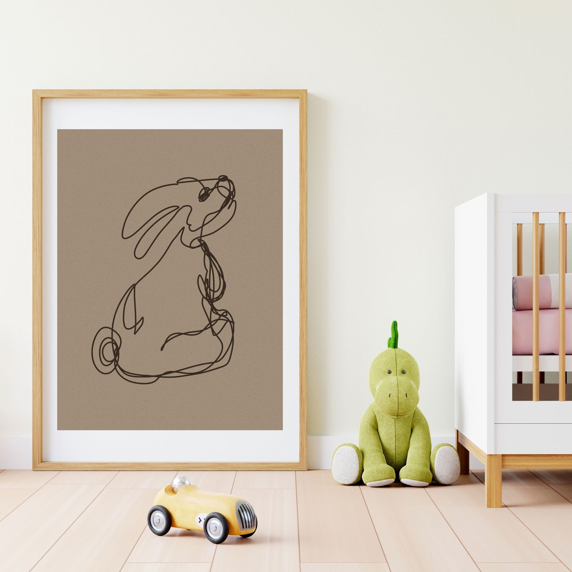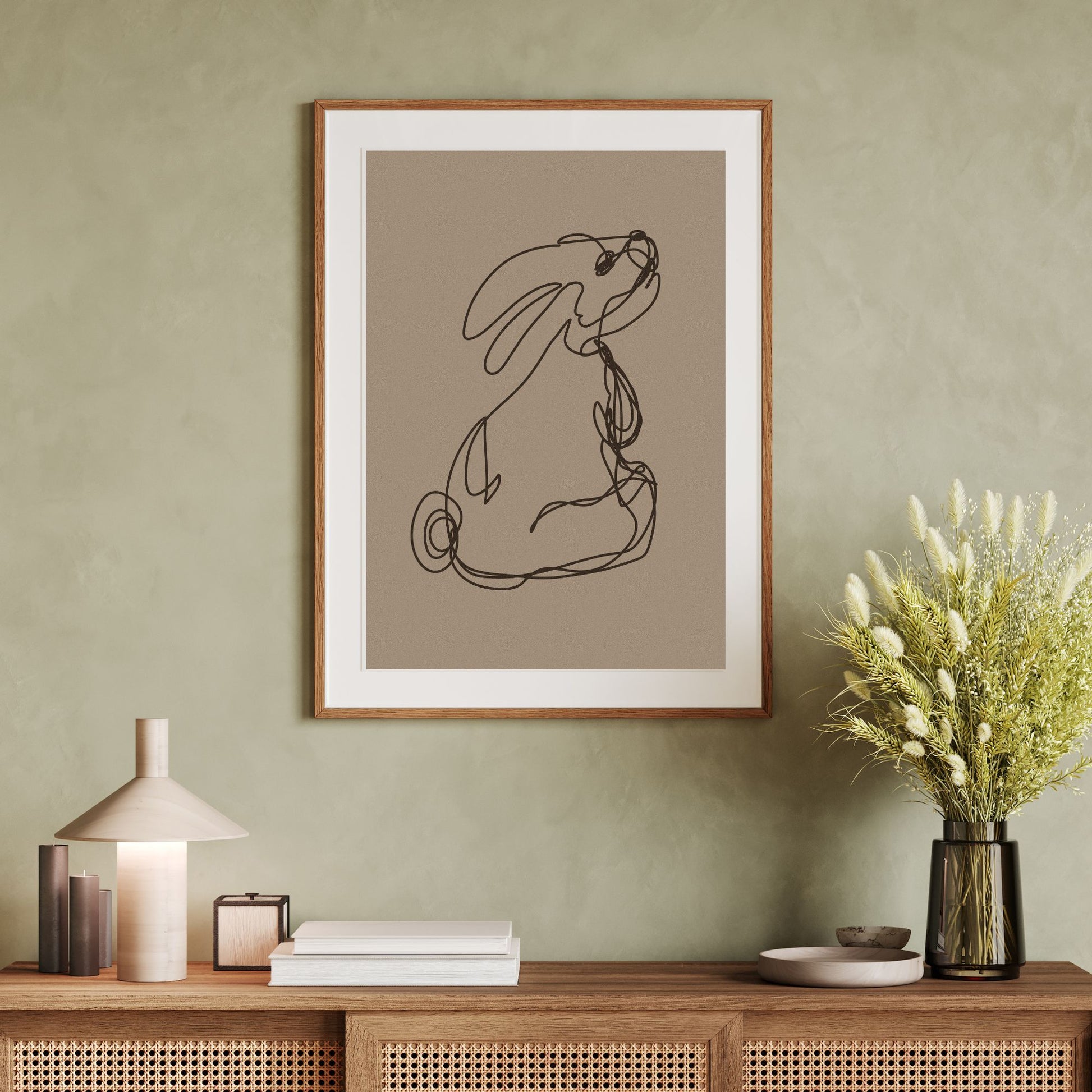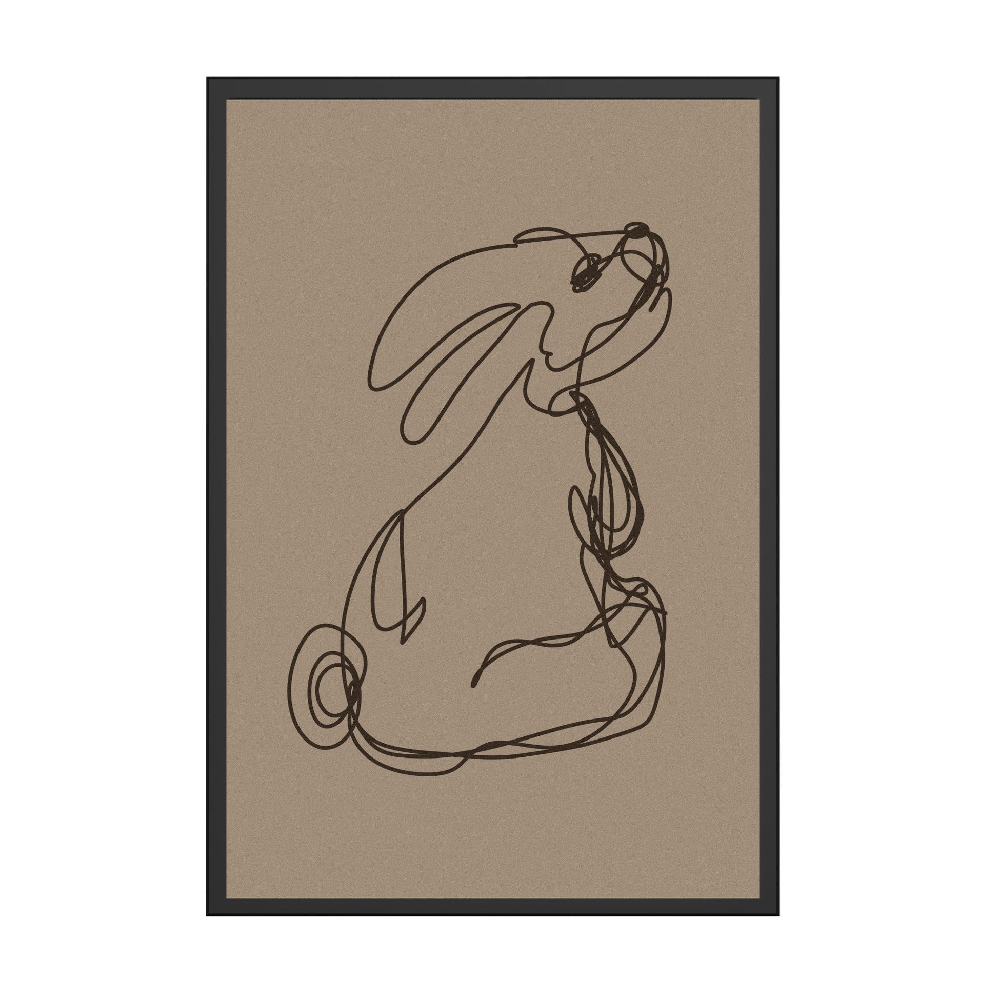 Her har jeg tegnet en kanin uten å løfte pennen. Mørk beige bakgrunn.