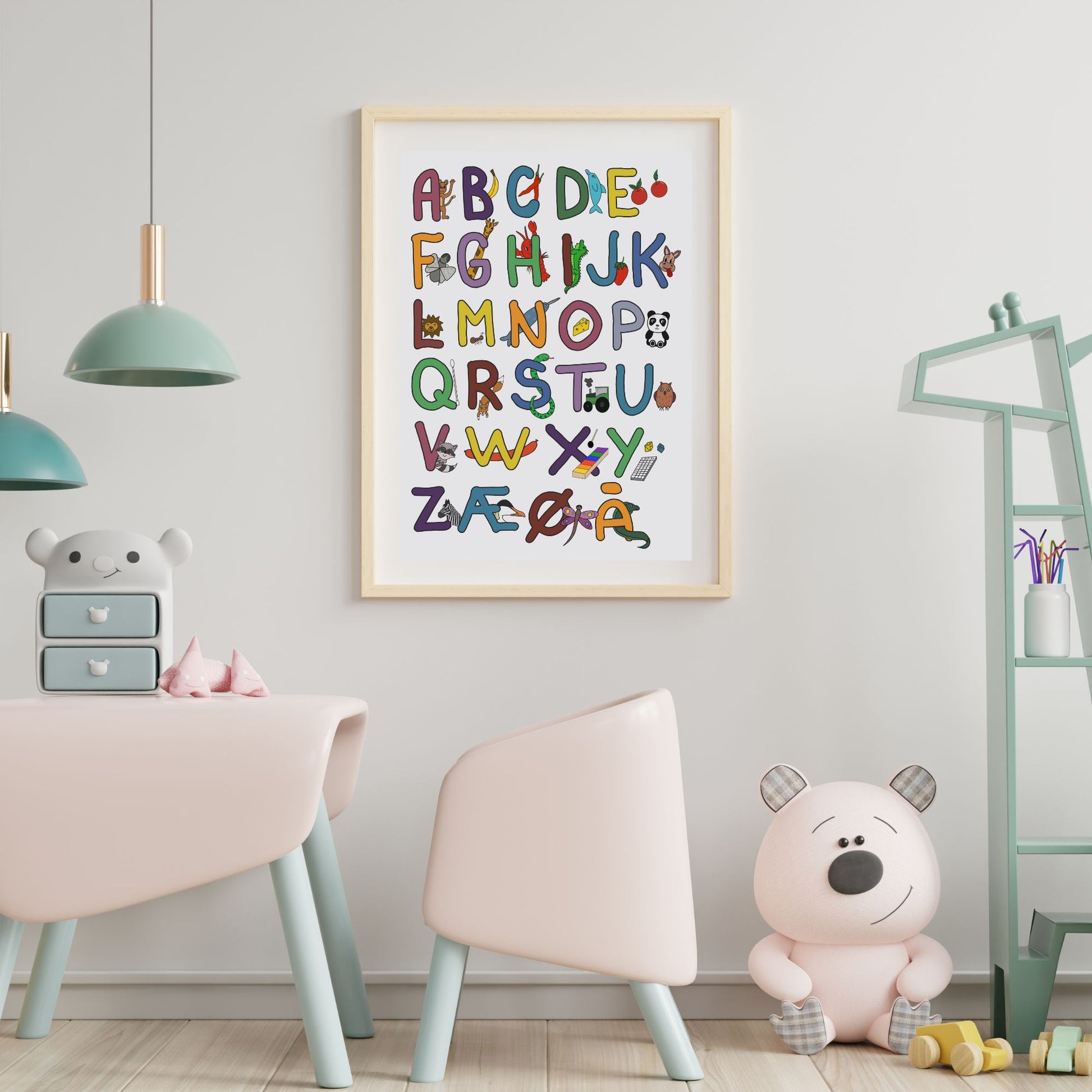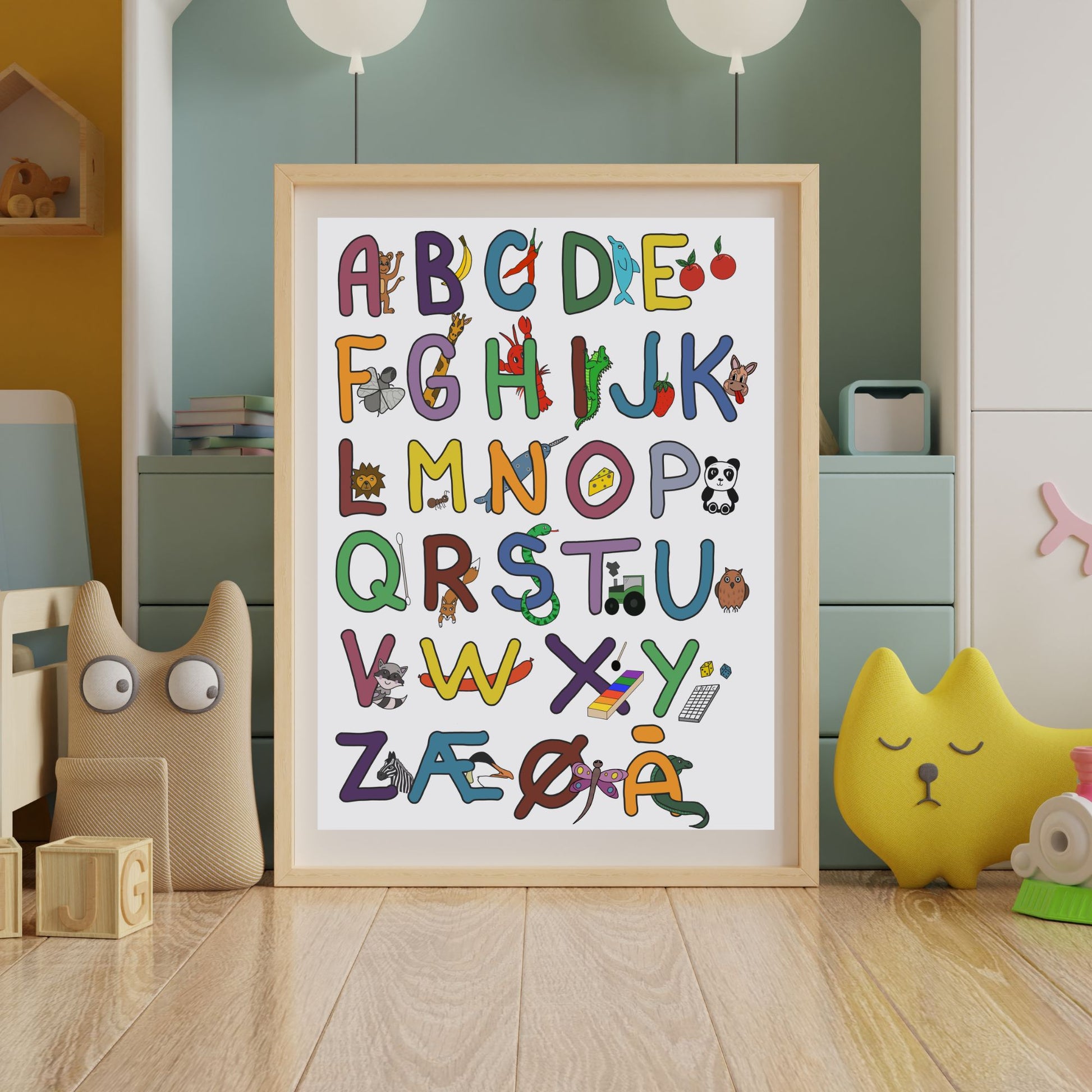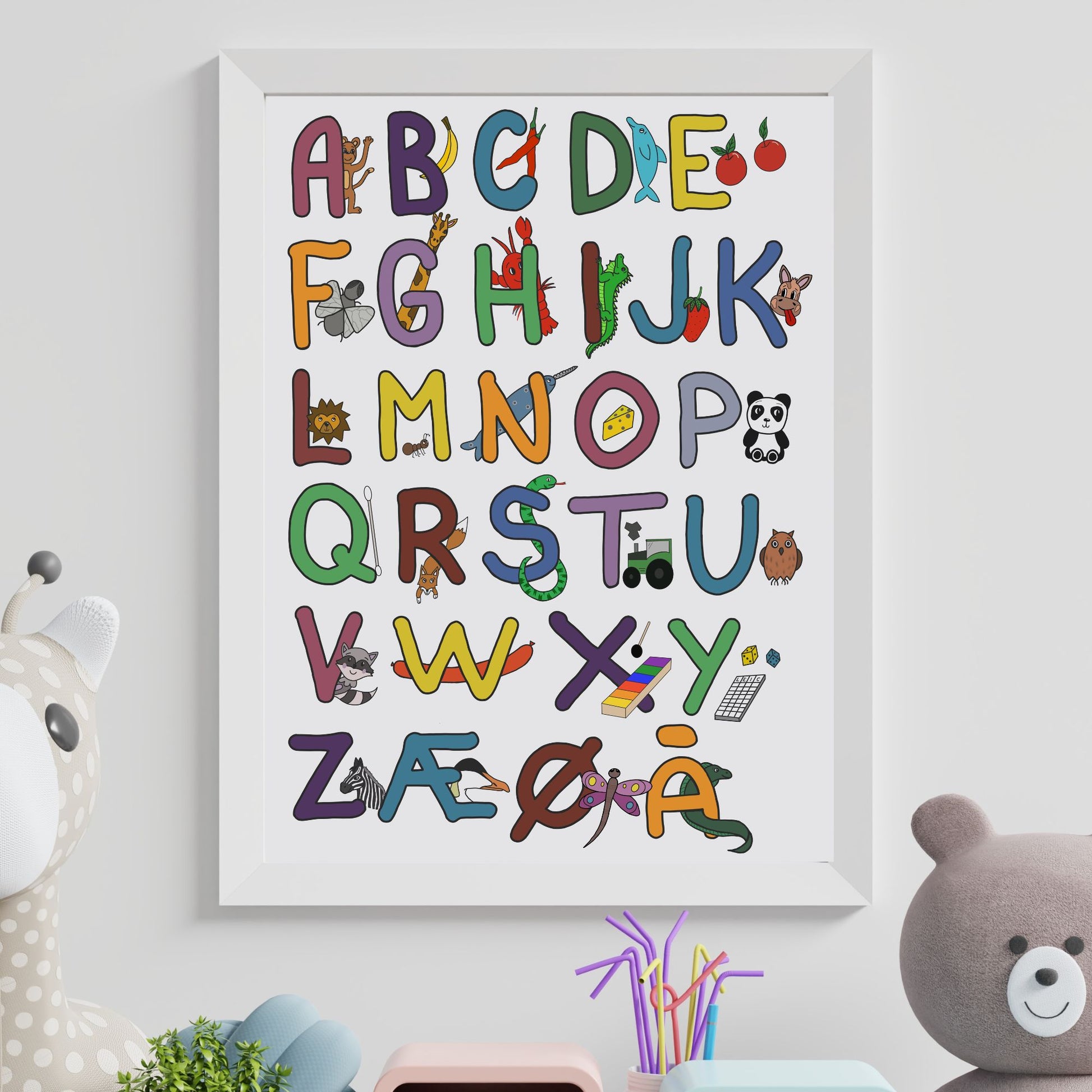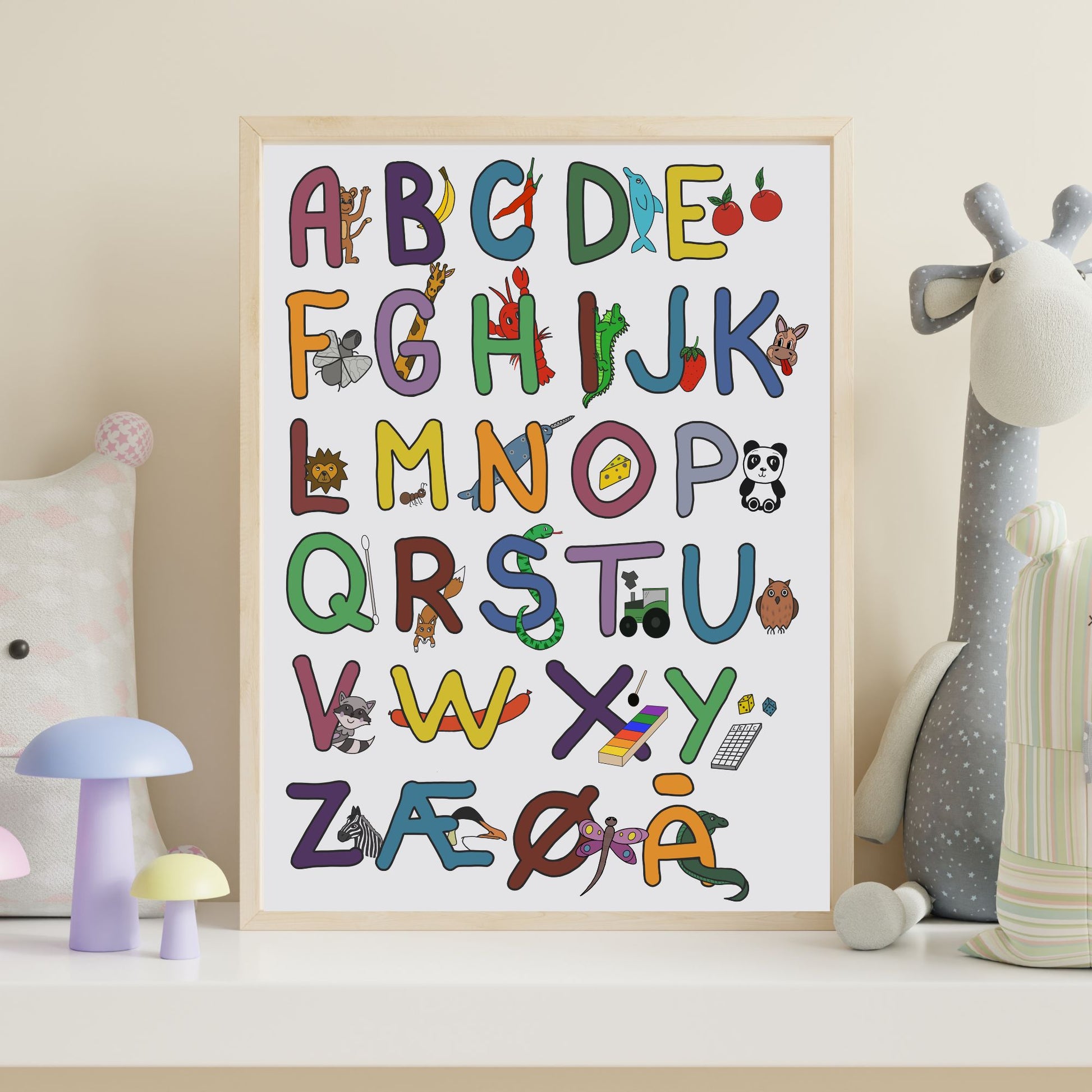 Denne plakaten har jeg brukt enormt lang tid på. Her får du det norske alfabetet med én figur tilhørende hver bokstav. Denne passer perfekt på barne- og ungdomsrom, med livlige farger. Lek og lær på samme tid!
