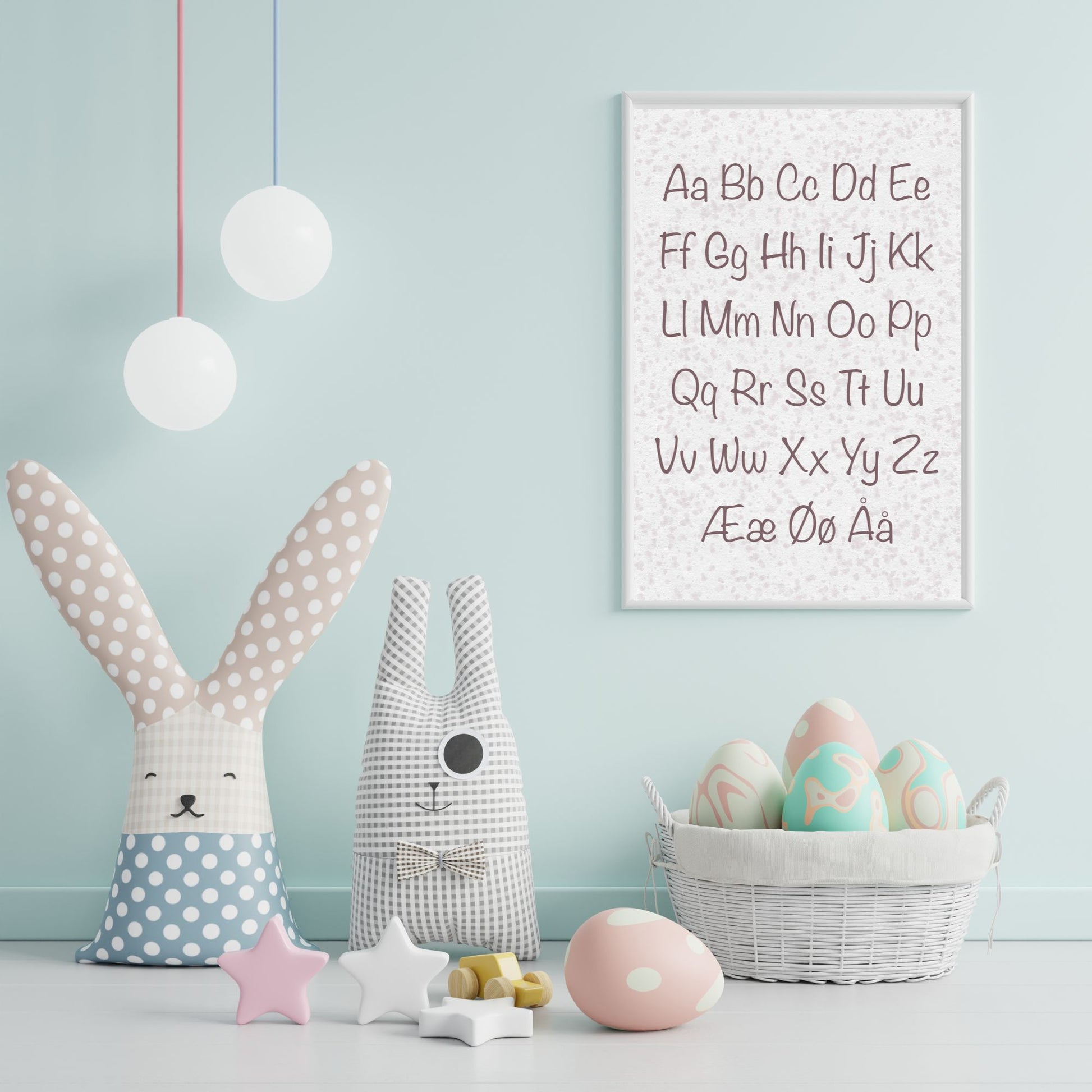 Her har jeg skrevet det norske alfabetet i små og store bokstaver, uten figurer, for en mer minimalistisk følelse. Perfekt til barnerommet!