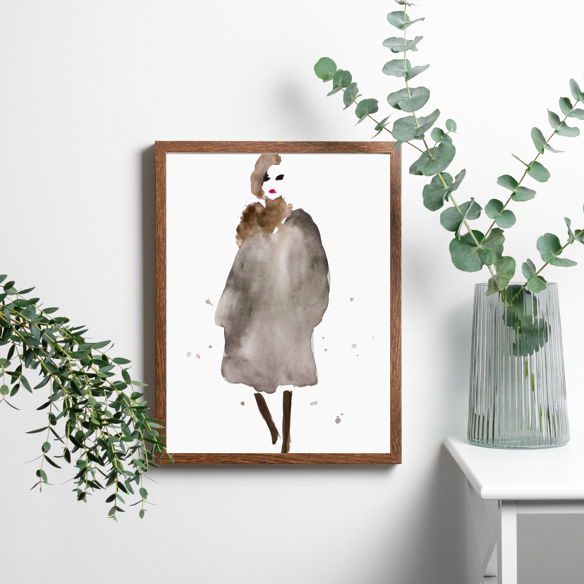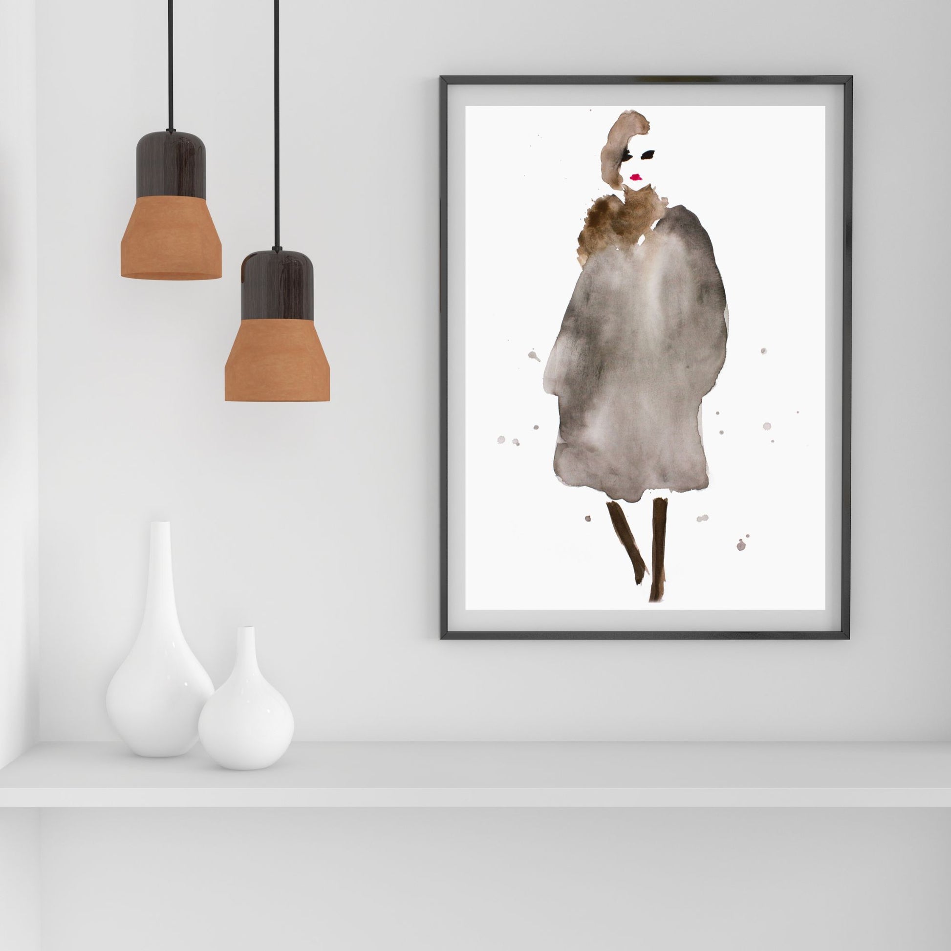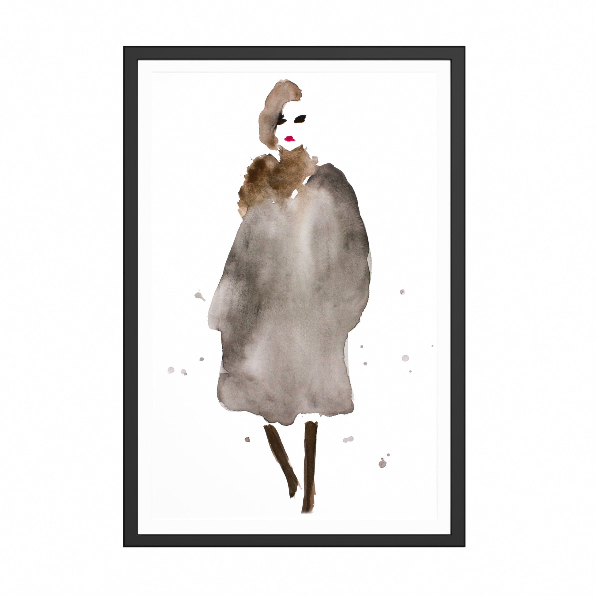 Her har jeg malt en dame kalt "Anna" med akvarellmaling. Varme brun- og gråtoner i antrekket med rød leppestift og sorte øyne.