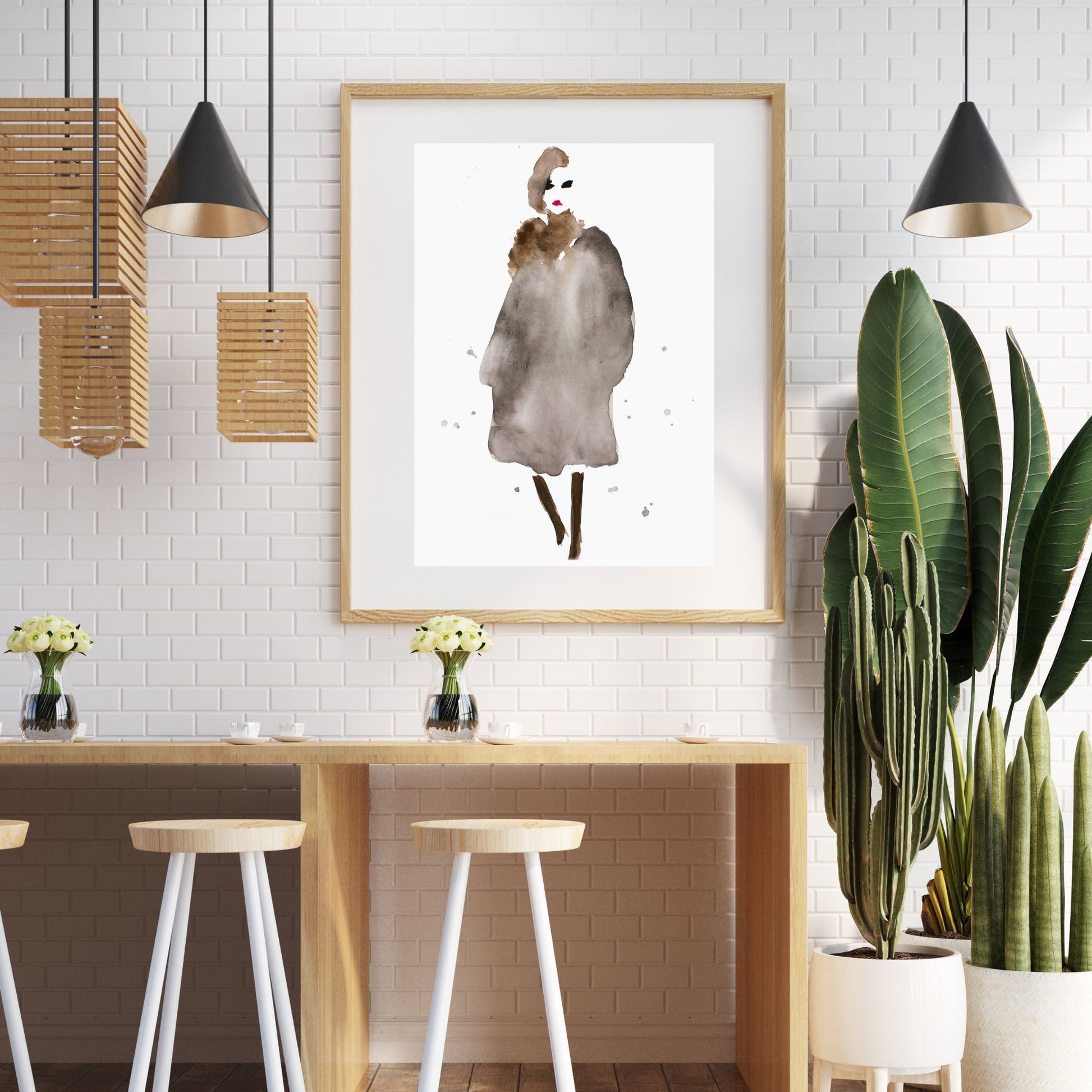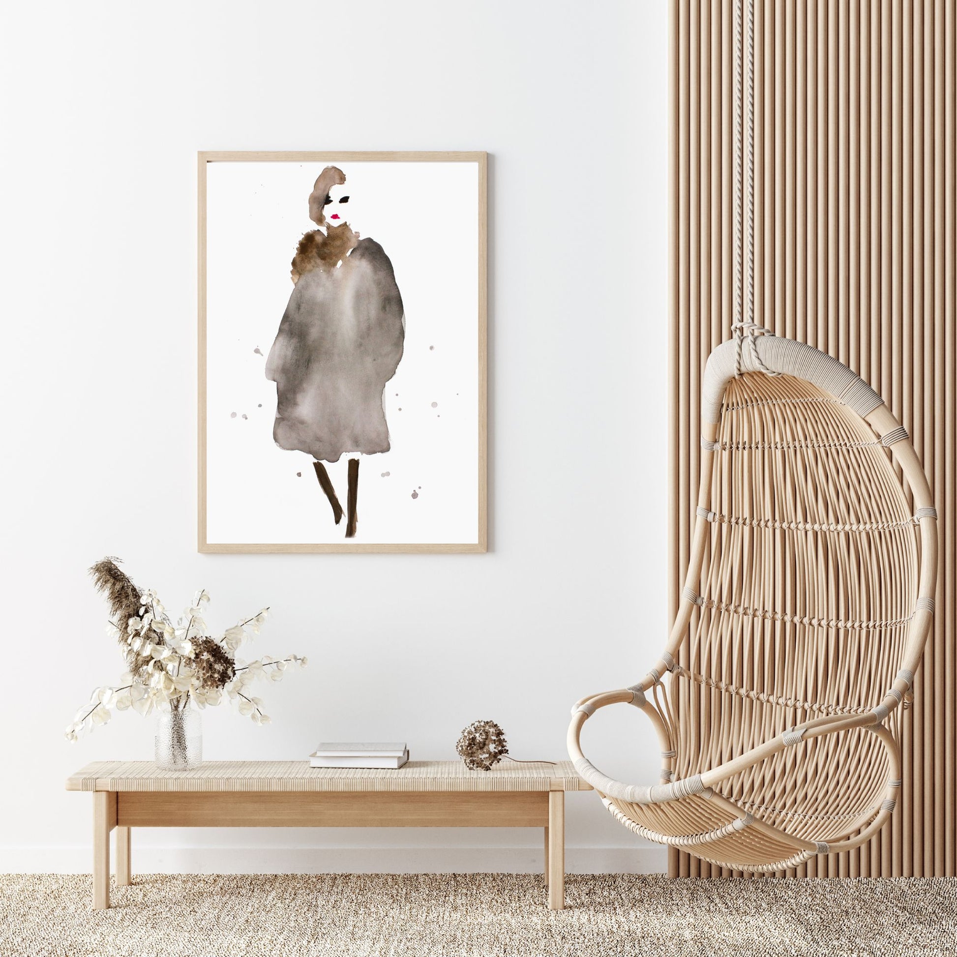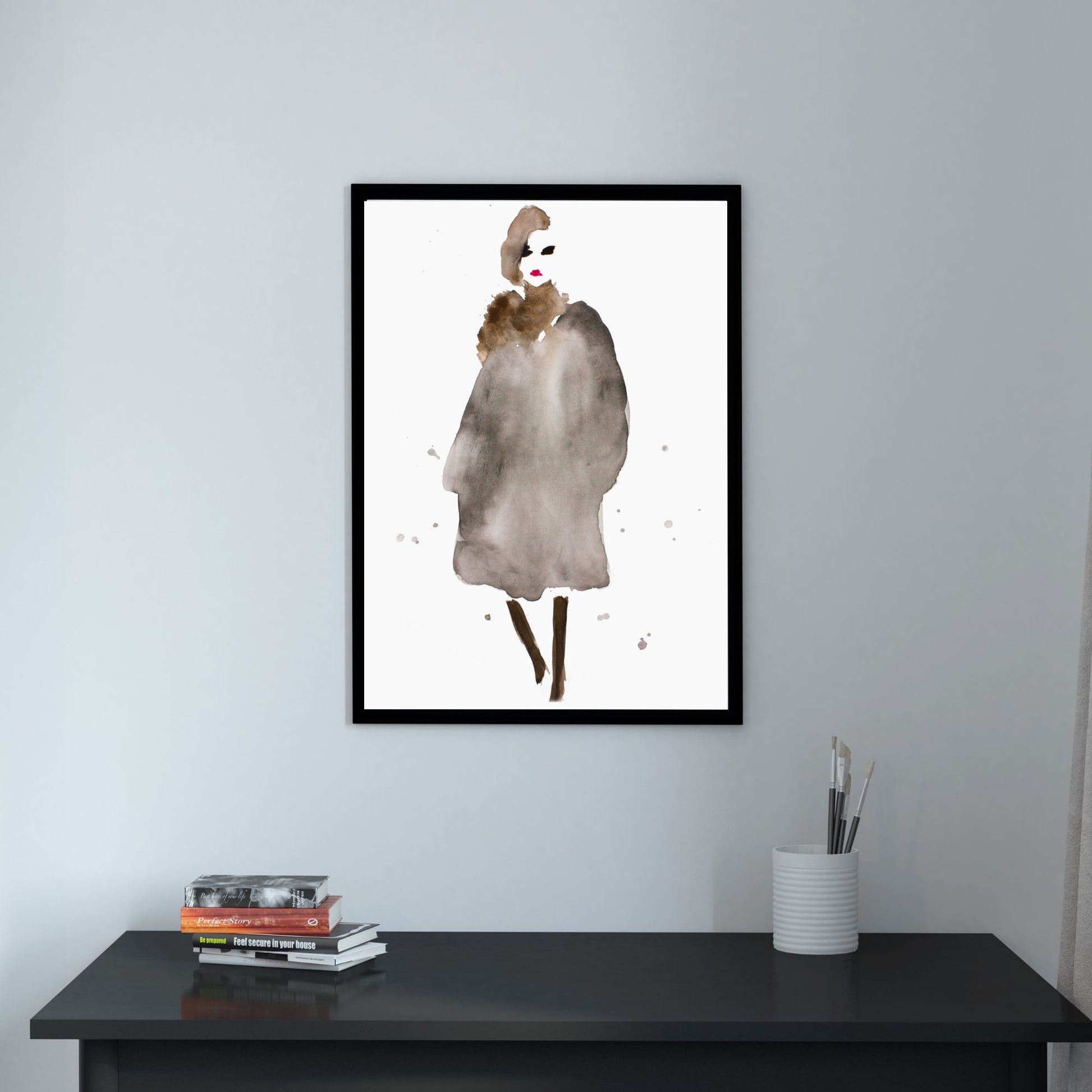 Her har jeg malt en dame kalt "Anna" med akvarellmaling. Varme brun- og gråtoner i antrekket med rød leppestift og sorte øyne.