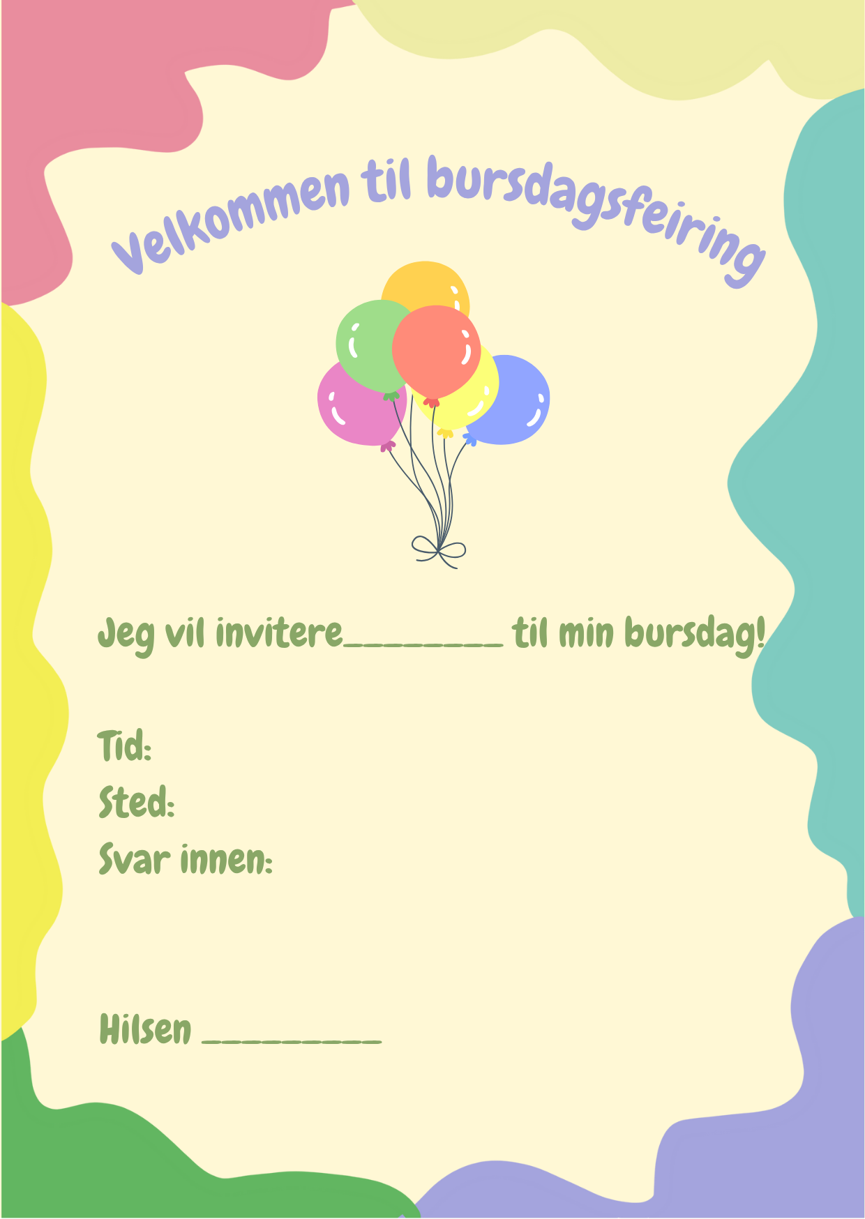 Gjør bursdagsplanleggingen enkel og morsom med vår nedlastbare bursdagsinvitasjon! Dette er en søt og barnevennlig invitasjon som passer perfekt til barneselskaper – klar til å fylles ut med navn, tid, sted og svarfrist.