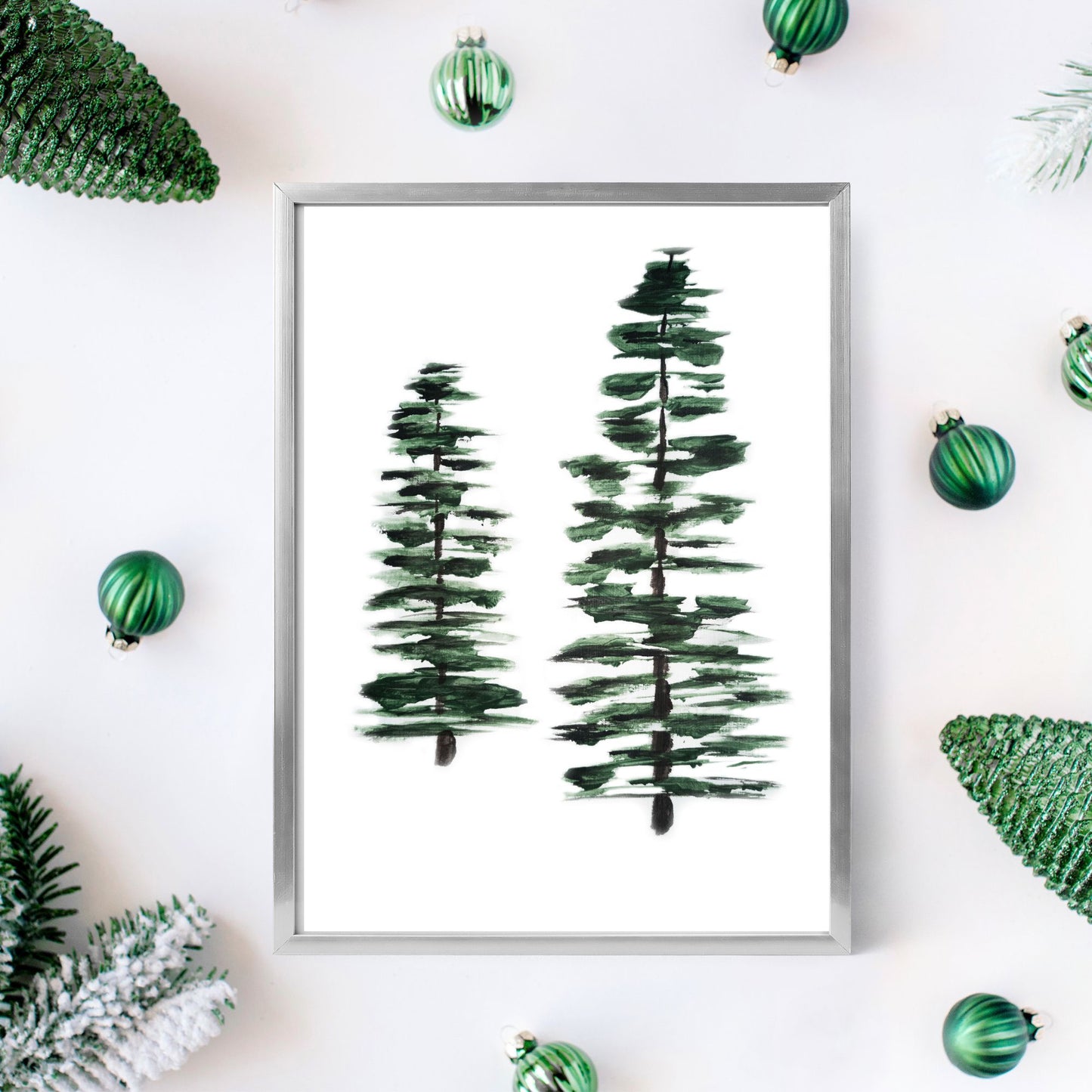 Her har jeg malt to grantrær med akrylmaling, i mørke grønnfarger. Minimalistisk julestemning!