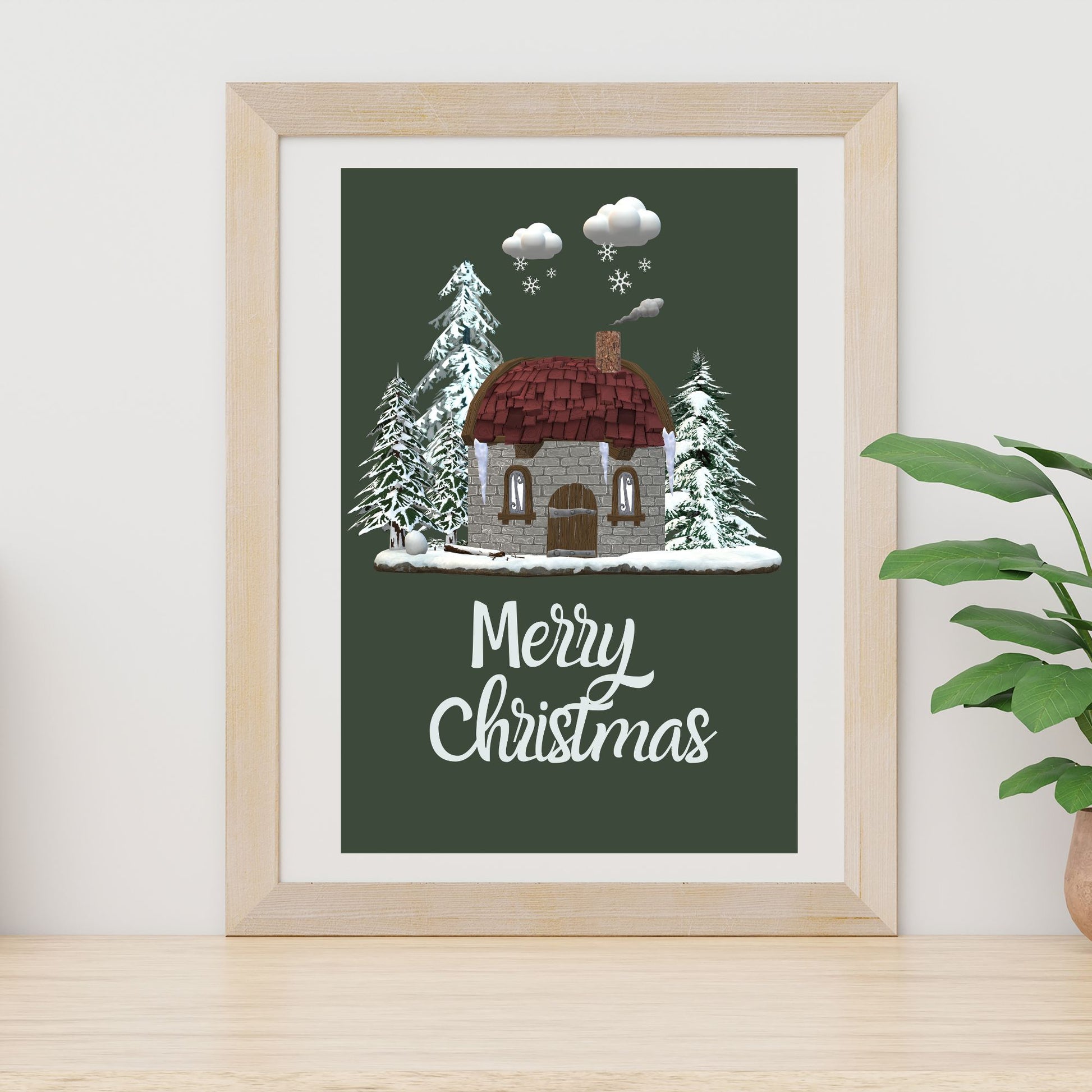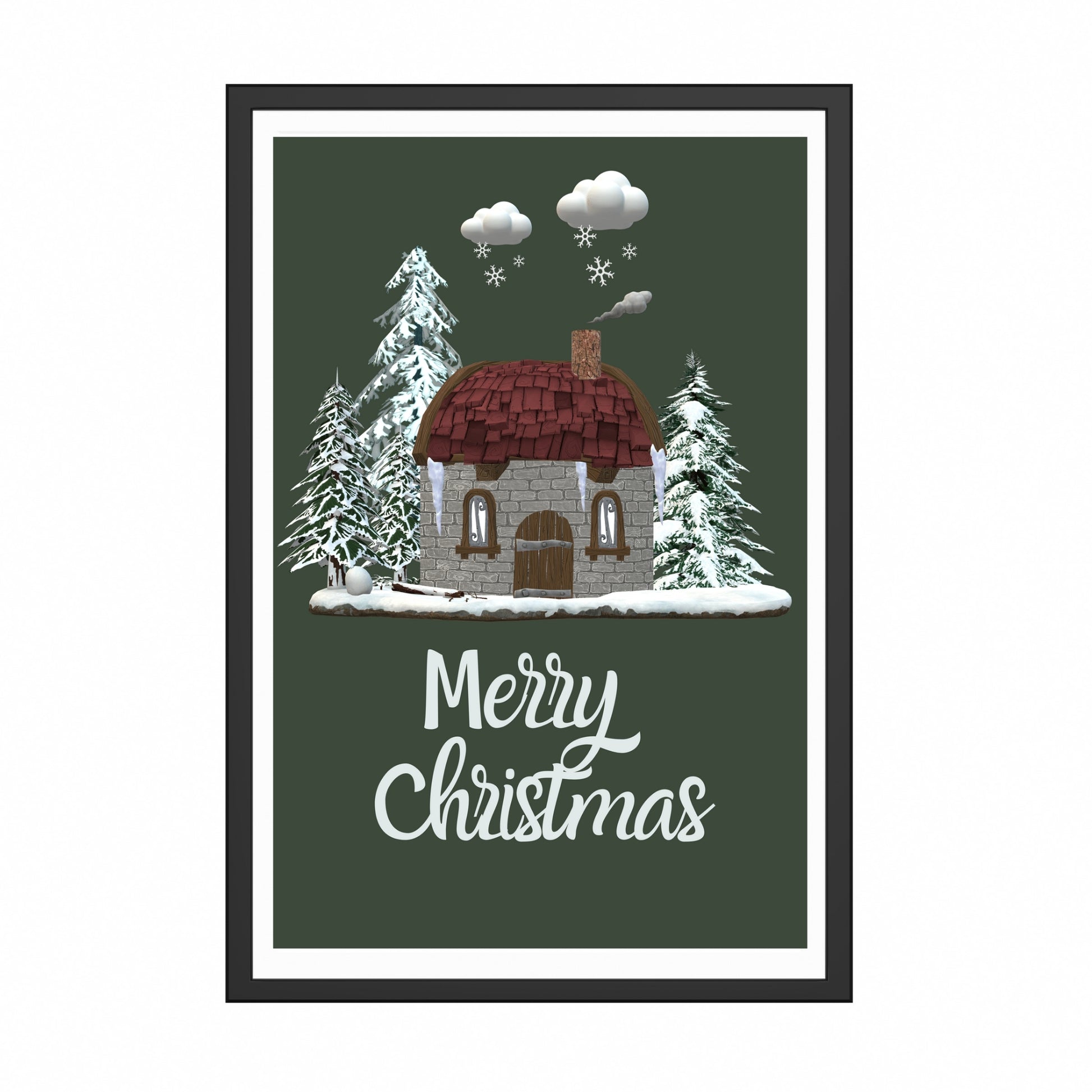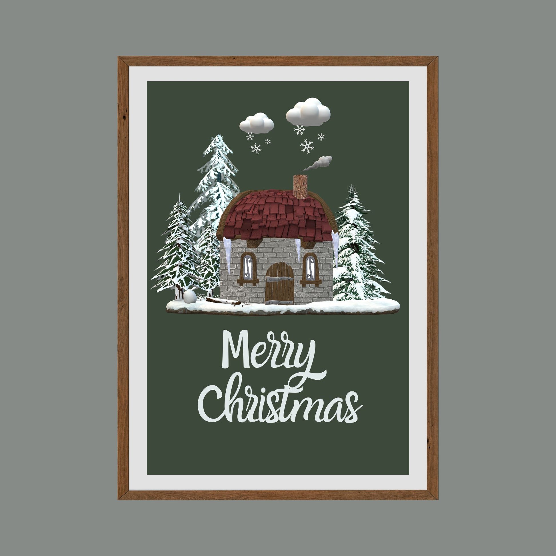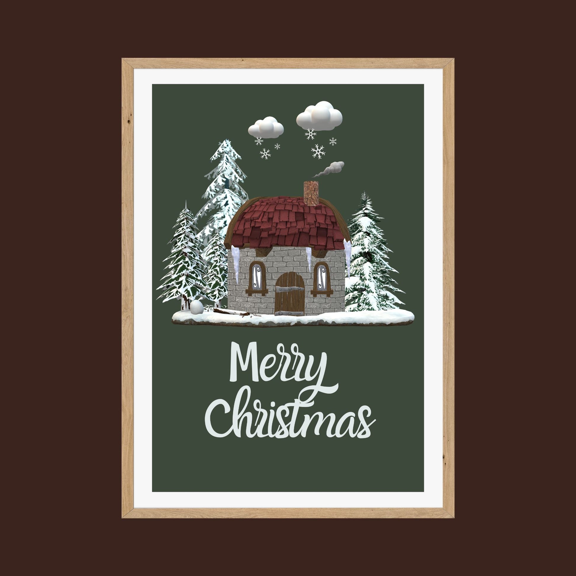 Her har jeg laget julenissens hus digitalt med teksten "Merry Christmas".