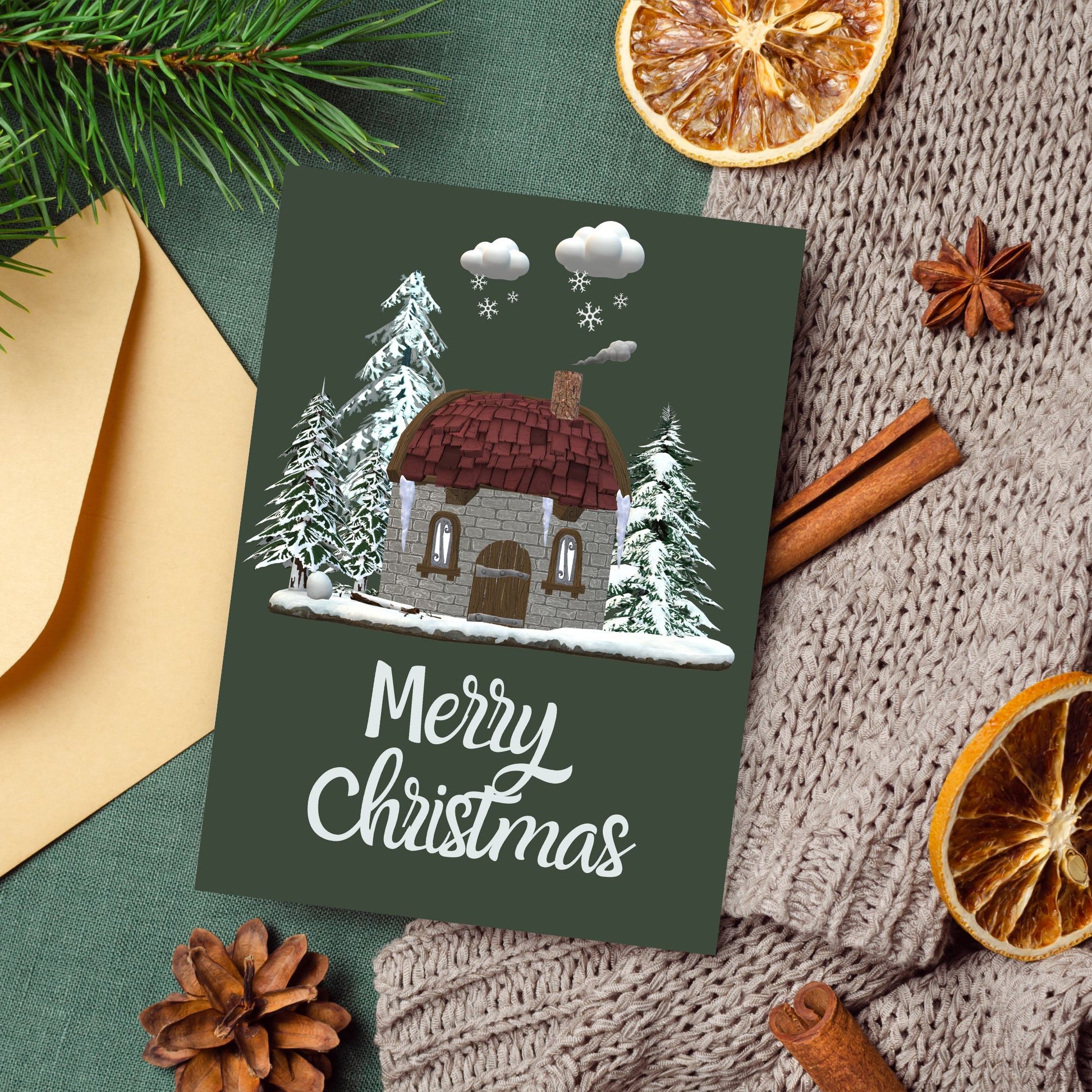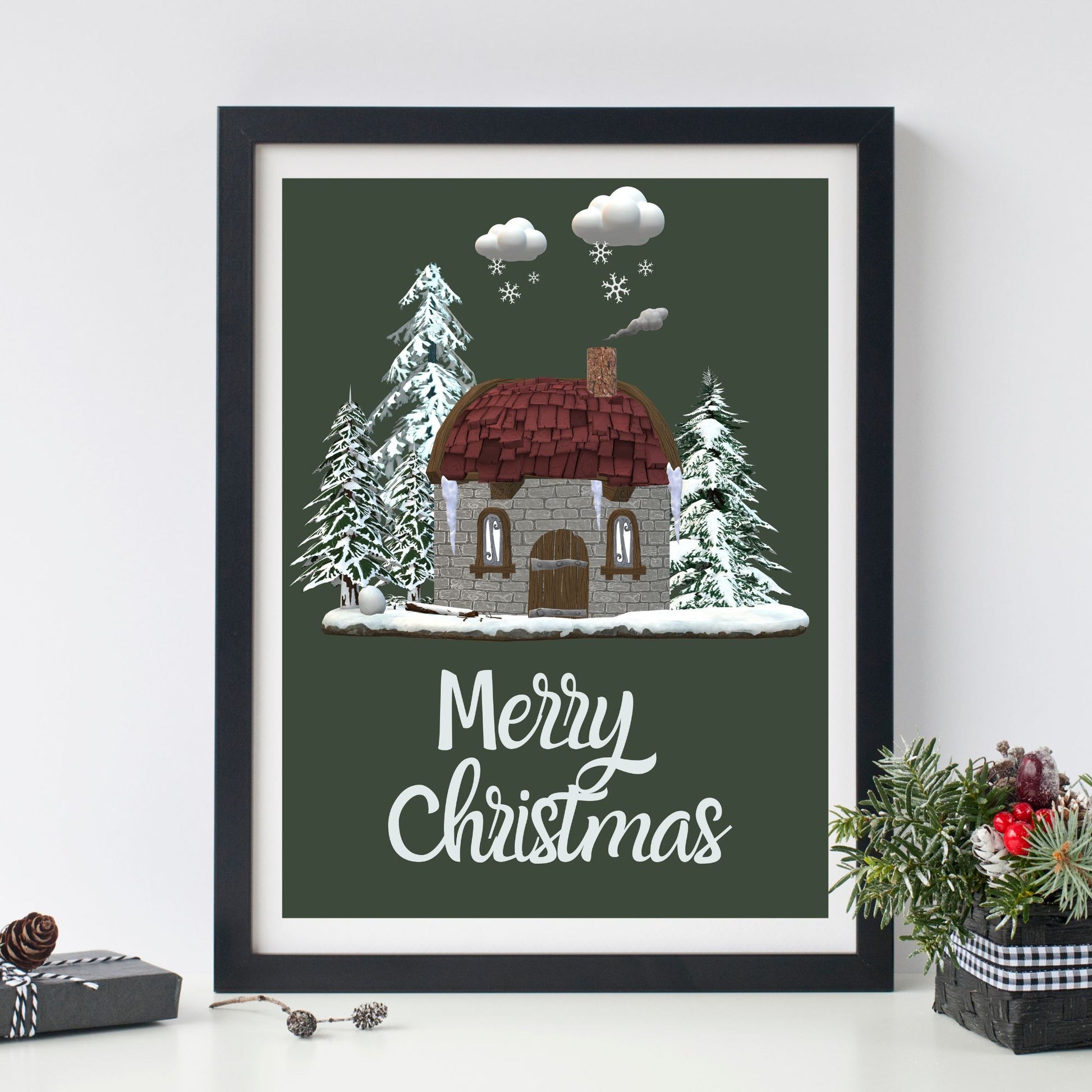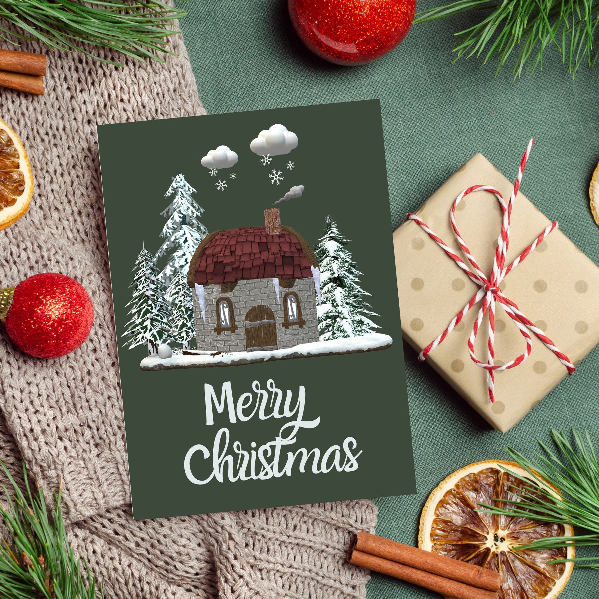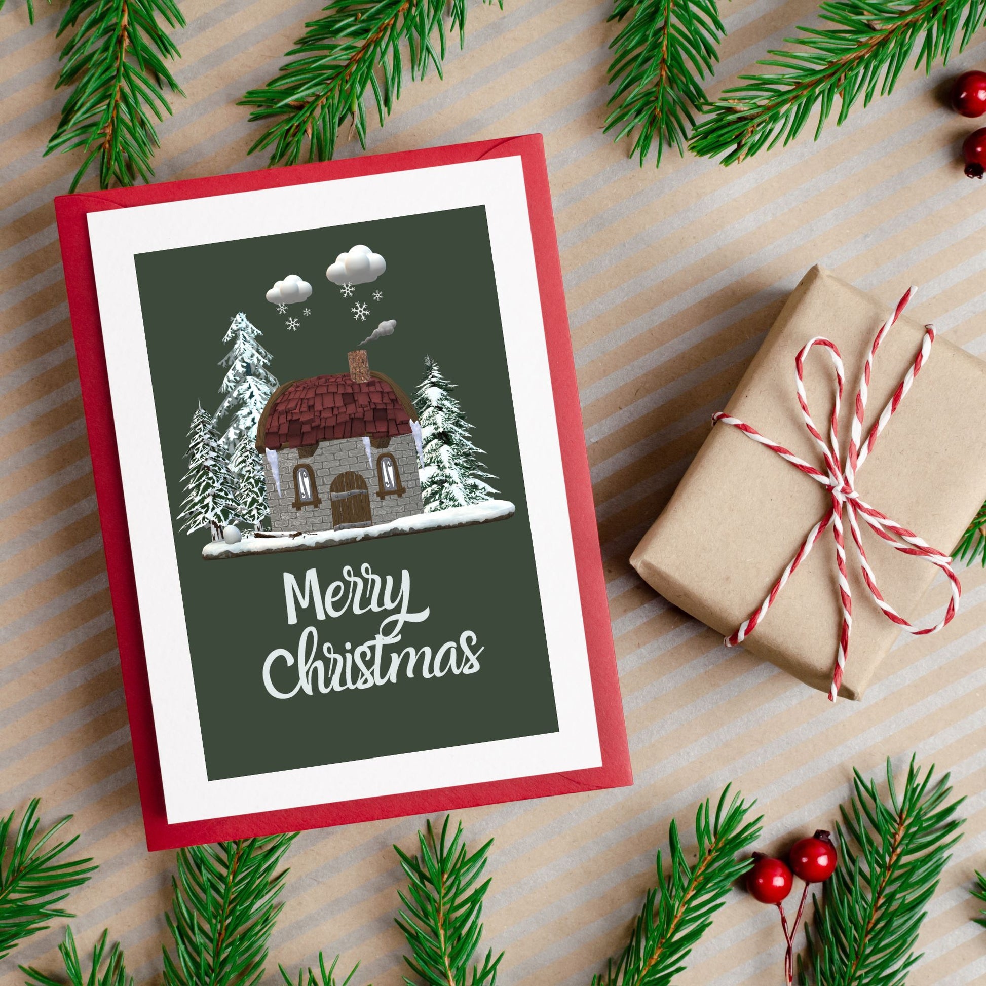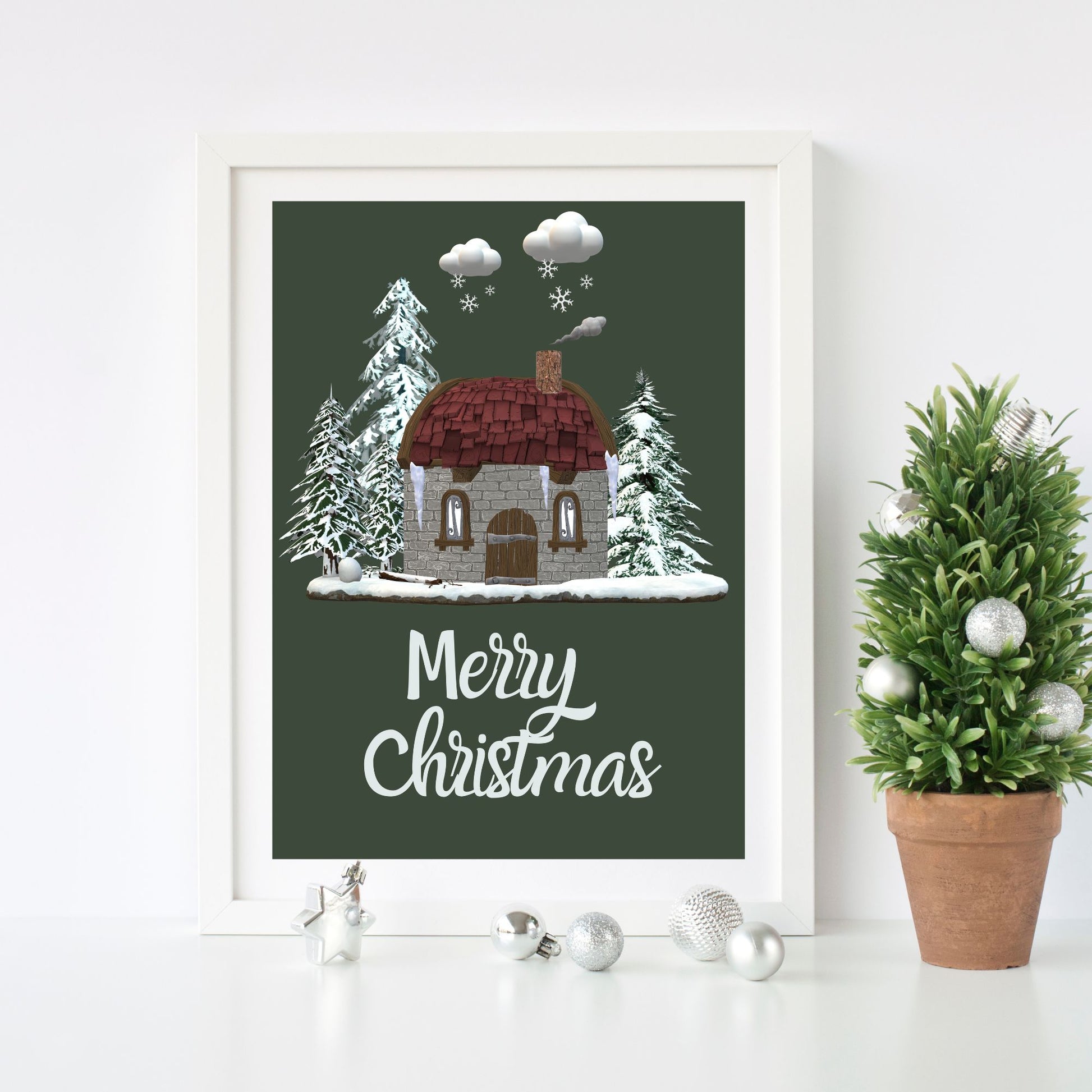 Her har jeg laget julenissens hus digitalt med teksten "Merry Christmas".
