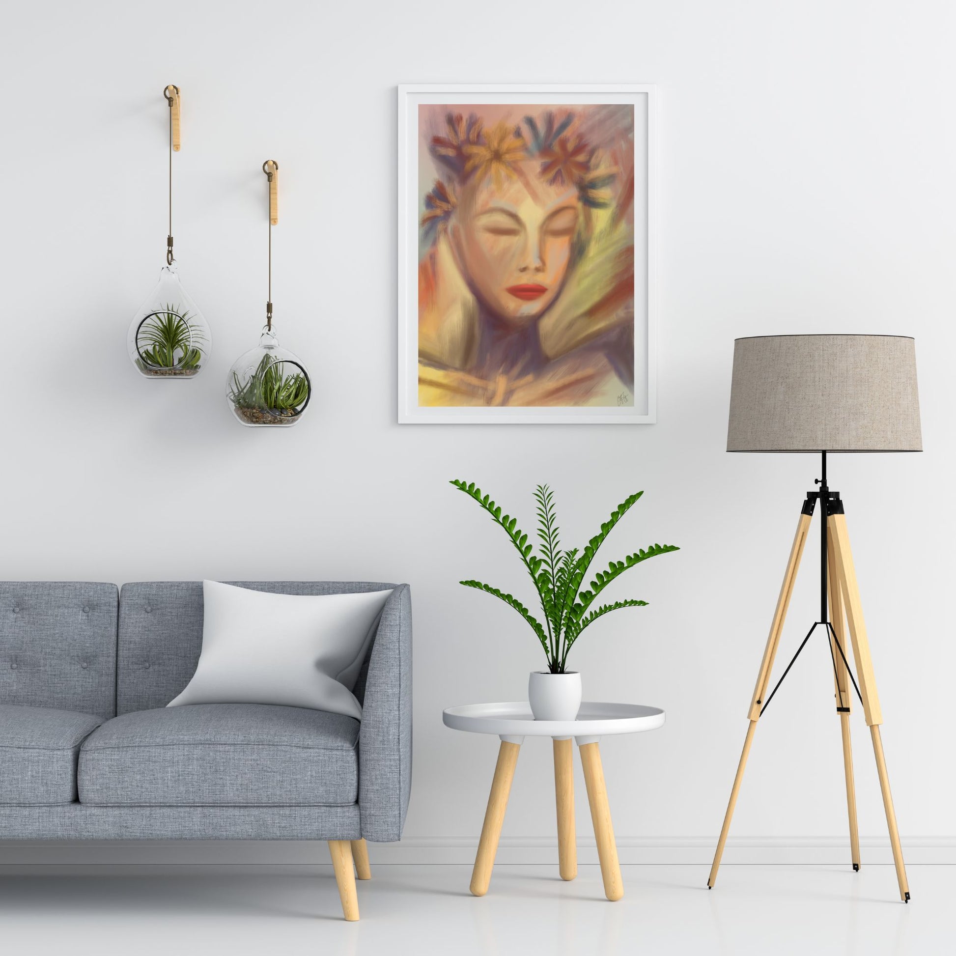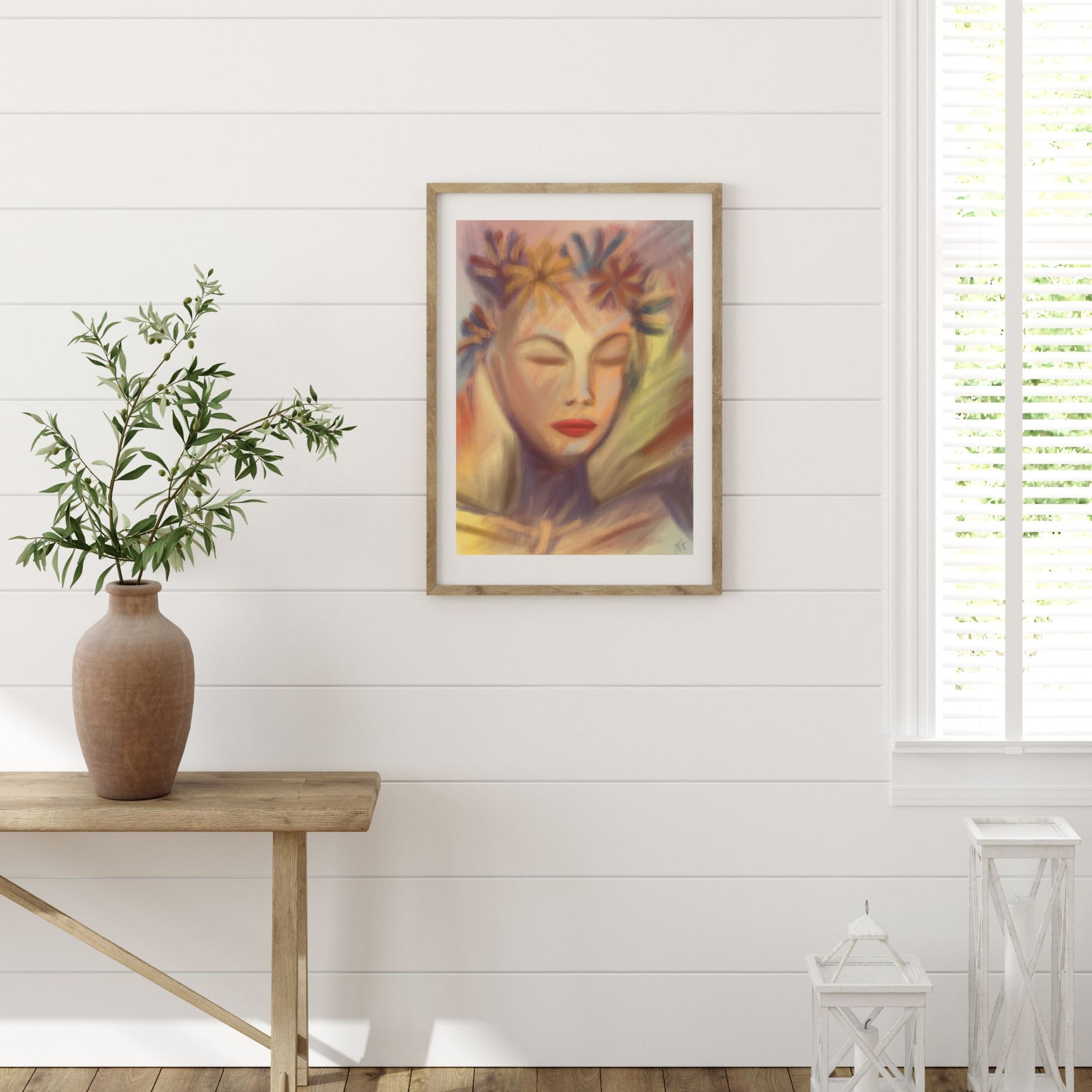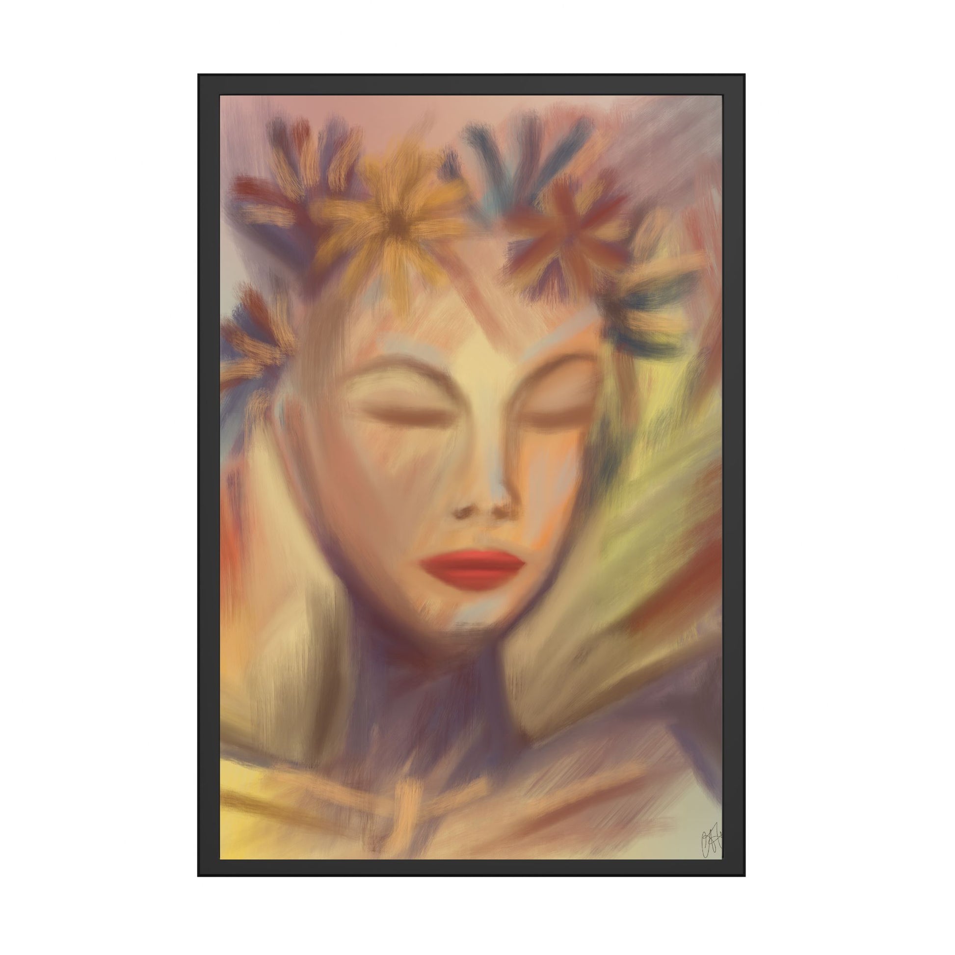 Her har jeg malt en eksotisk kvinne med blomster i håret og røde lepper.
