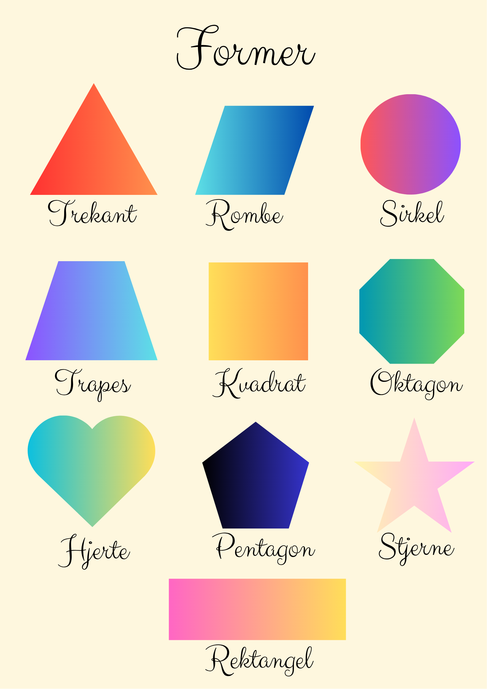 Denne nydelige læringsplakaten kombinerer klare geometriske figurer med lekne farger og dekorativ skrift – perfekt for å lære barn navn og utseende på ulike former.