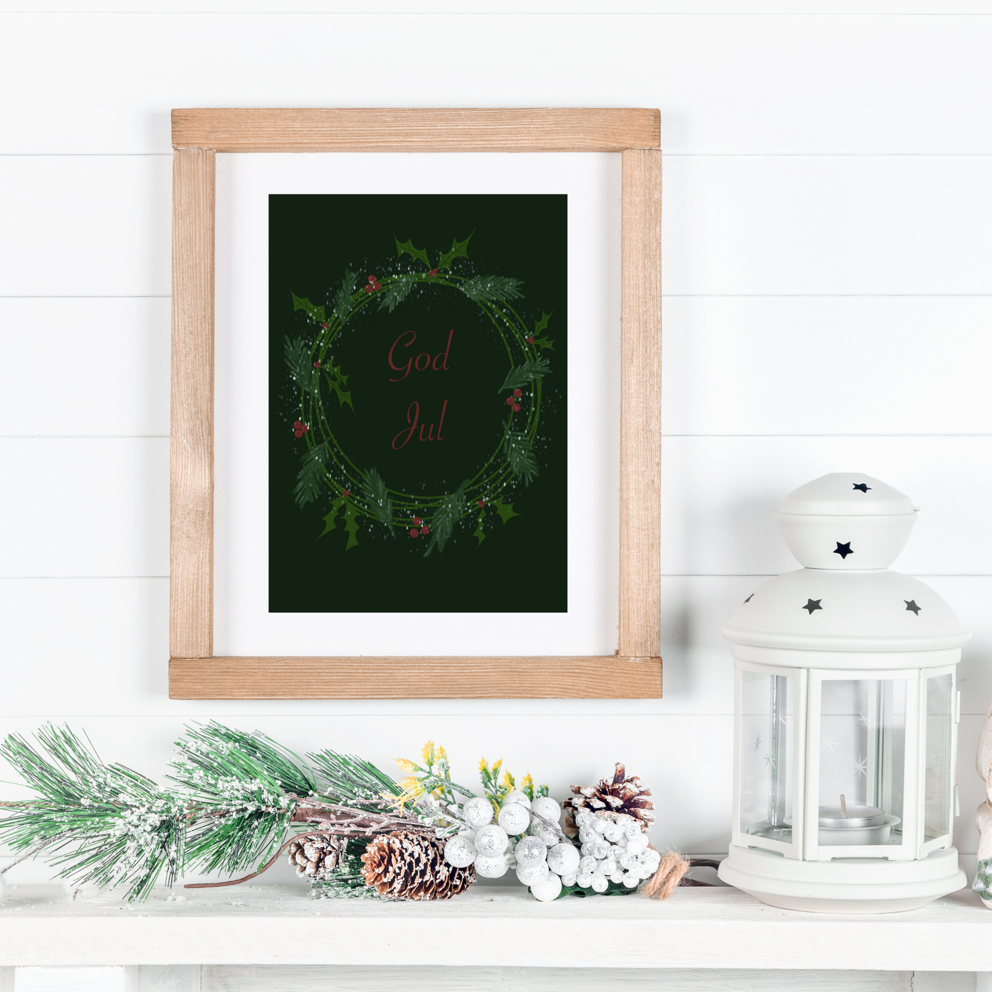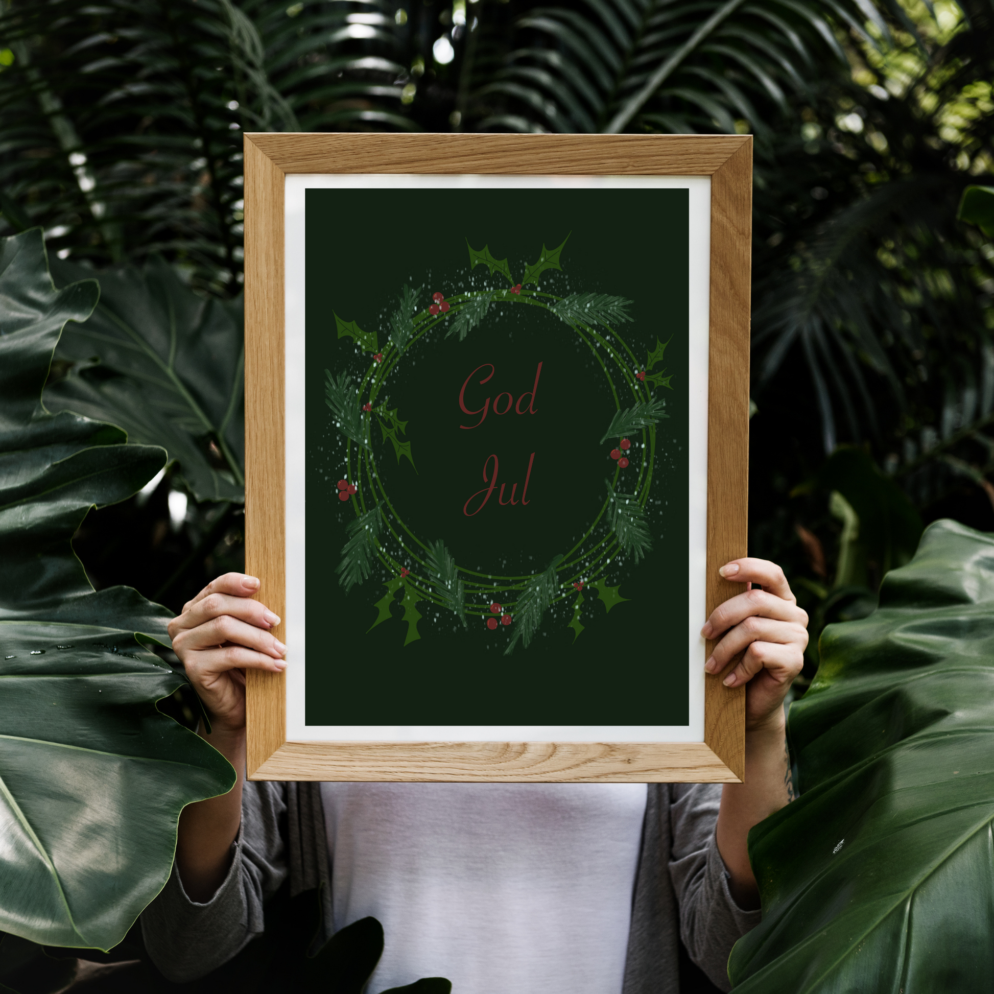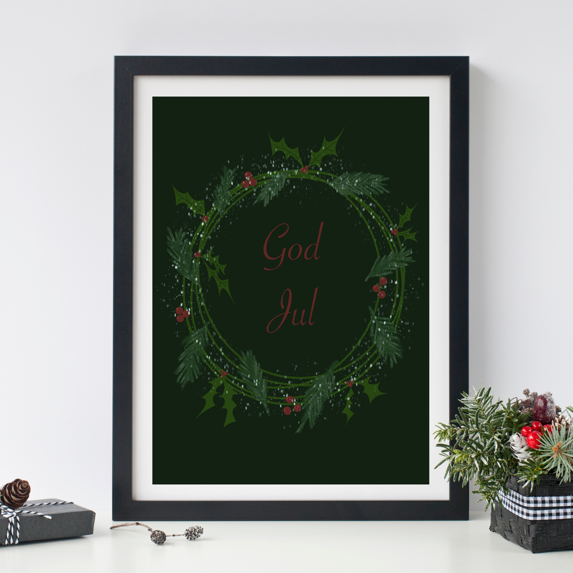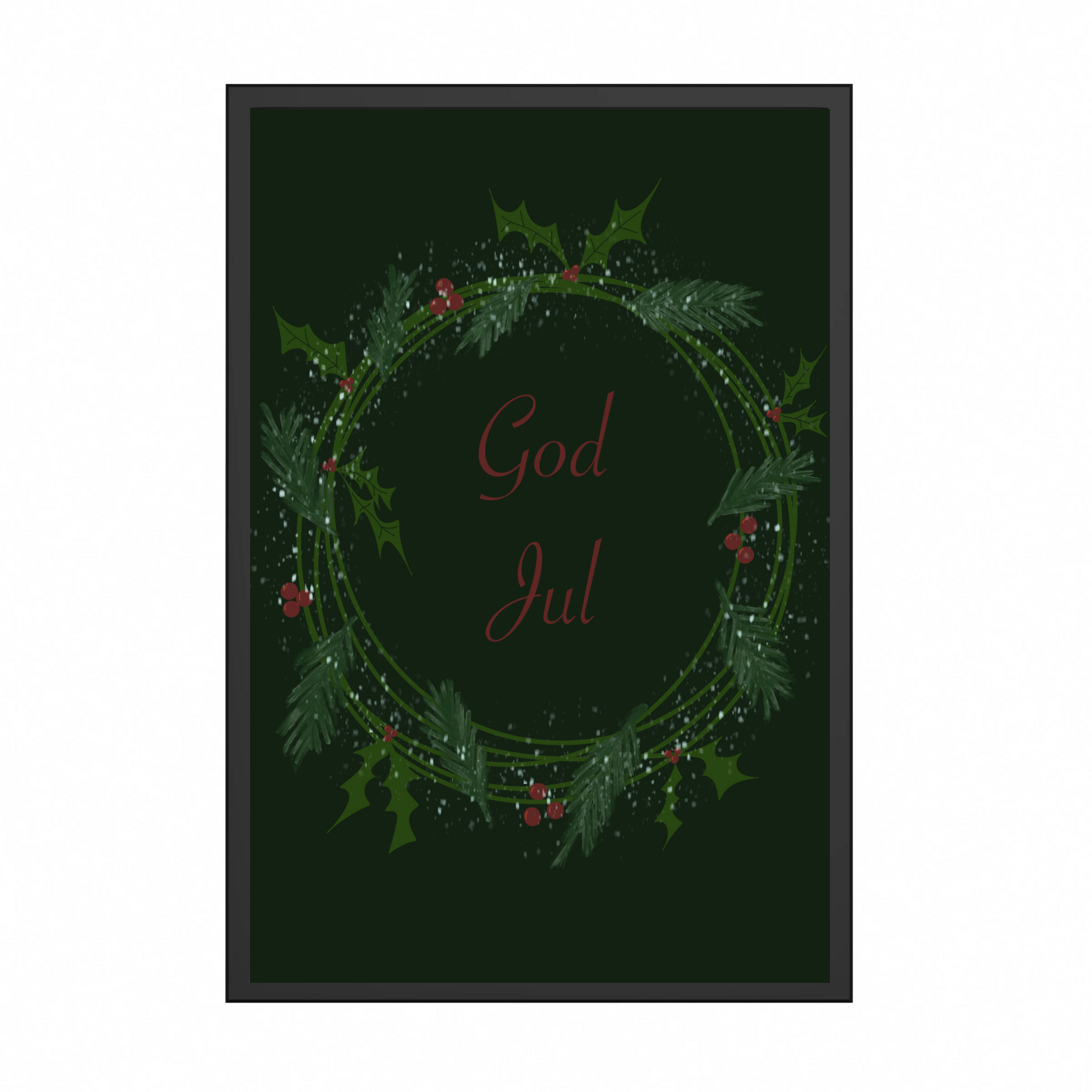 Her har jeg malt en julekrans med deilig nysnø på og teksten God Jul inni. Mørk grønn bakgrunn.
