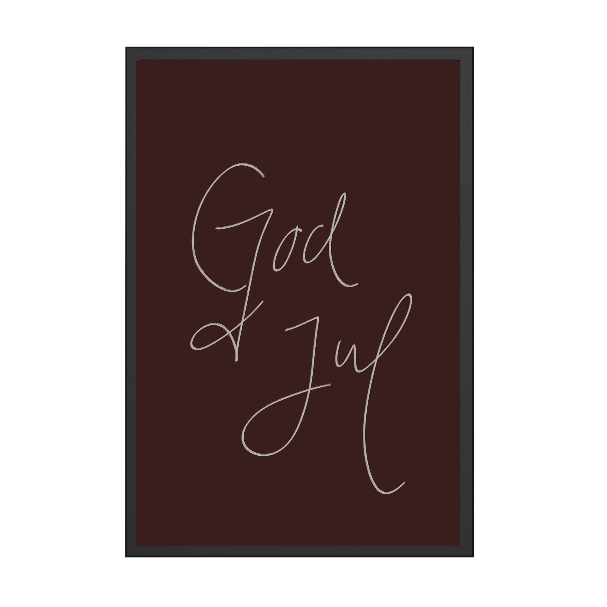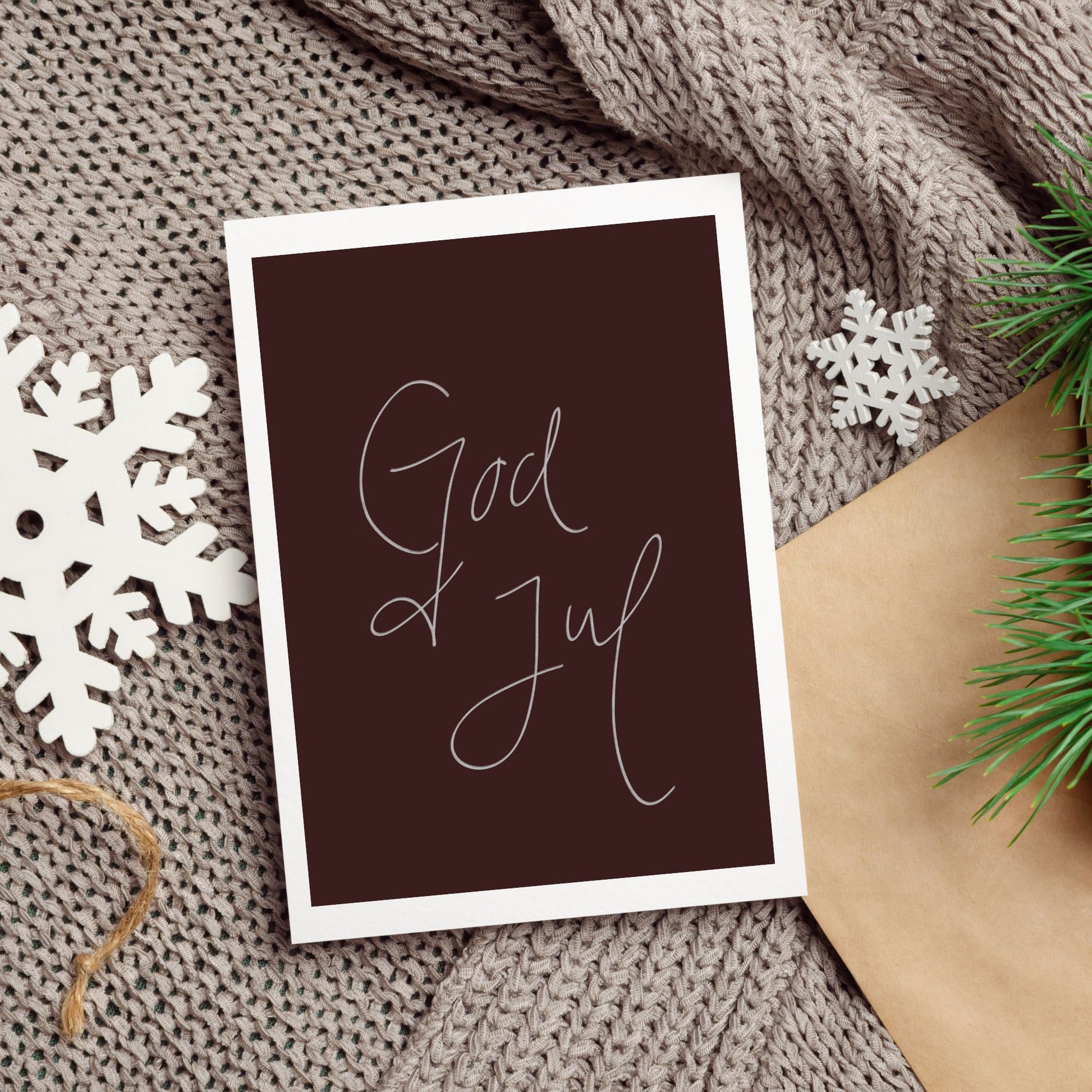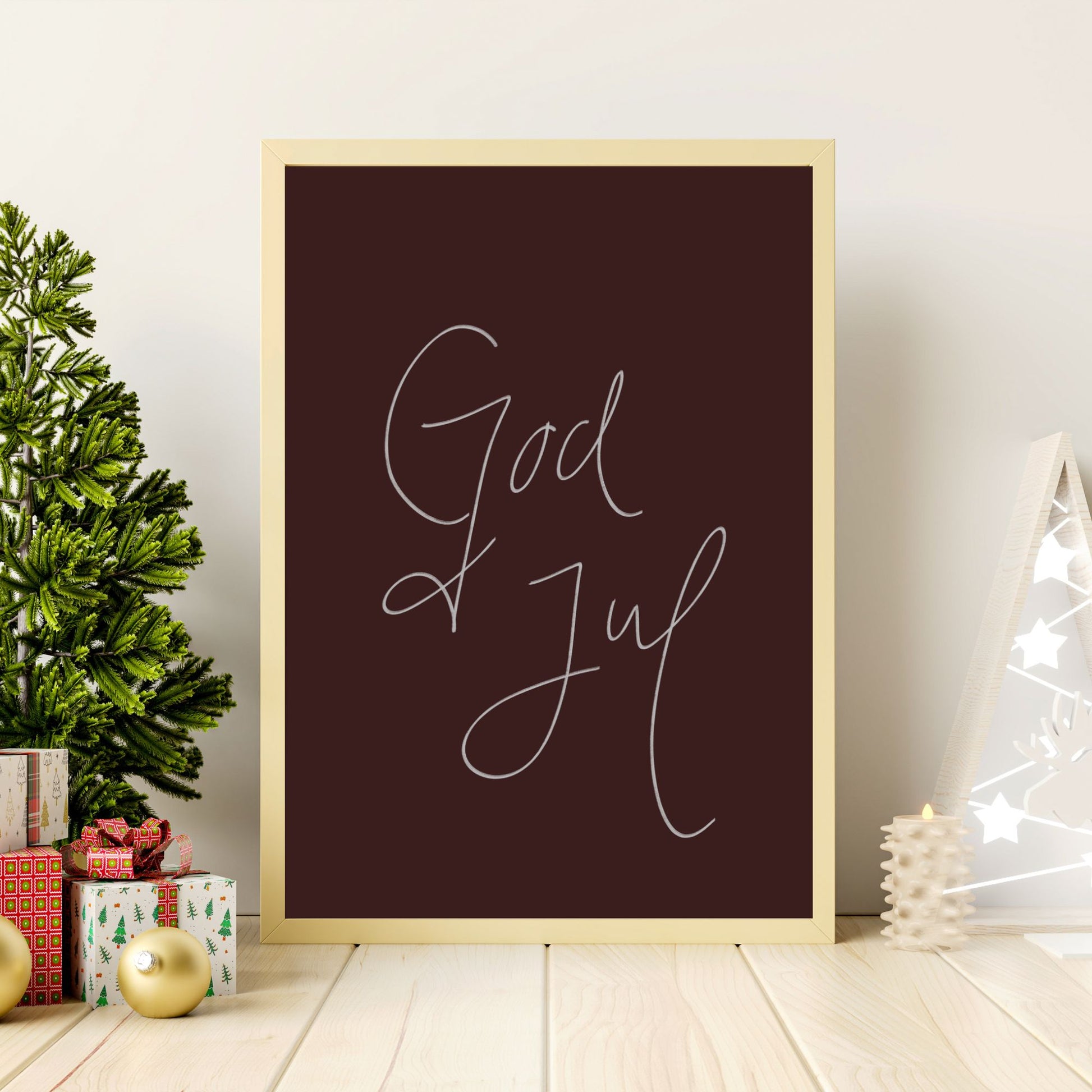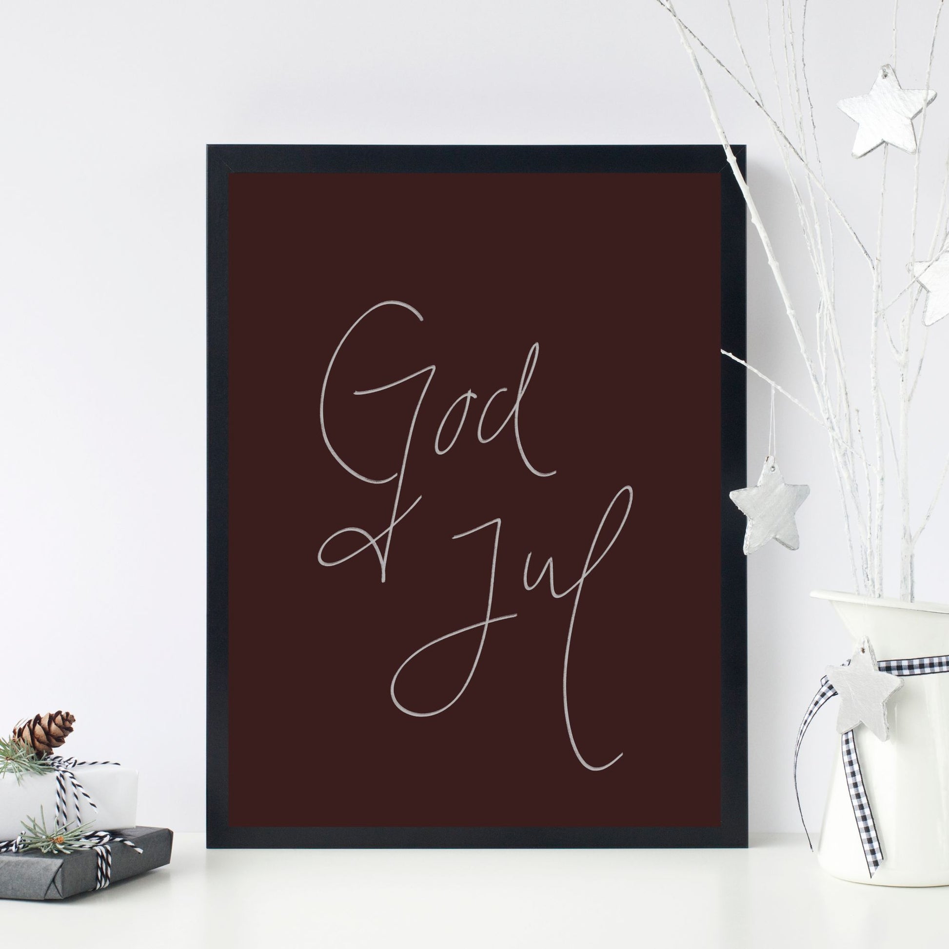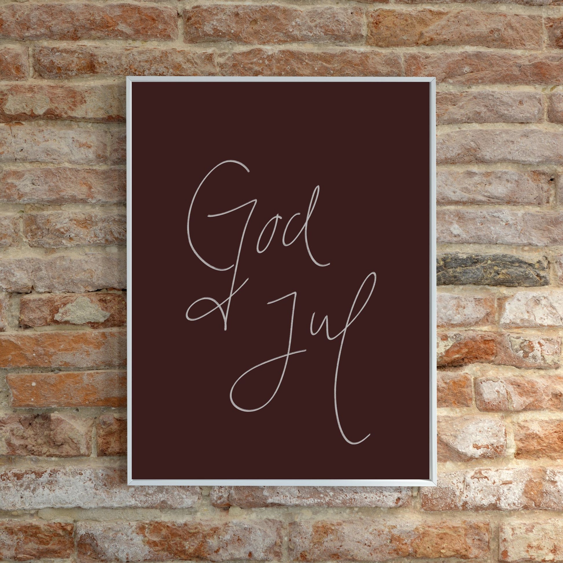 Her har jeg skrevet GOD JUL for hånd på en dyp rød bakgrunn.