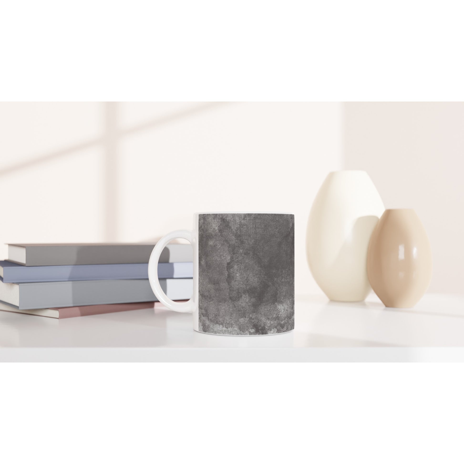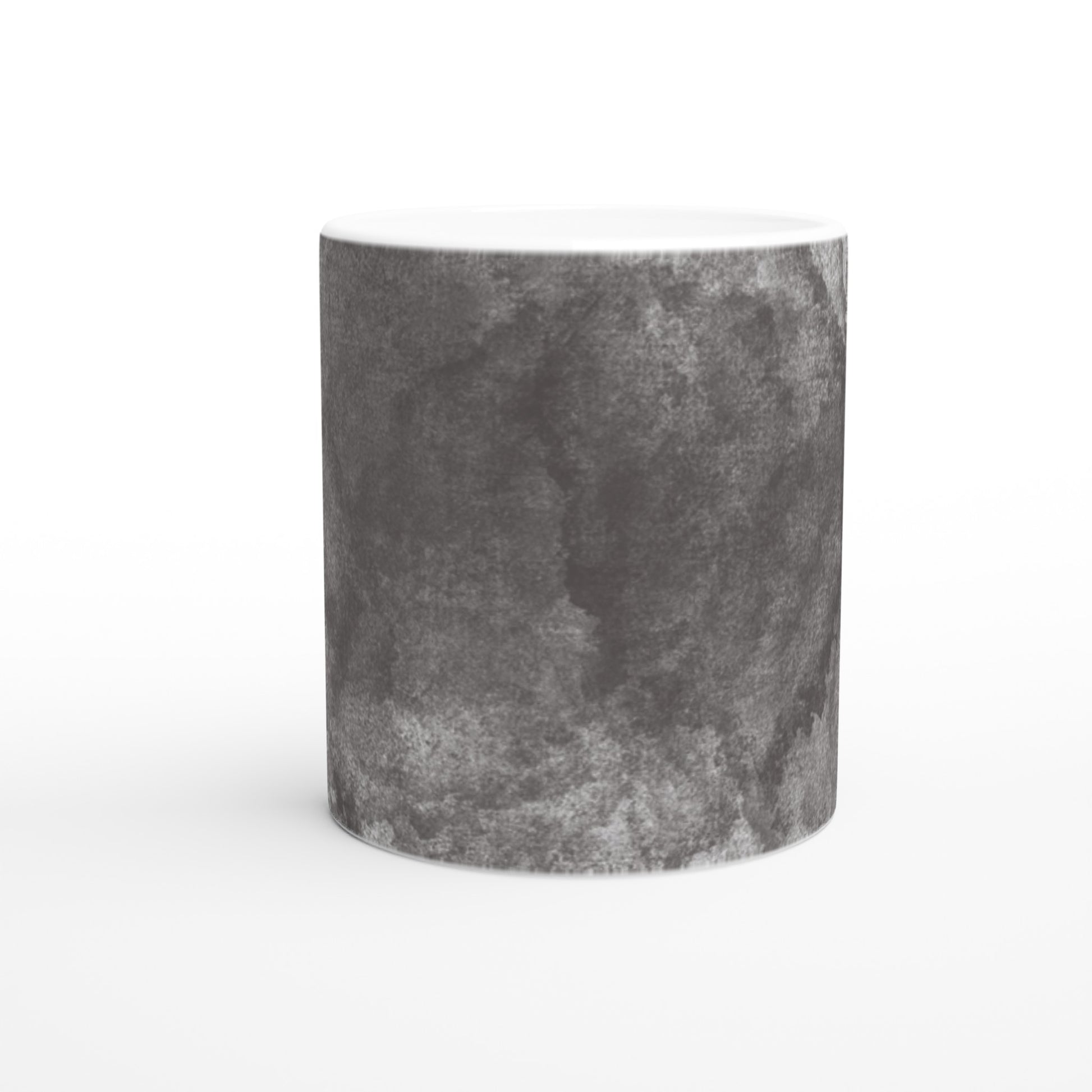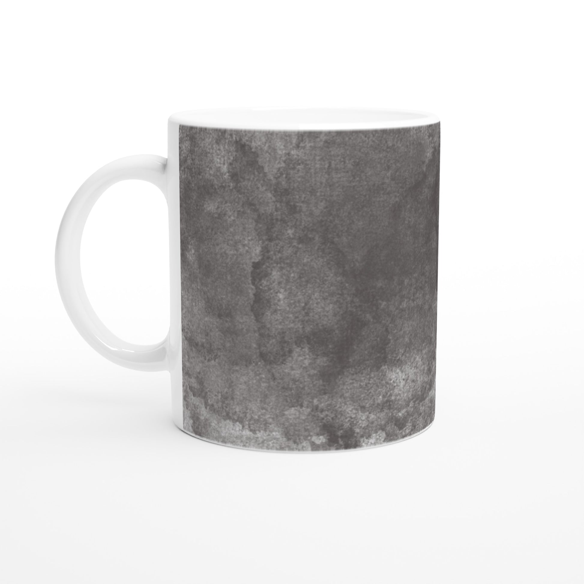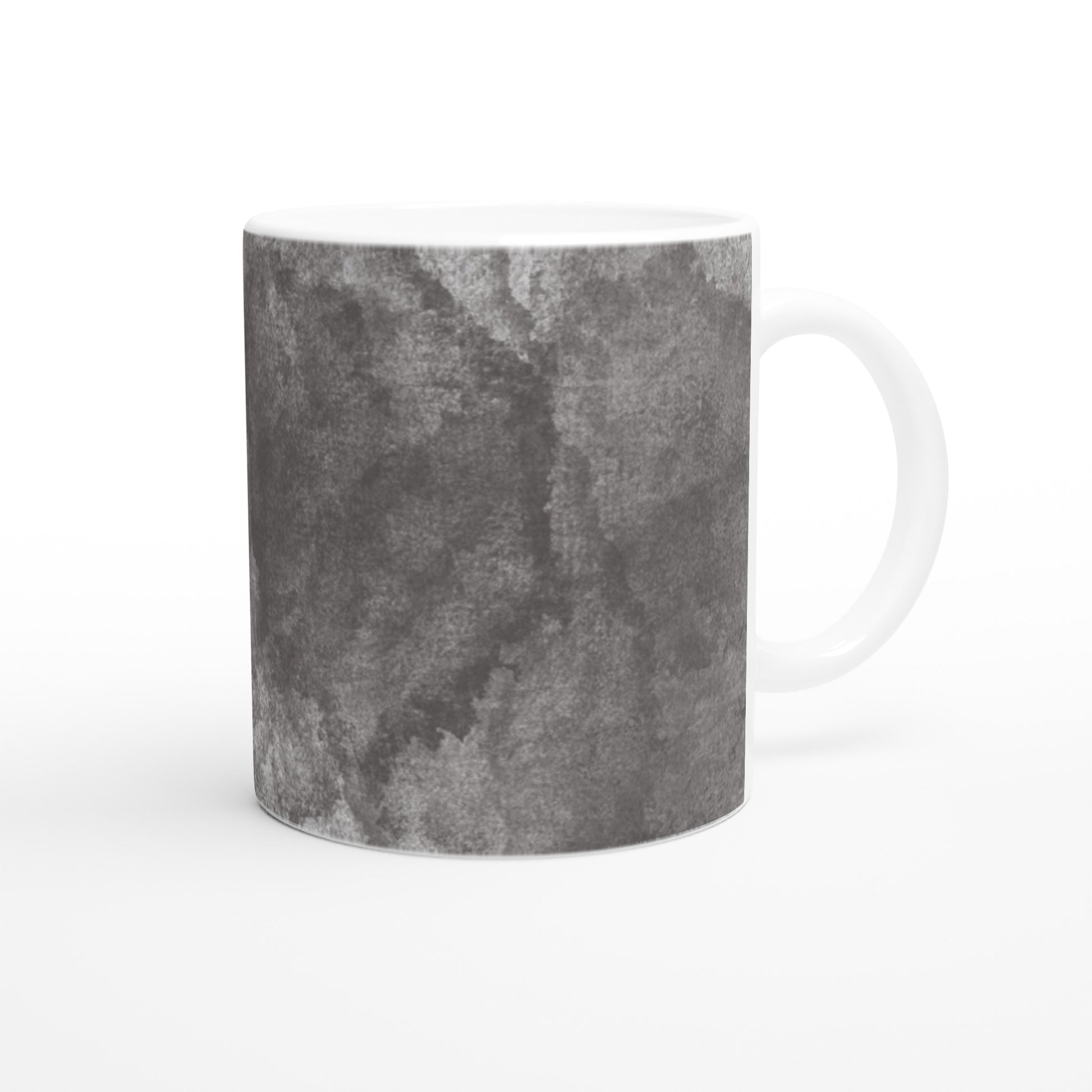 Denne koppen er laget av keramikk, har hvit basefarge og er trykket med egendesignet motiv i mørk grå farge. Den har blank glasering, som får designet til å stikke seg enda bedre frem. Trykket holder seg like fint, selv etter oppvarming i mikrobølgeovn og vask i oppvaskmaskin.