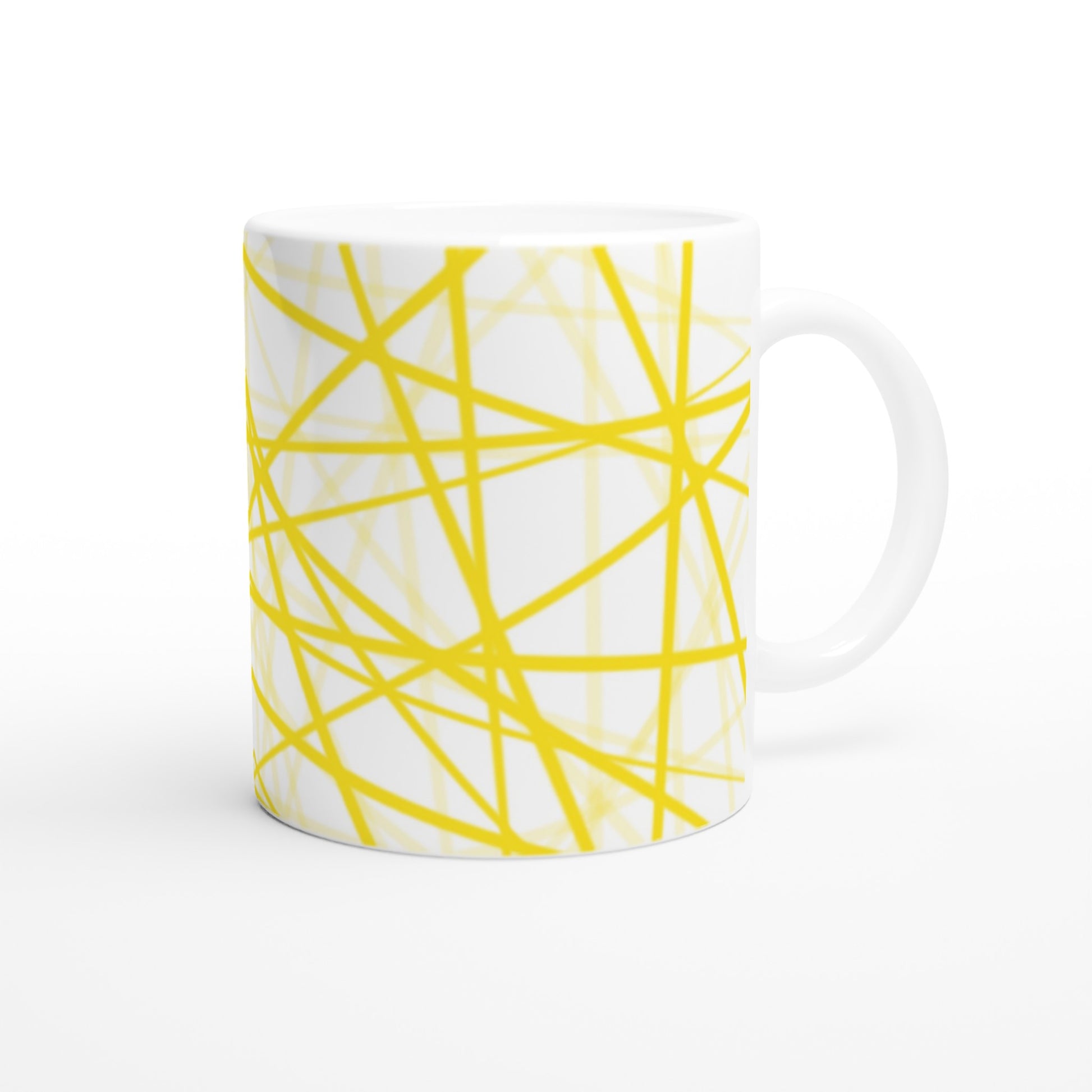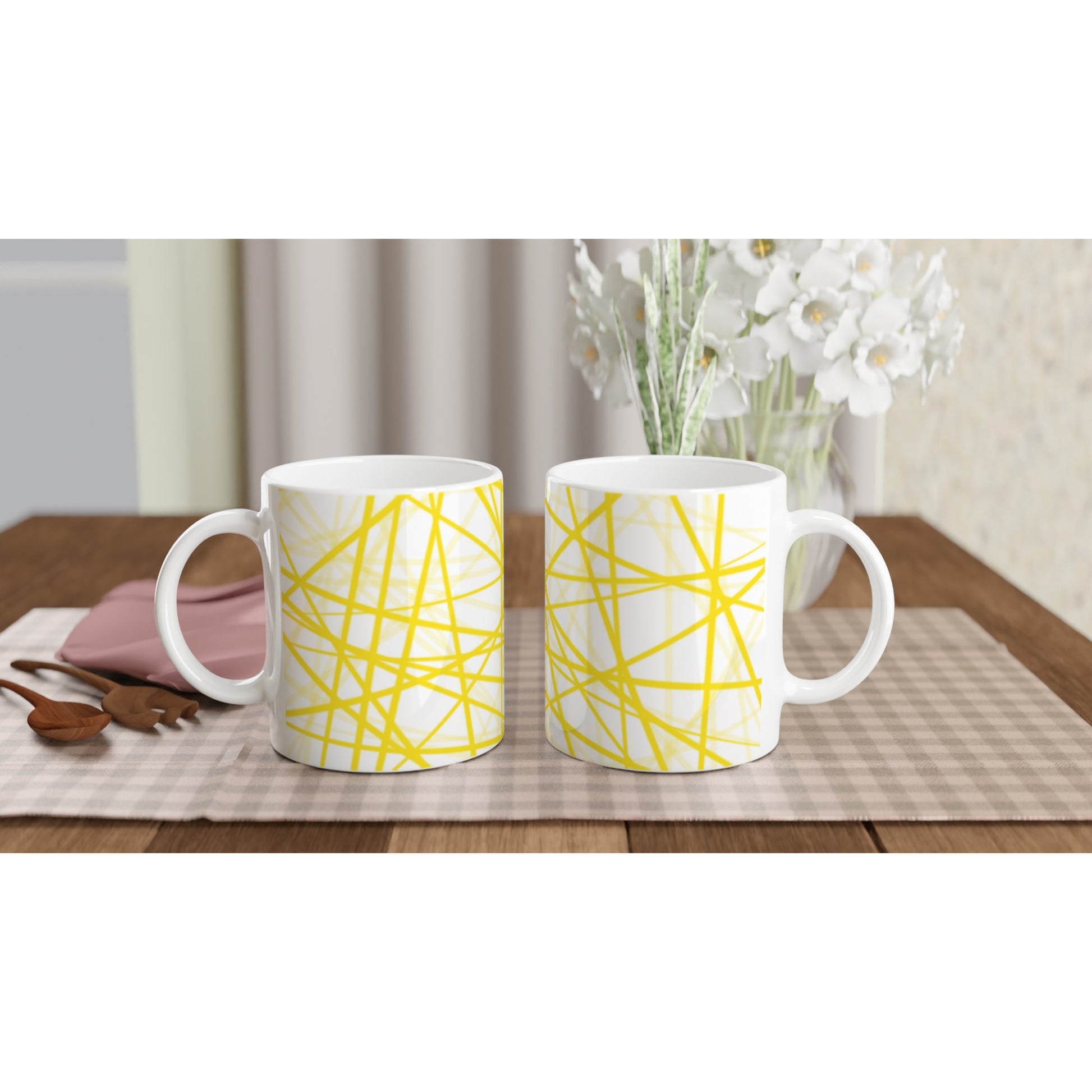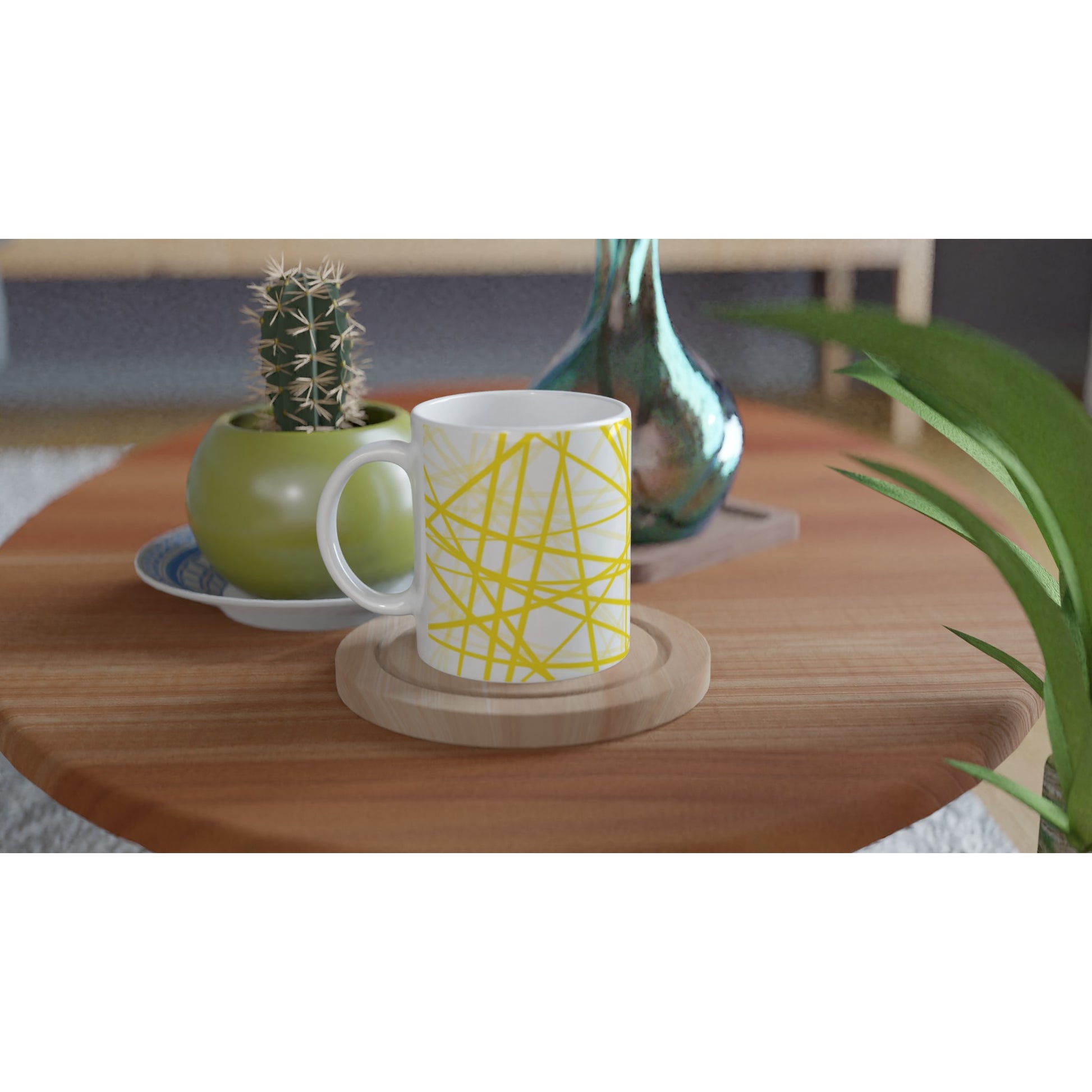 Denne koppen er laget av keramikk, har hvit basefarge og er trykket med egendesignet motiv i en nydelig gulfarge. Den har blank glasering, som får designet til å stikke seg enda bedre frem. Trykket holder seg like fint, selv etter oppvarming i mikrobølgeovn og vask i oppvaskmaskin.