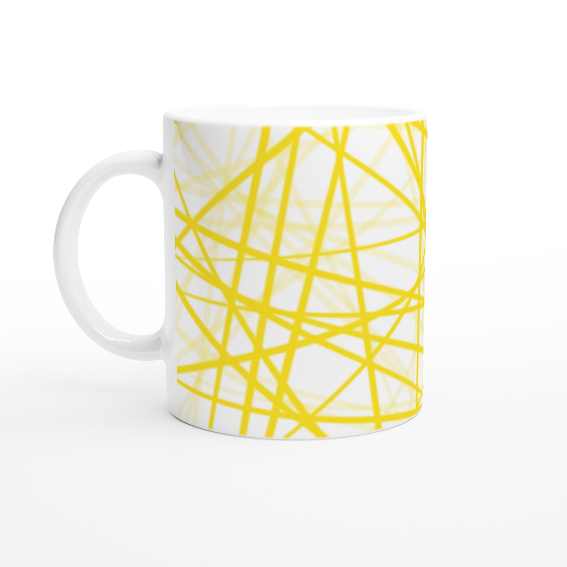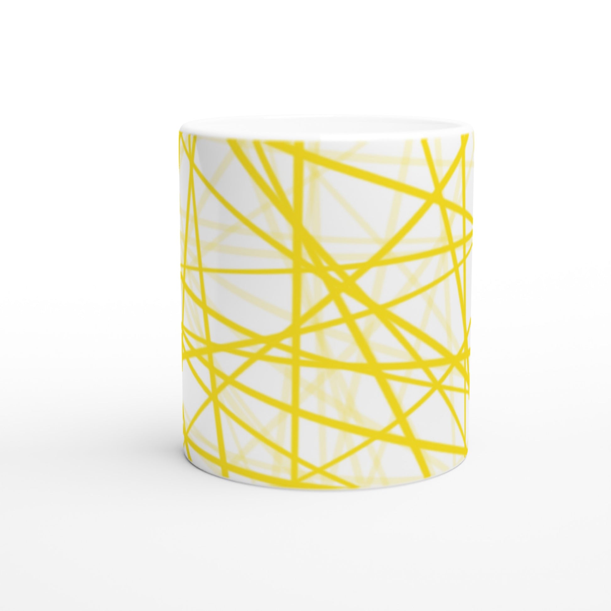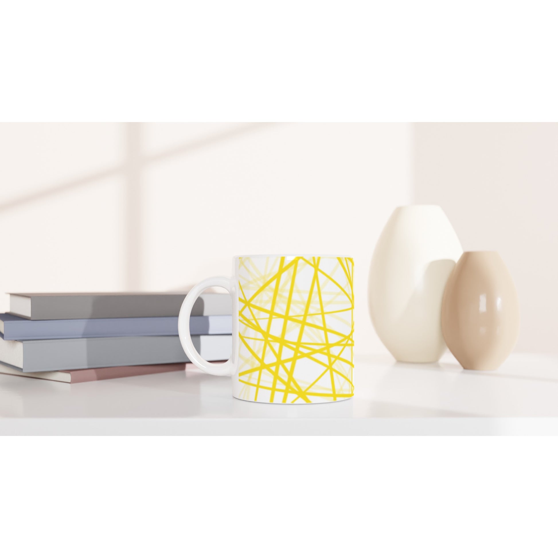 Denne koppen er laget av keramikk, har hvit basefarge og er trykket med egendesignet motiv i en nydelig gulfarge. Den har blank glasering, som får designet til å stikke seg enda bedre frem. Trykket holder seg like fint, selv etter oppvarming i mikrobølgeovn og vask i oppvaskmaskin.