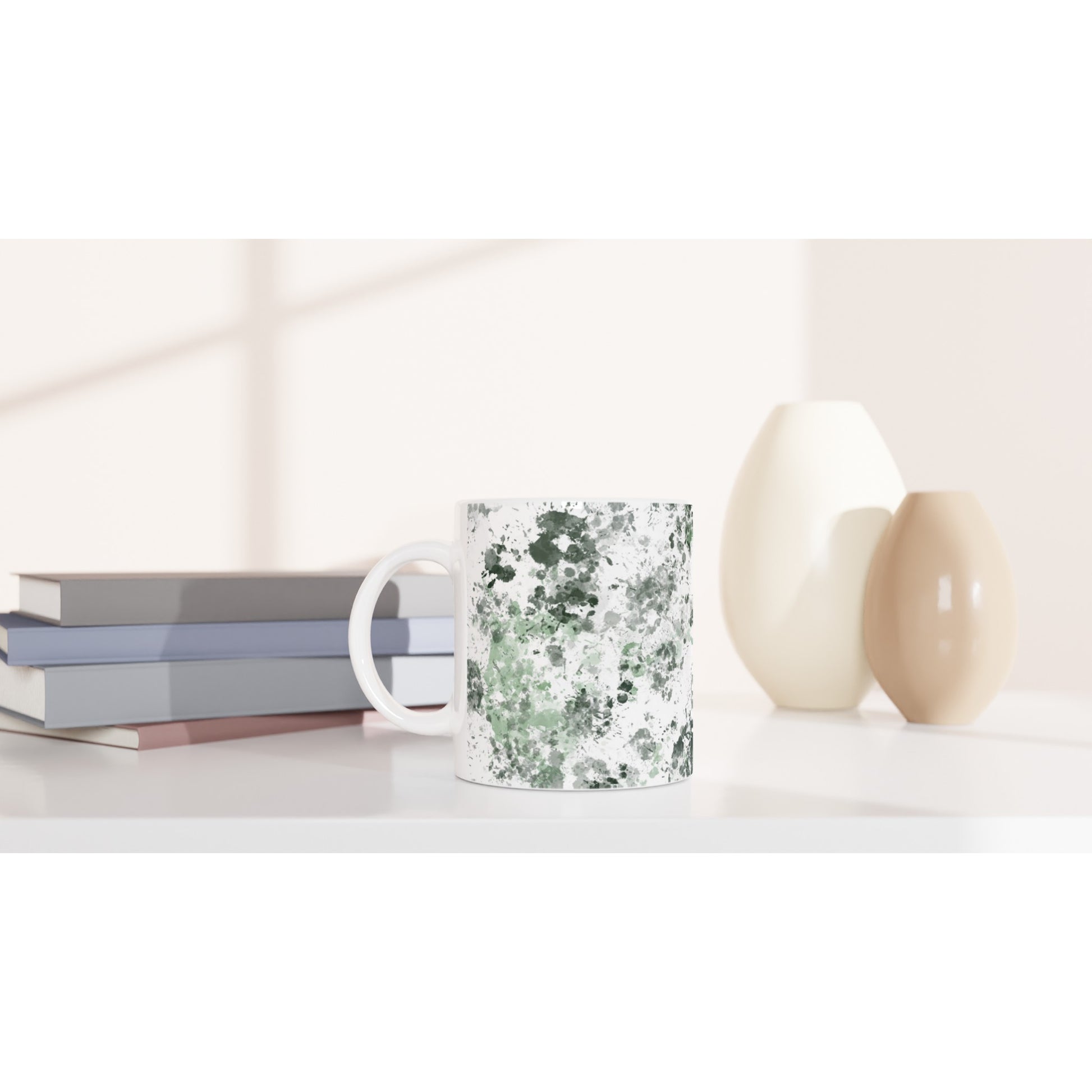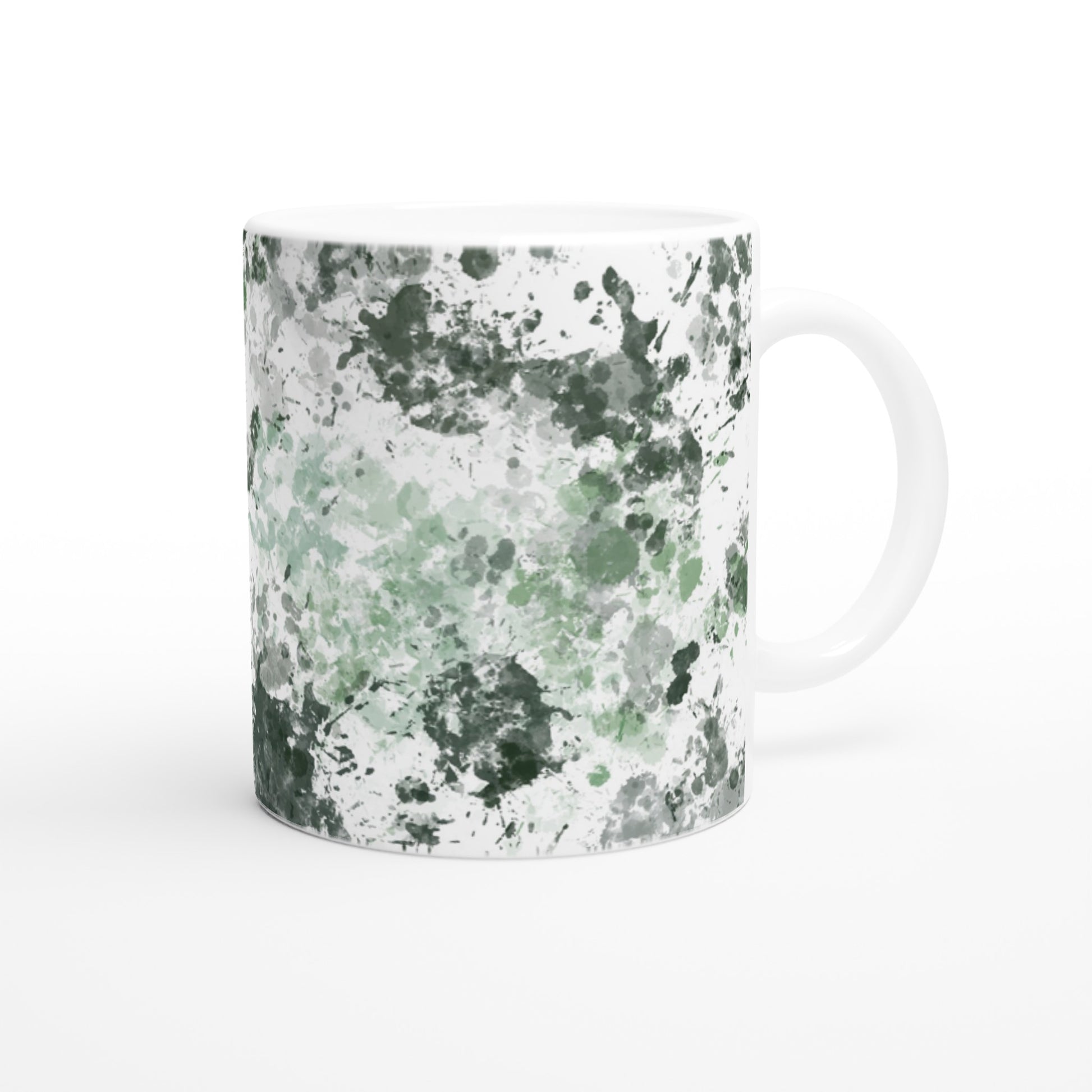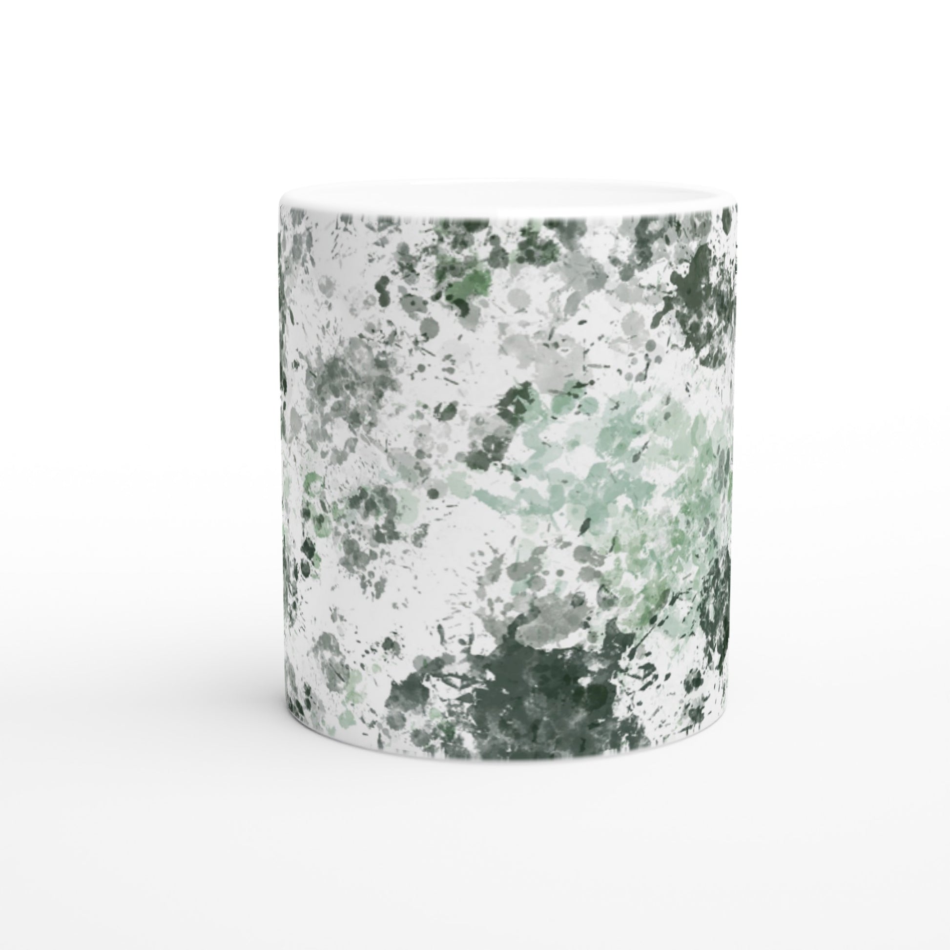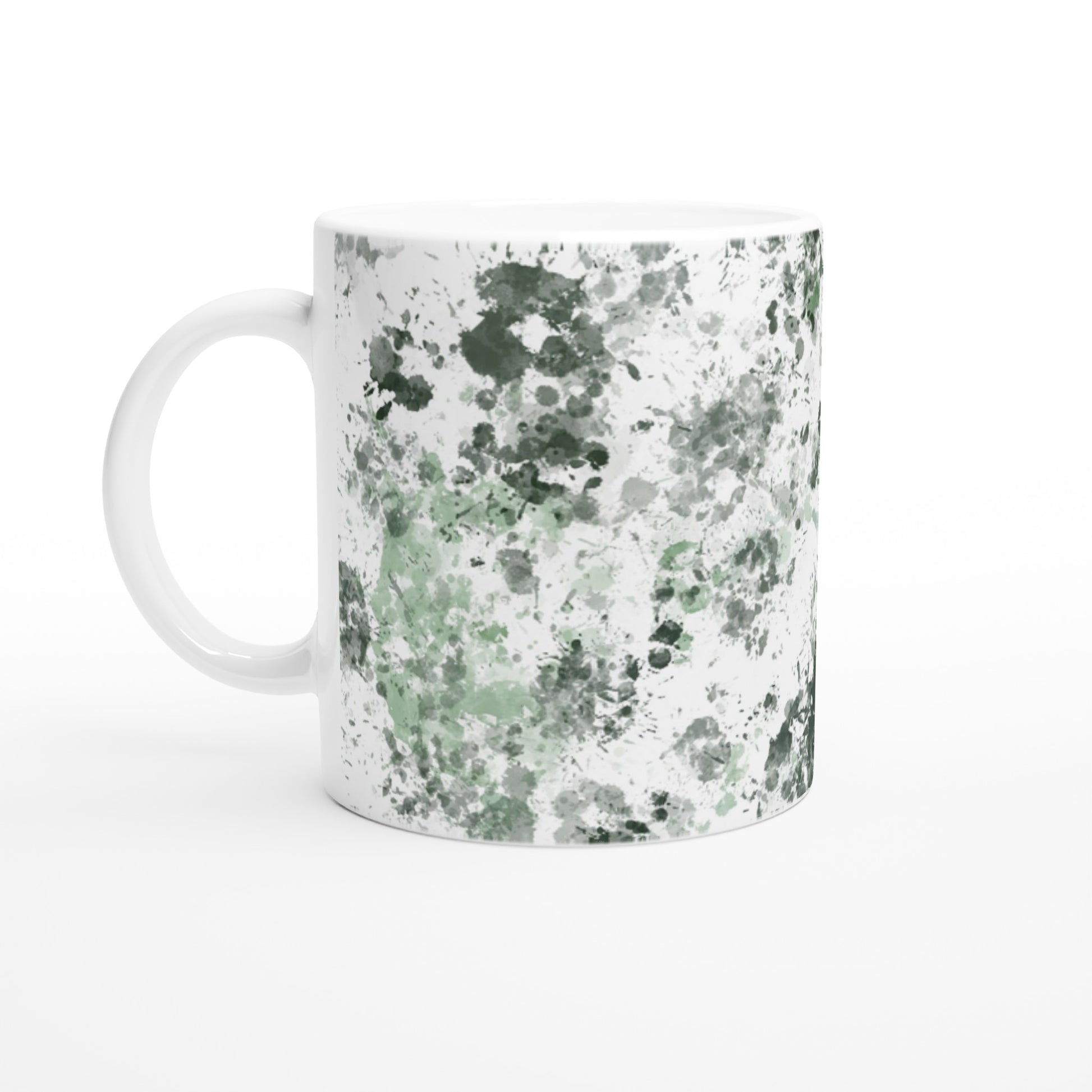 Denne koppen er laget av keramikk, har hvit basefarge og er trykket med egendesignet motiv i nydelige grønnfarge. Den har blank glasering, som får designet til å stikke seg enda bedre frem. Trykket holder seg like fint, selv etter oppvarming i mikrobølgeovn og vask i oppvaskmaskin.