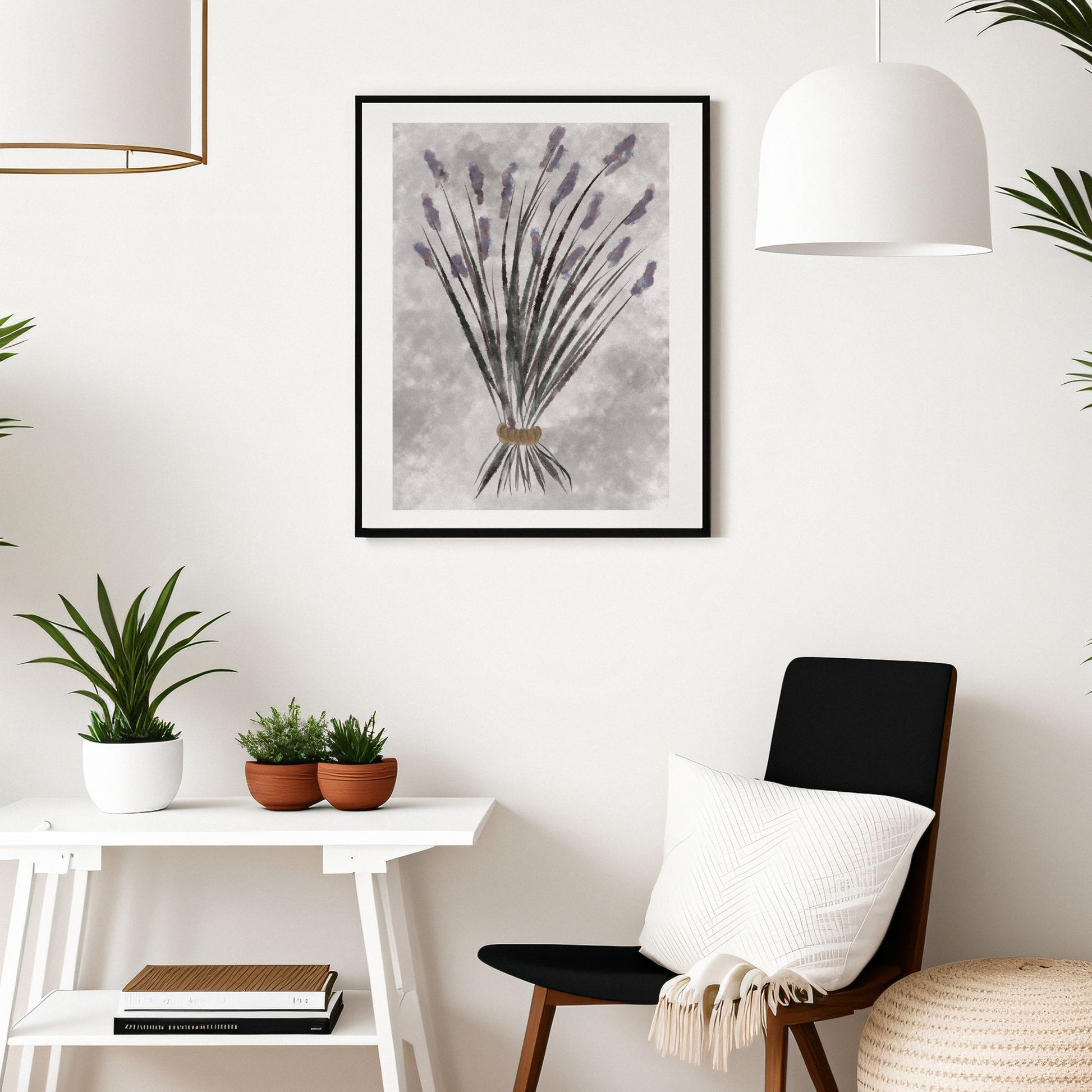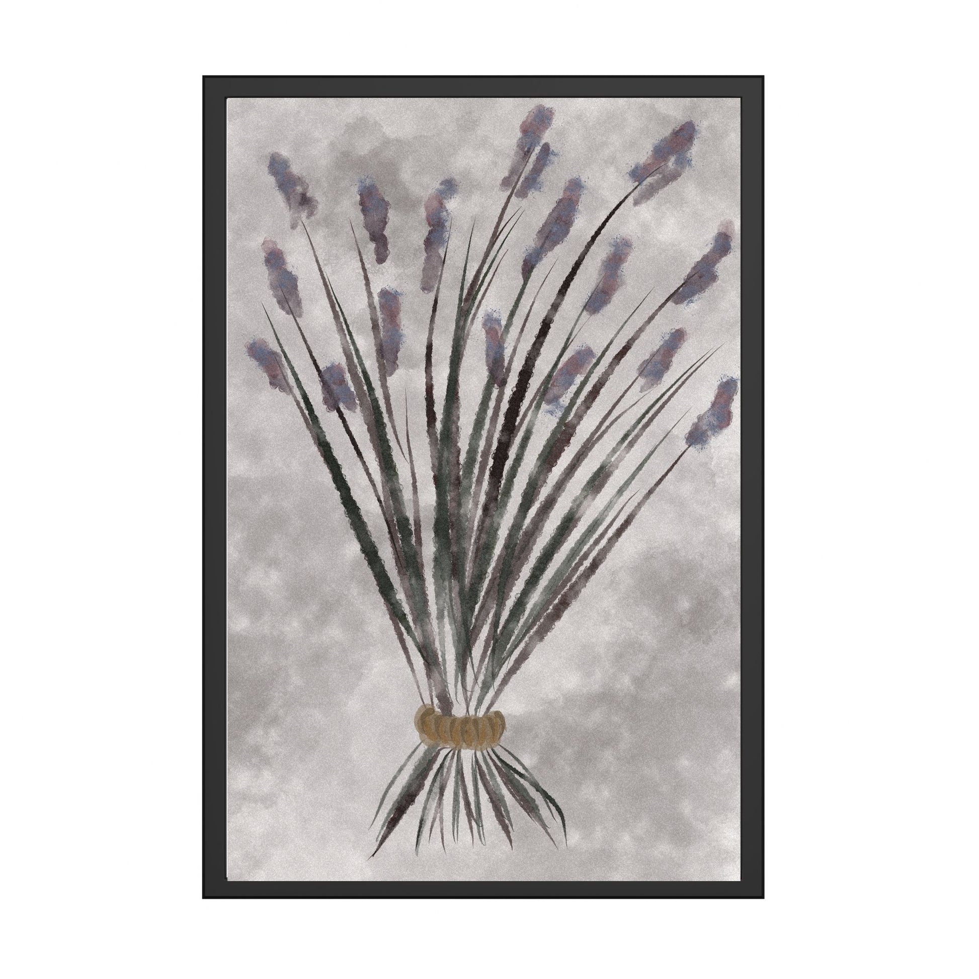 Her har jeg malt en lavendelbukett i dype lillafarger med vannmaling.