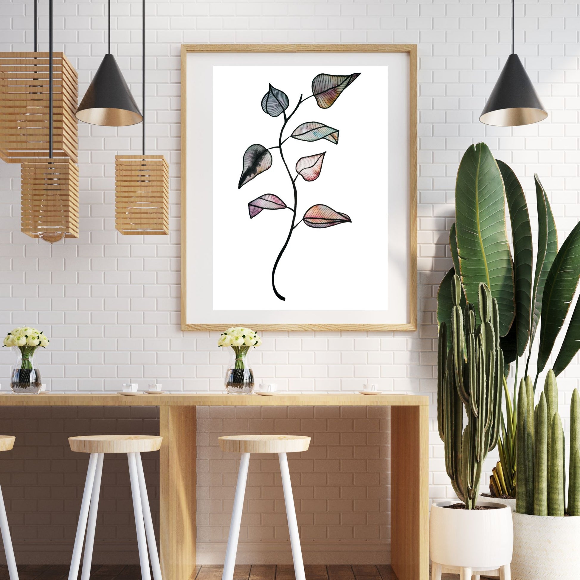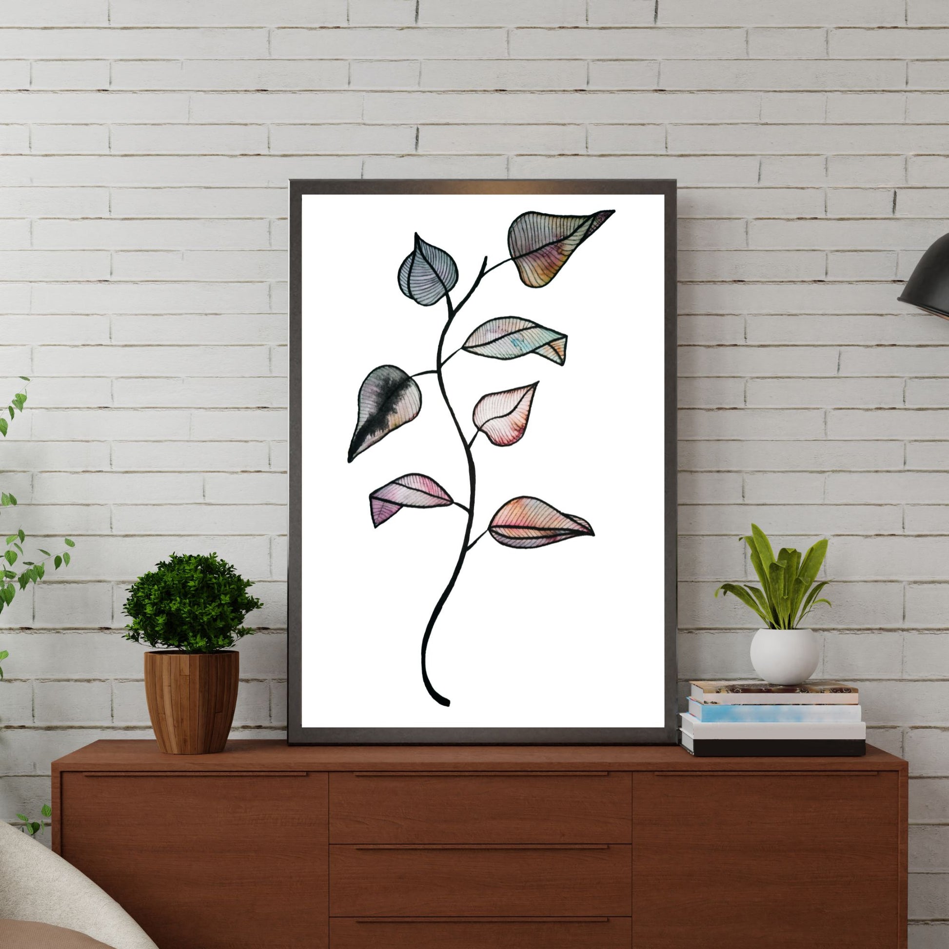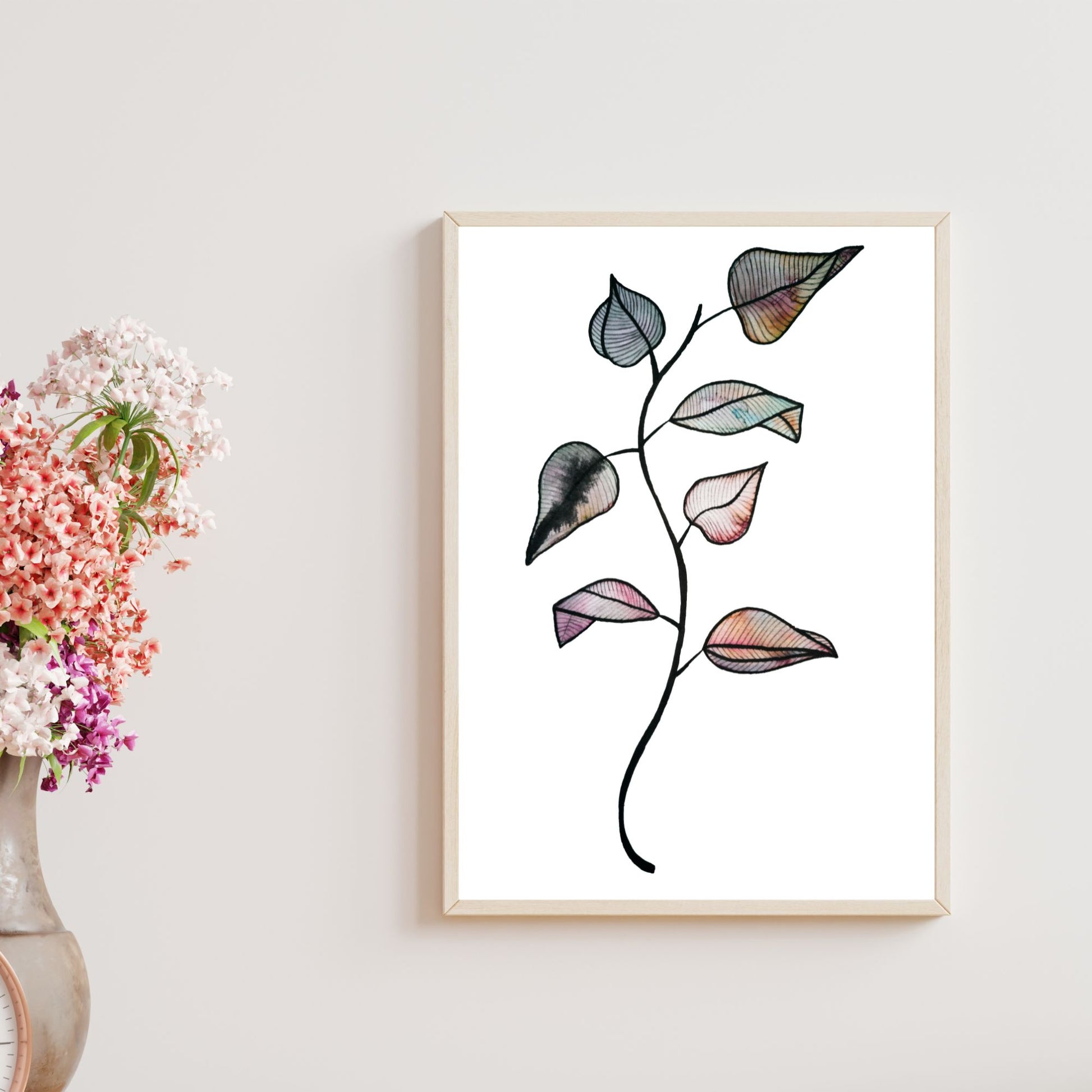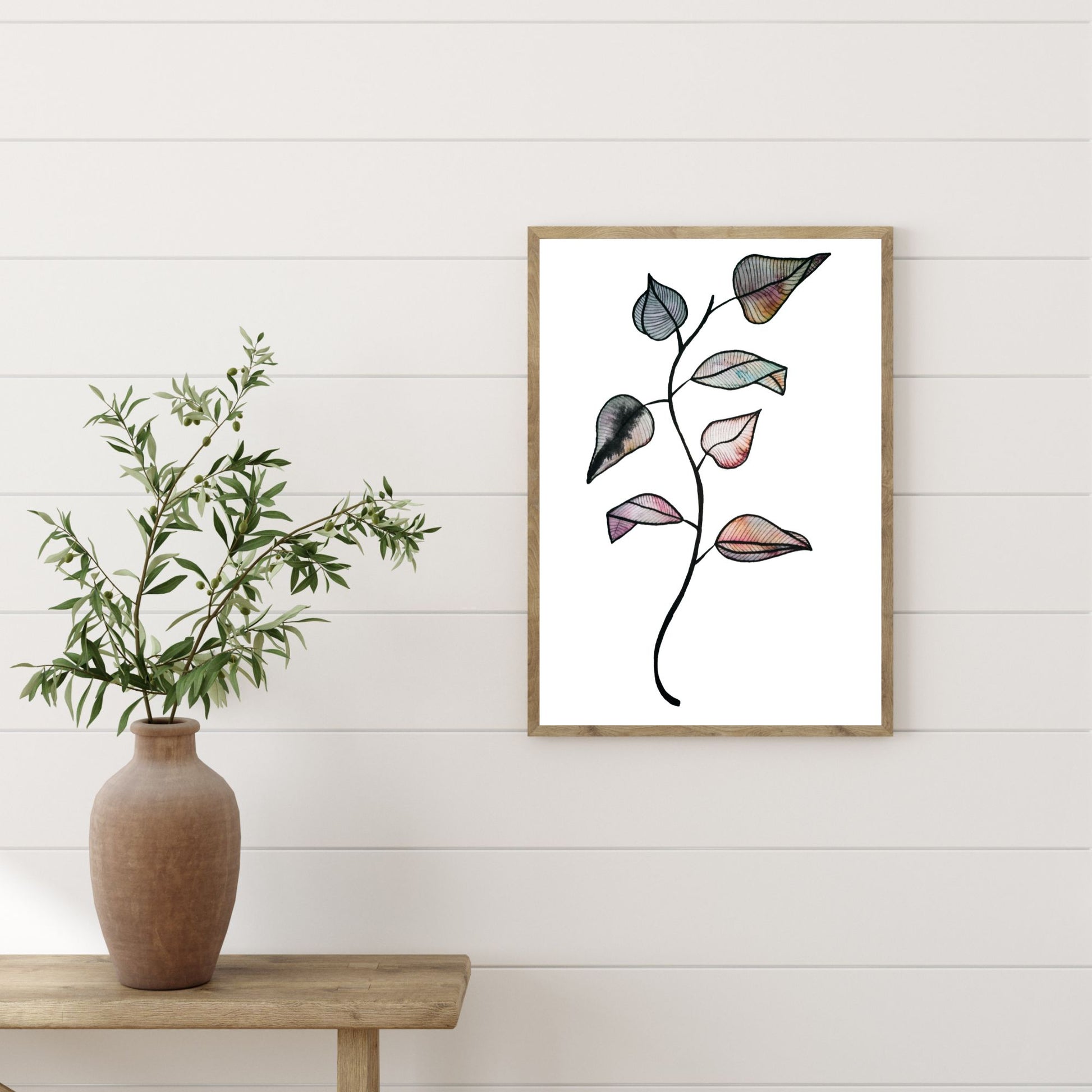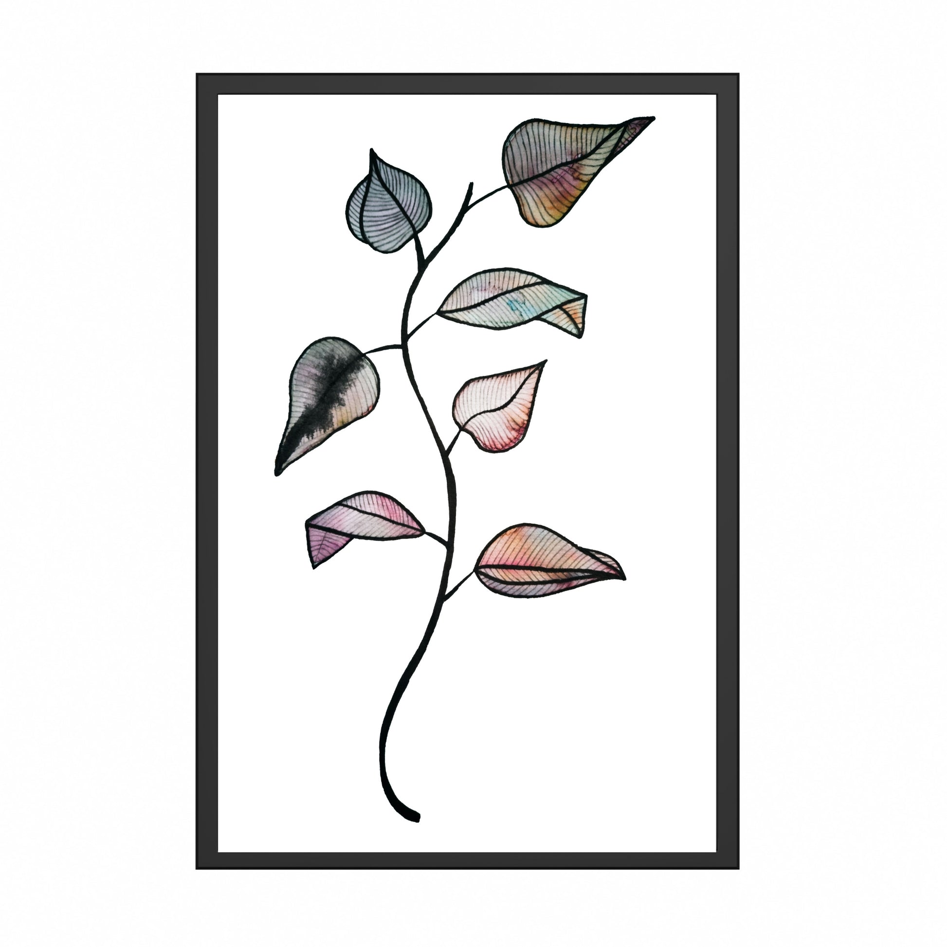 Her har jeg malt en kvist med blader med akvarellmaling. Nydelig fargespill.