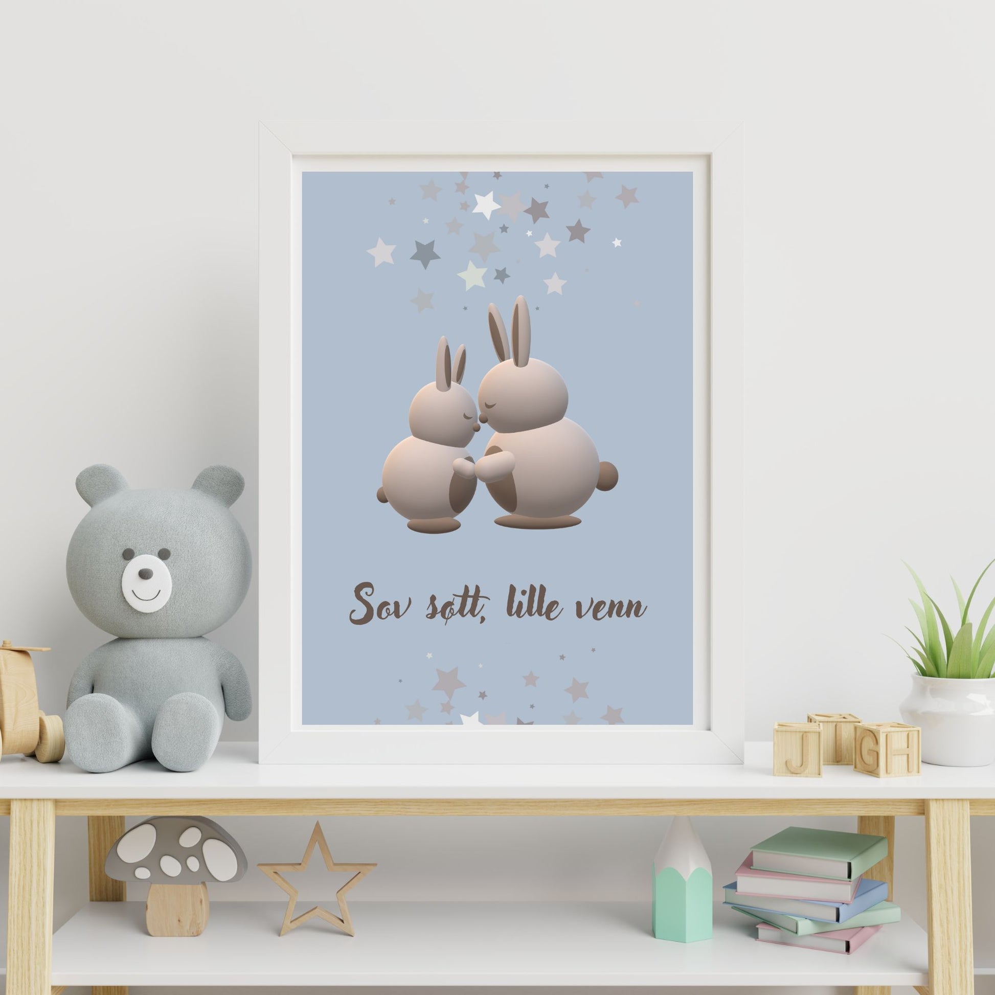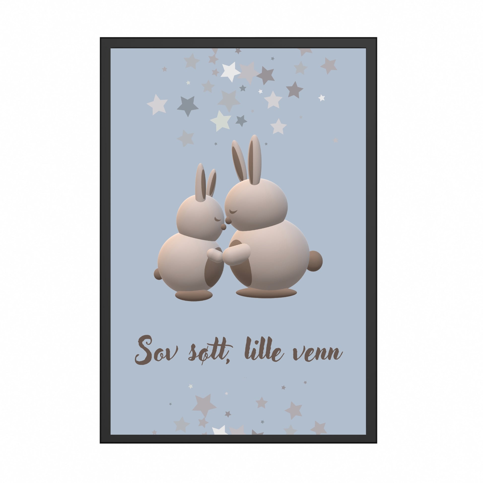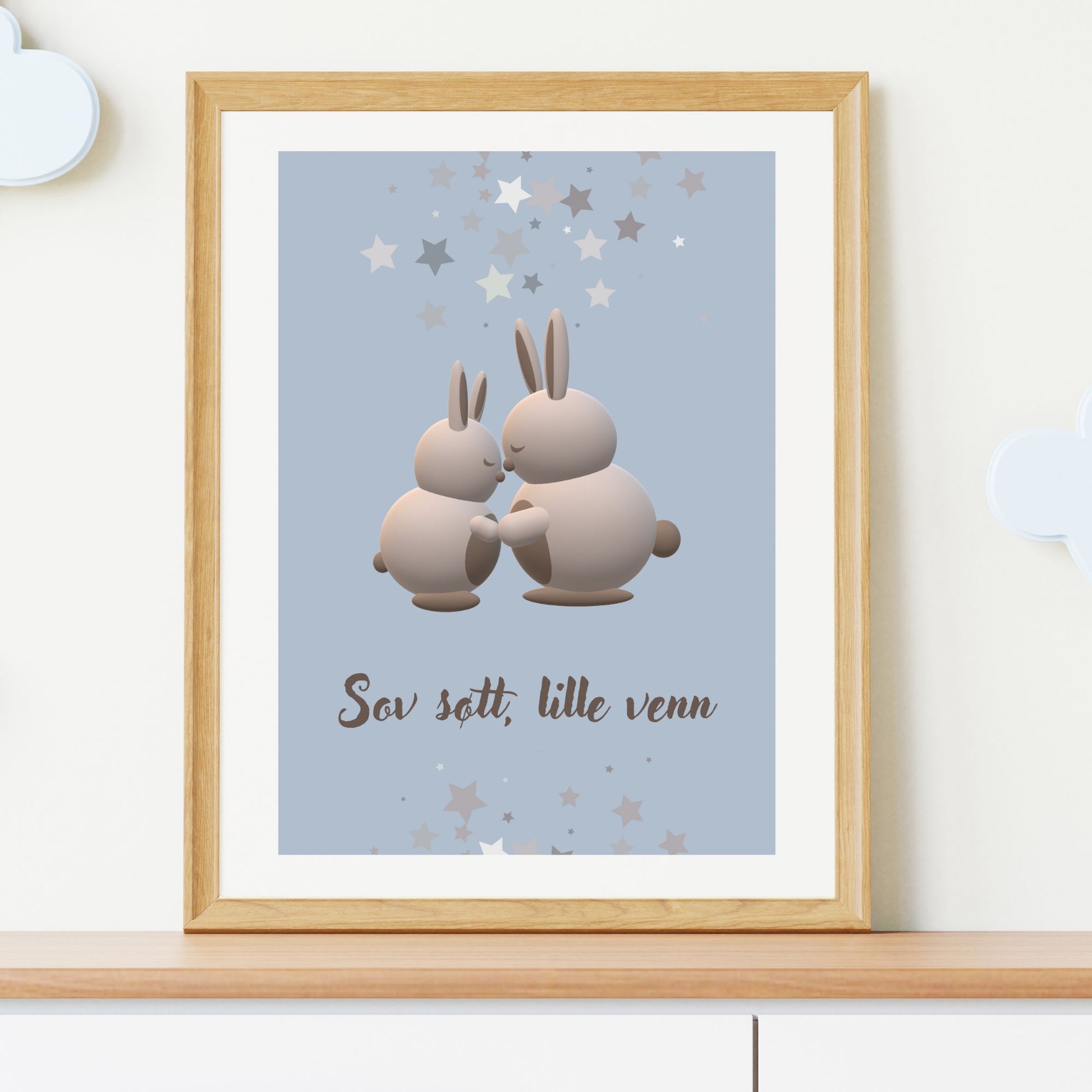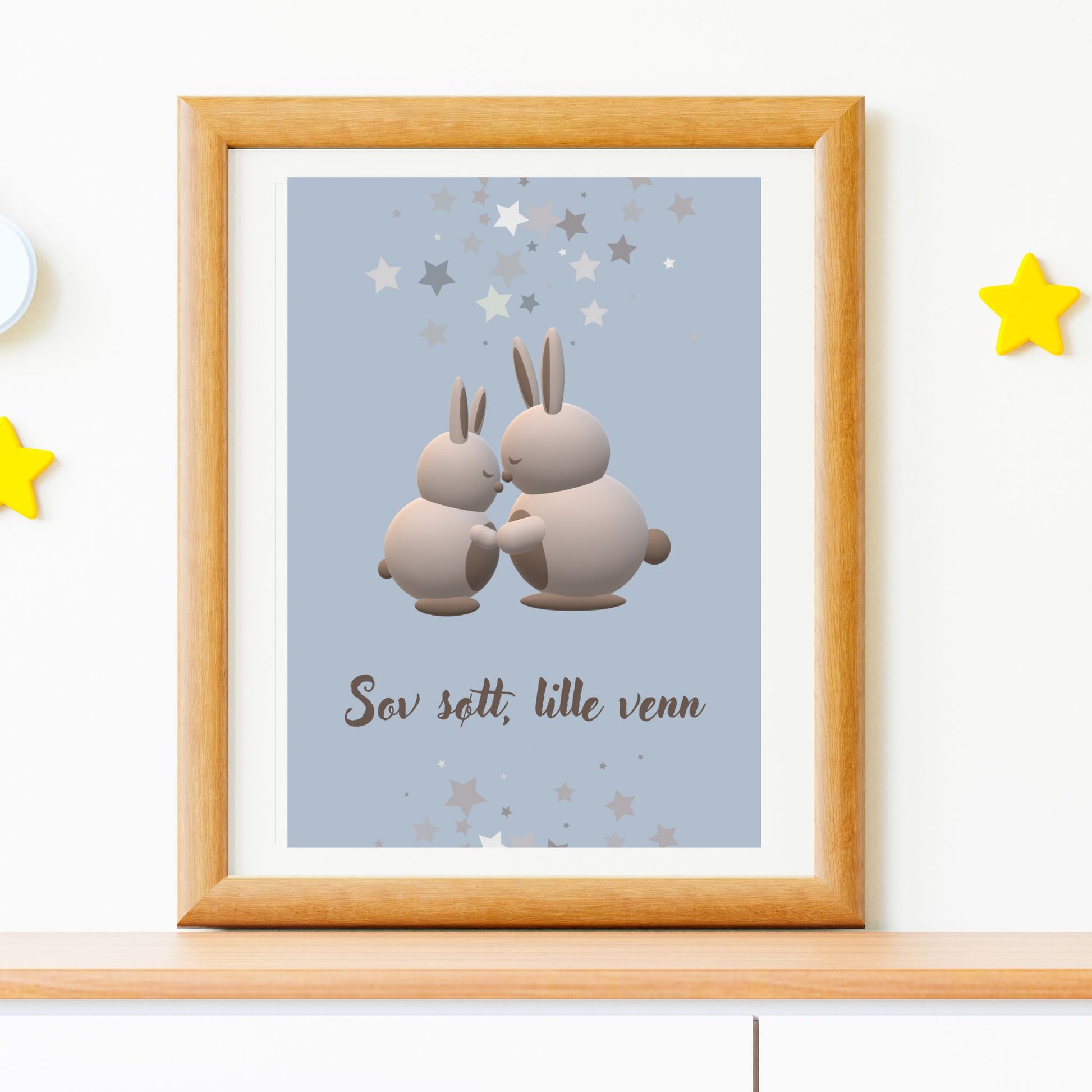 Her har jeg designet to sovende kaniner under stjernedryss. Tekst: "Sov søtt, lille venn".
