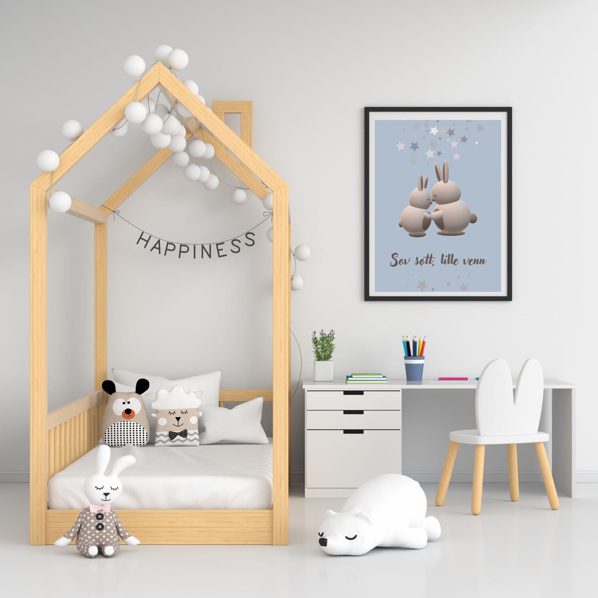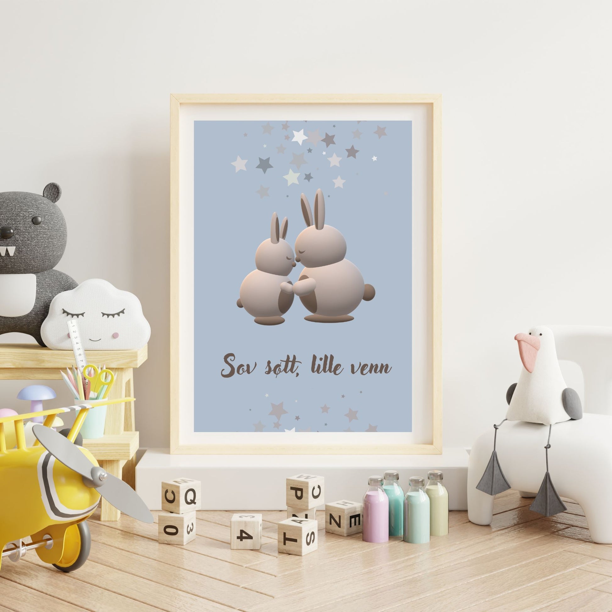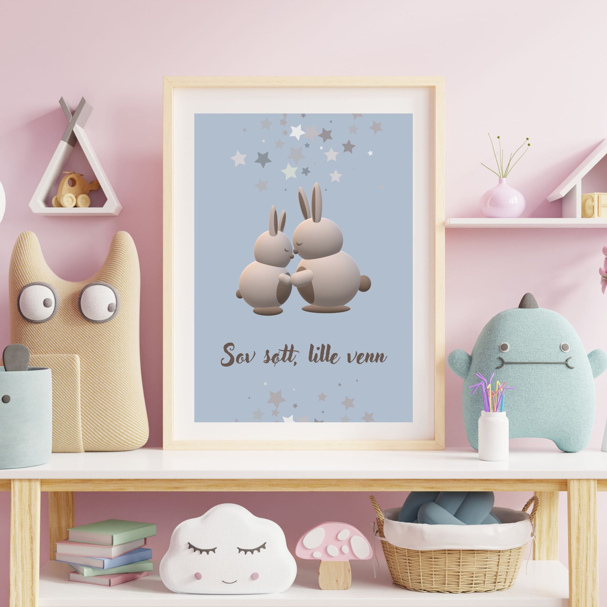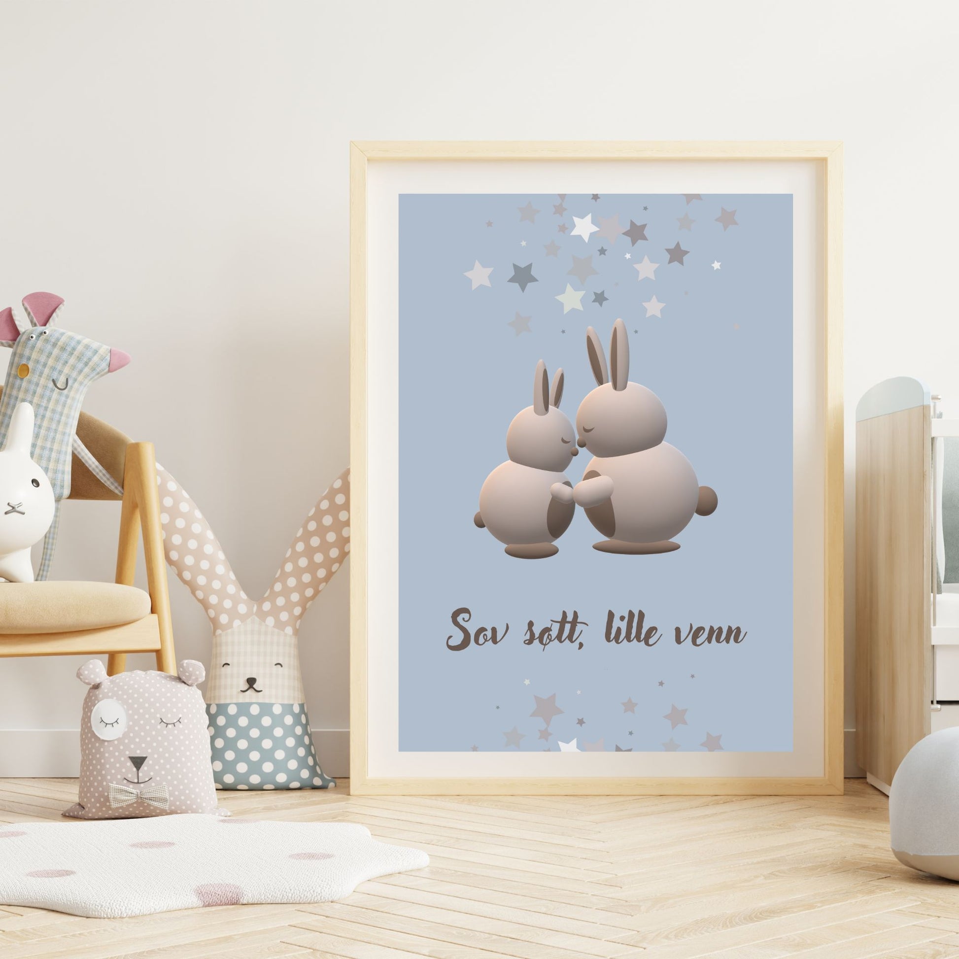 Her har jeg designet to sovende kaniner under stjernedryss. Tekst: "Sov søtt, lille venn".