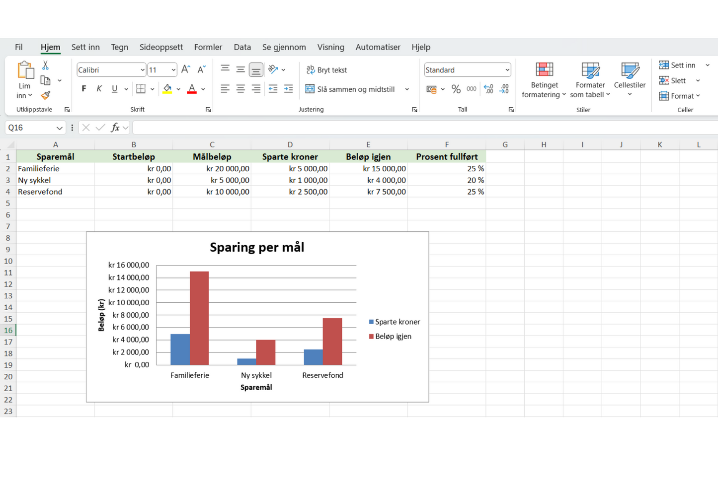 Denne smarte og brukervennlige Excel-malen hjelper deg å holde orden på familiens økonomiske mål – og lar dere se fremgangen visuelt med et fargerikt stolpediagram. Perfekt for alt fra feriedrømmer til nye sykler!