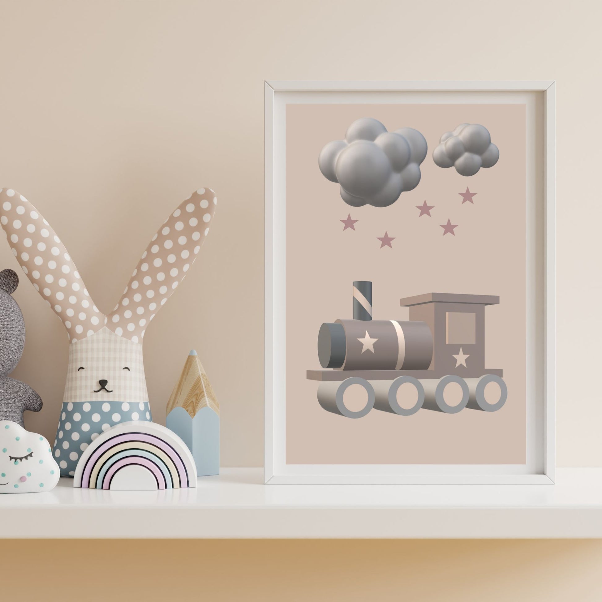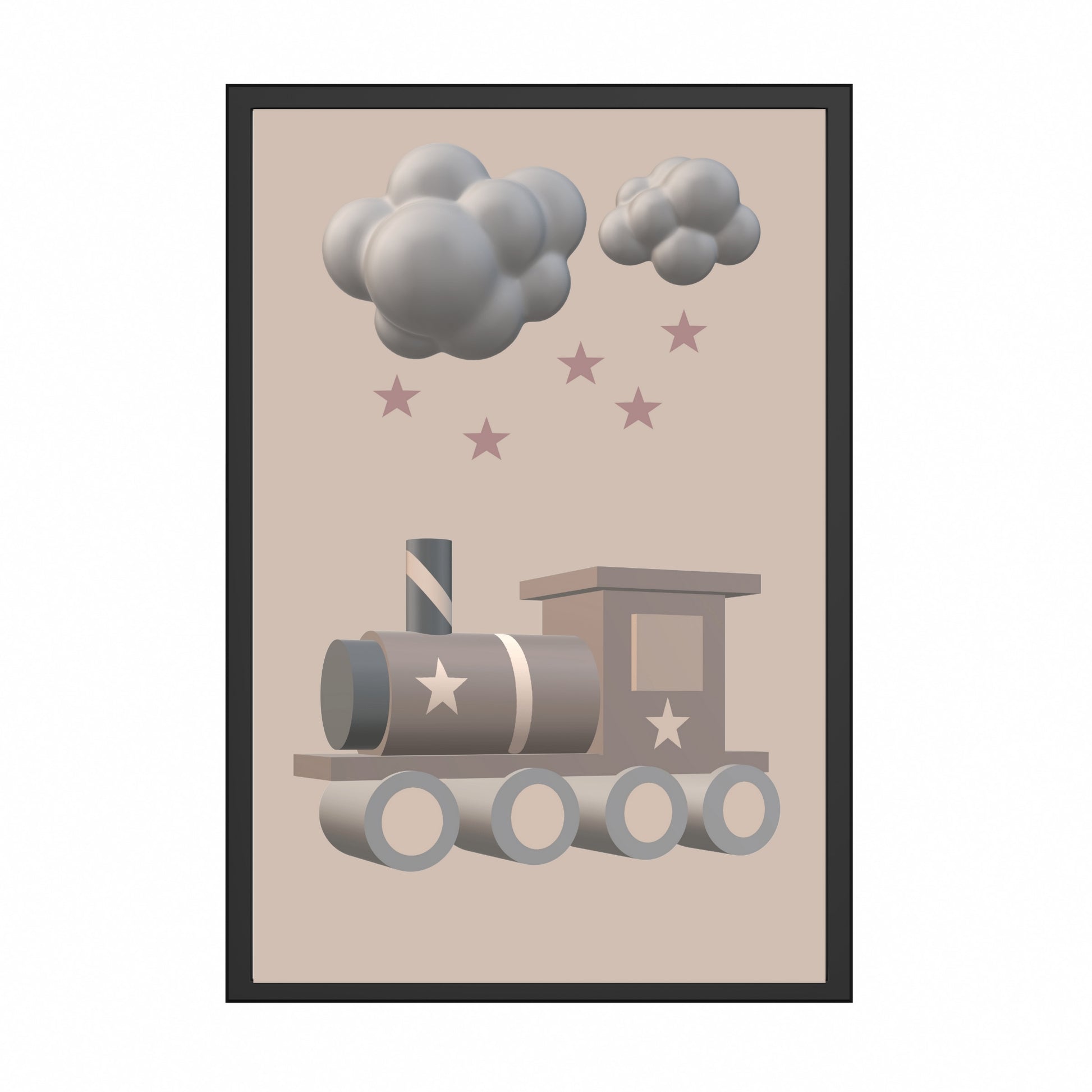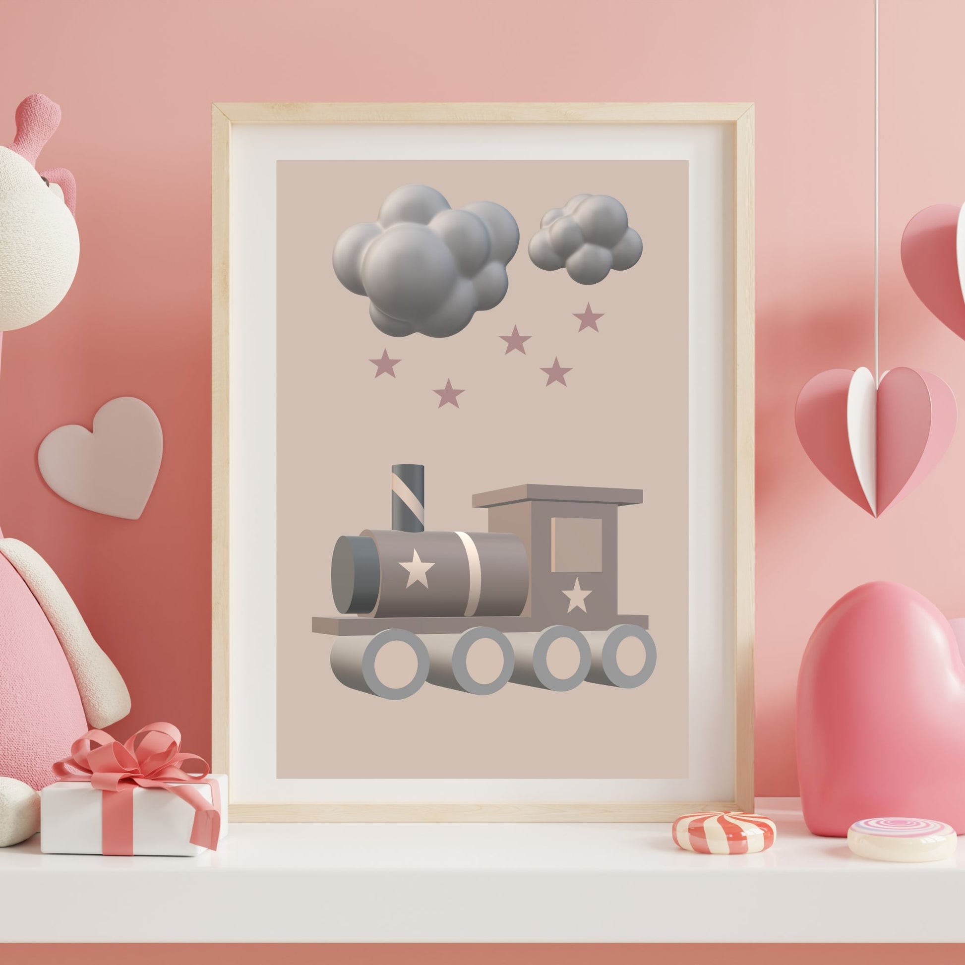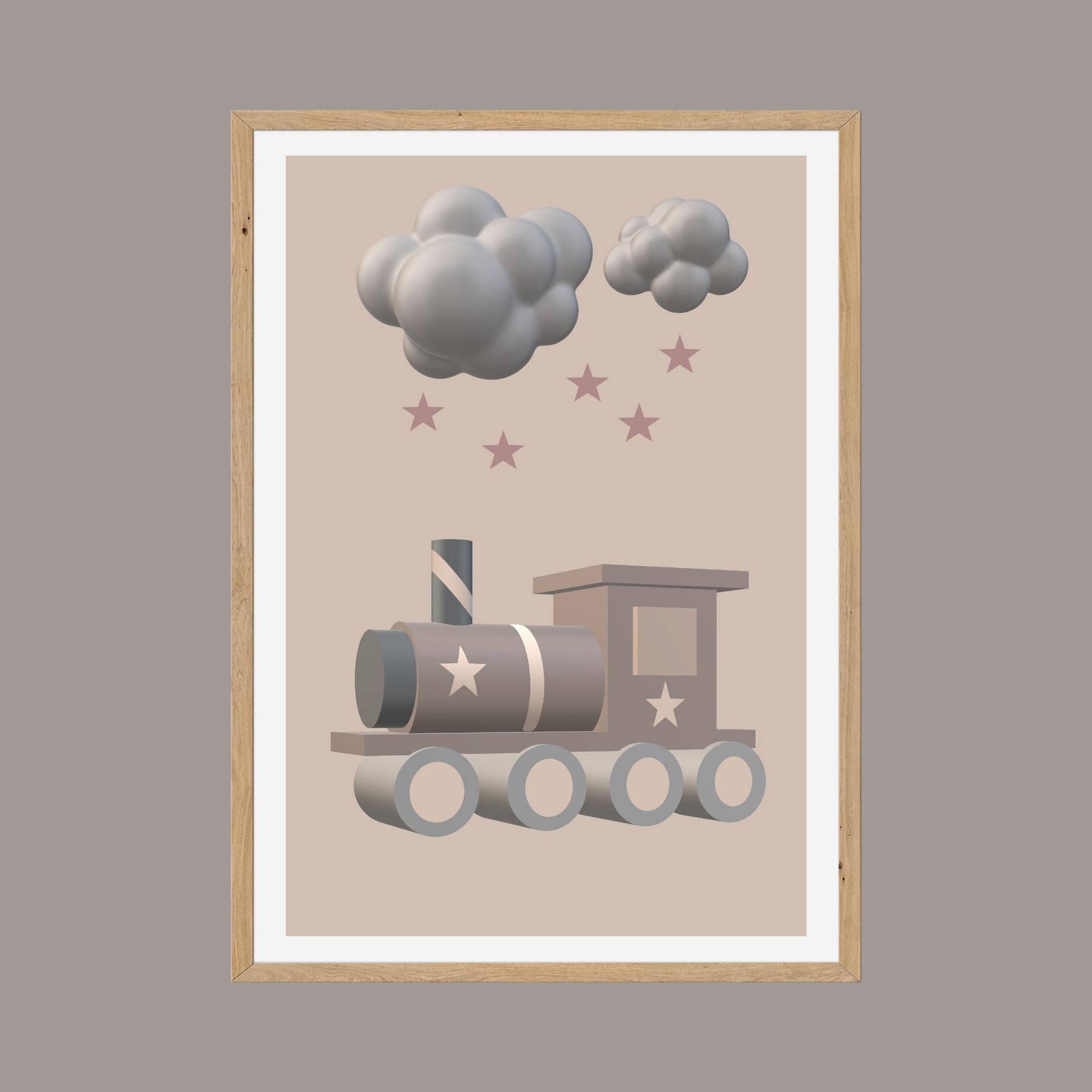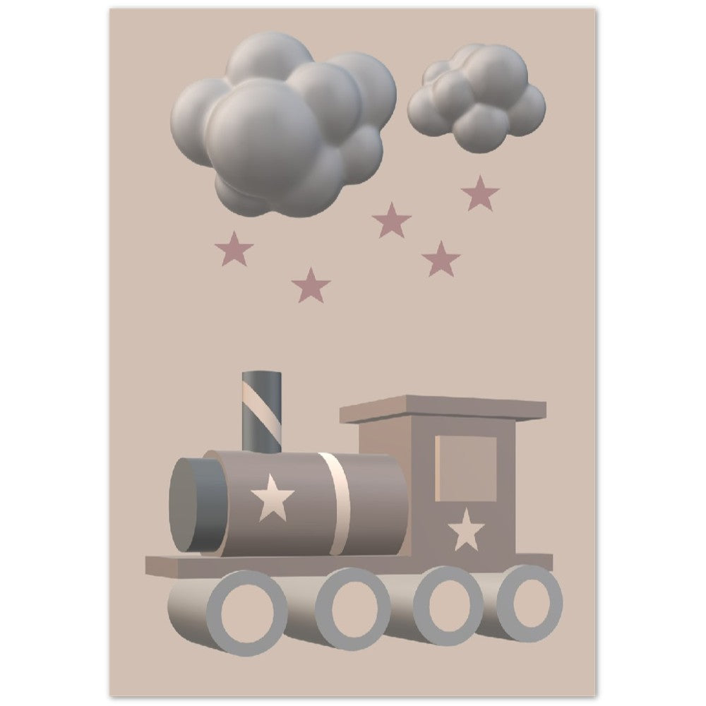 Her har jeg designet et tredimensjonalt tog i lune beige-toner, med stjernedryss fra skyer.
