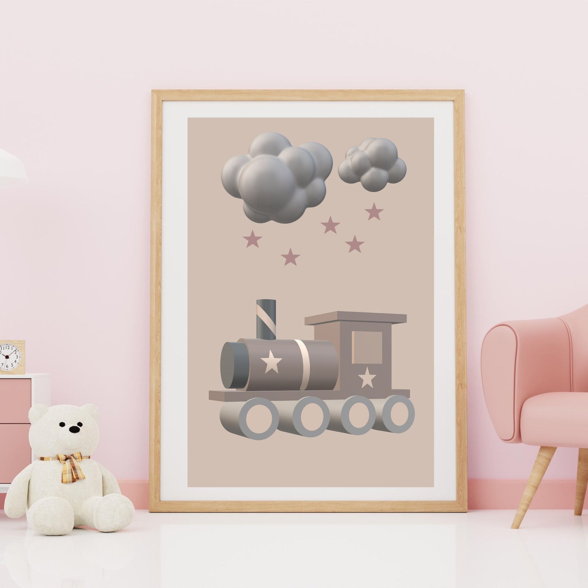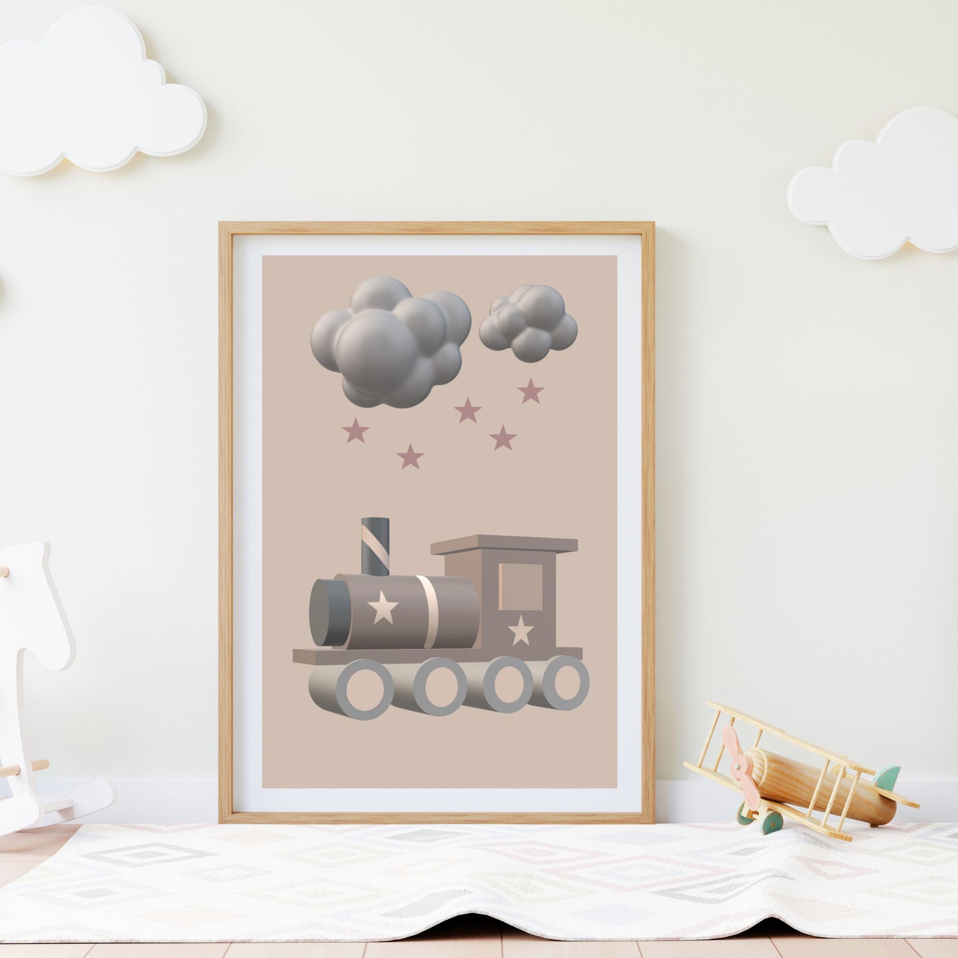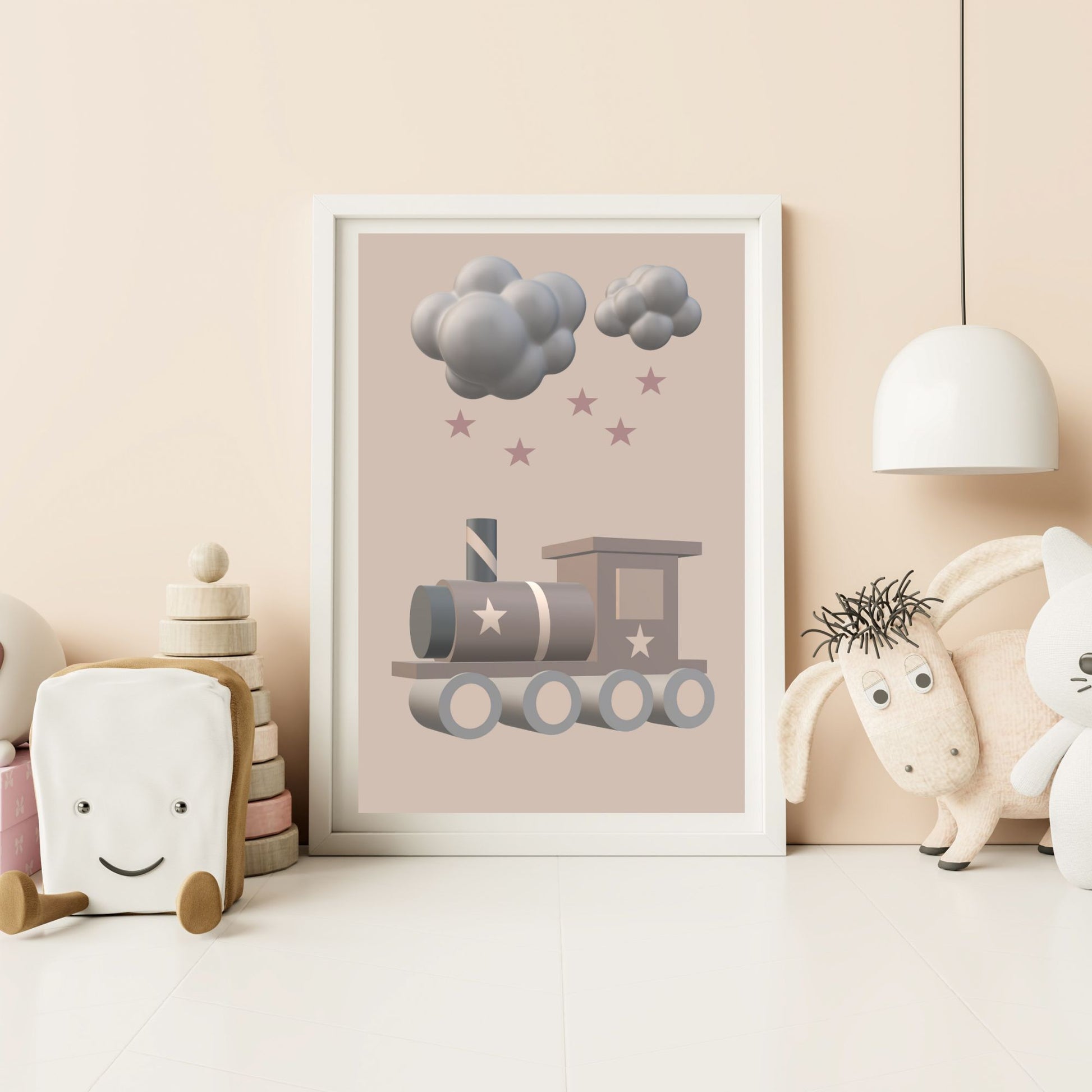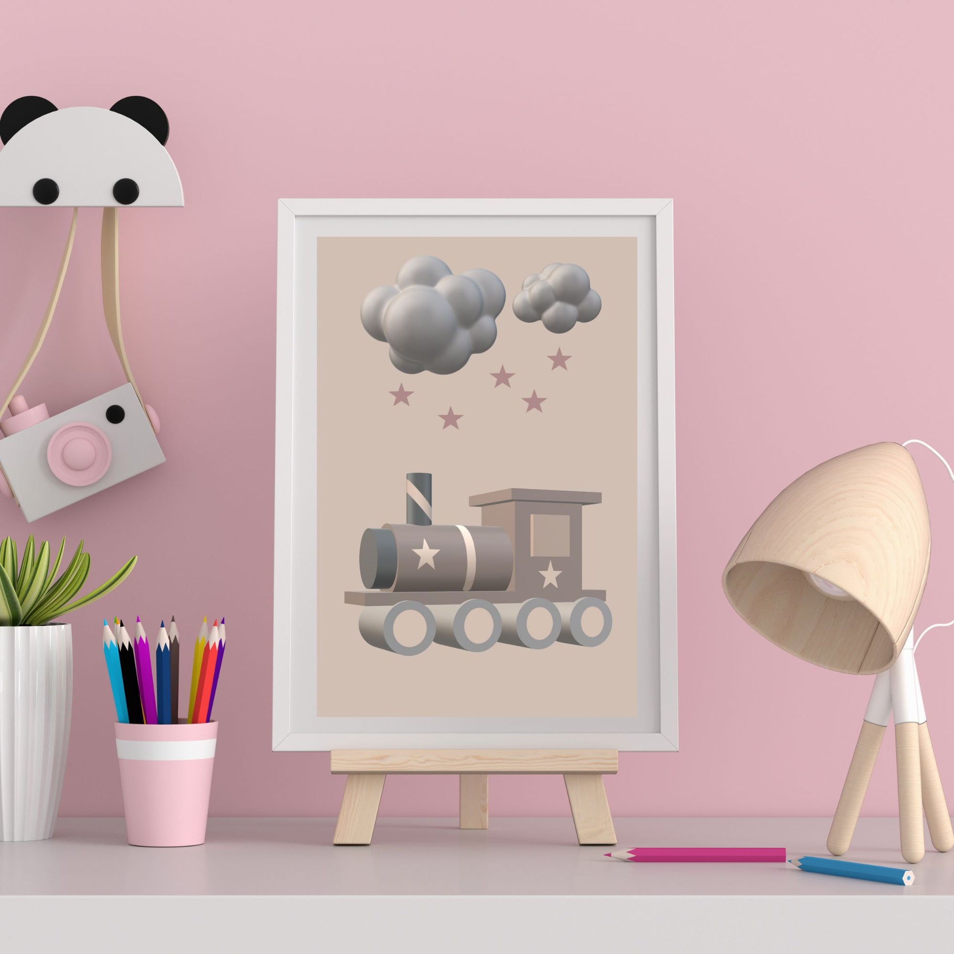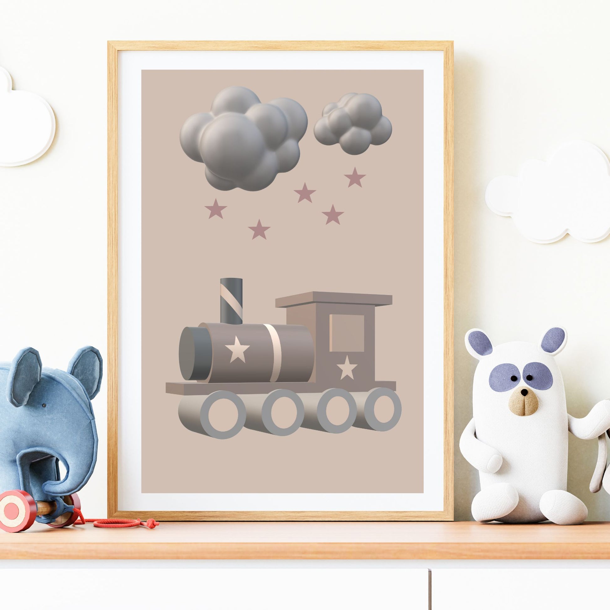 Her har jeg designet et tredimensjonalt tog i lune beige-toner, med stjernedryss fra skyer.