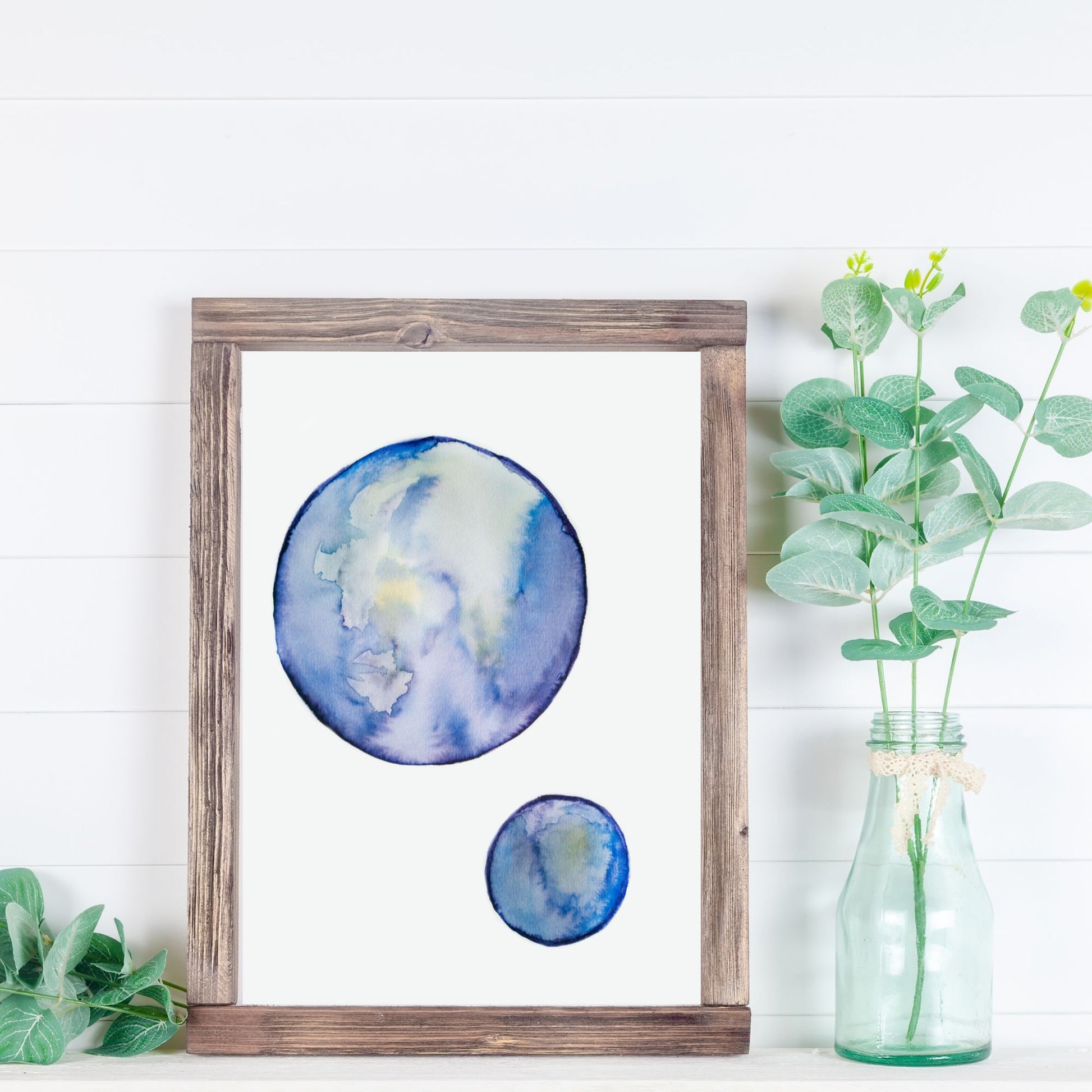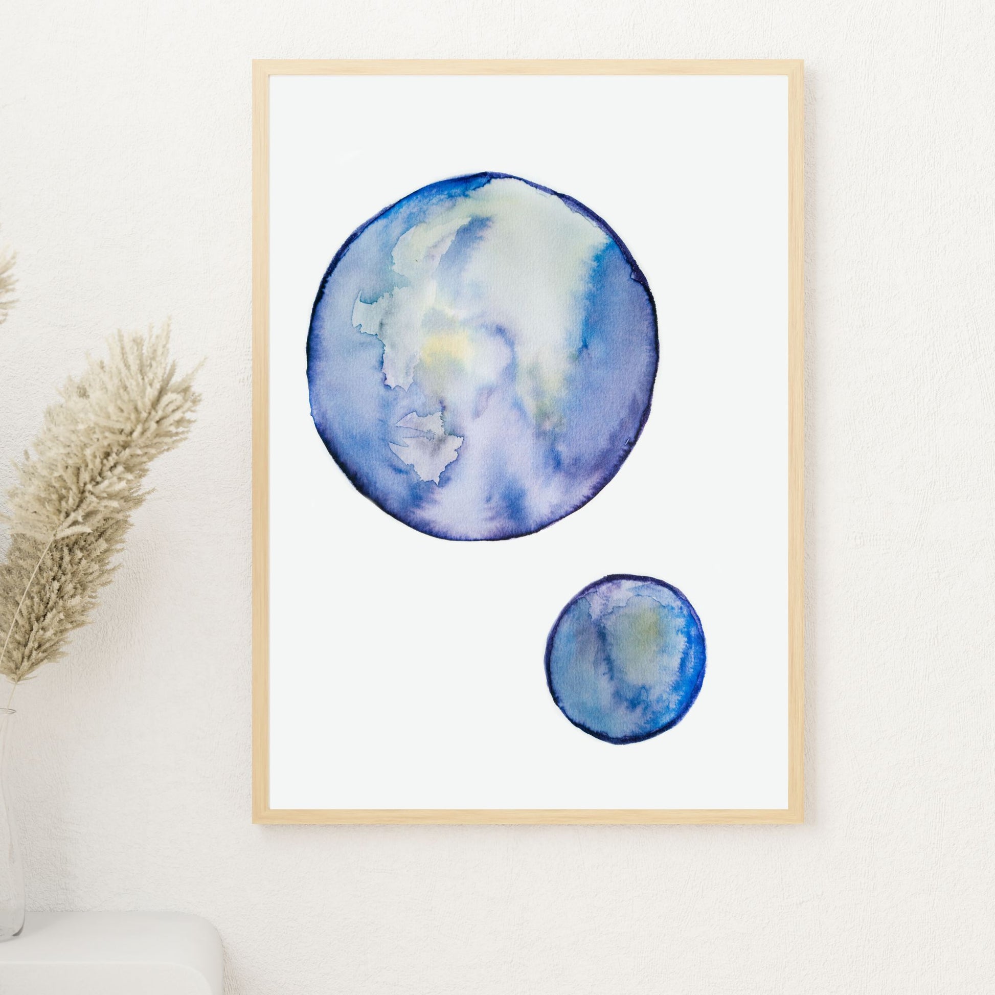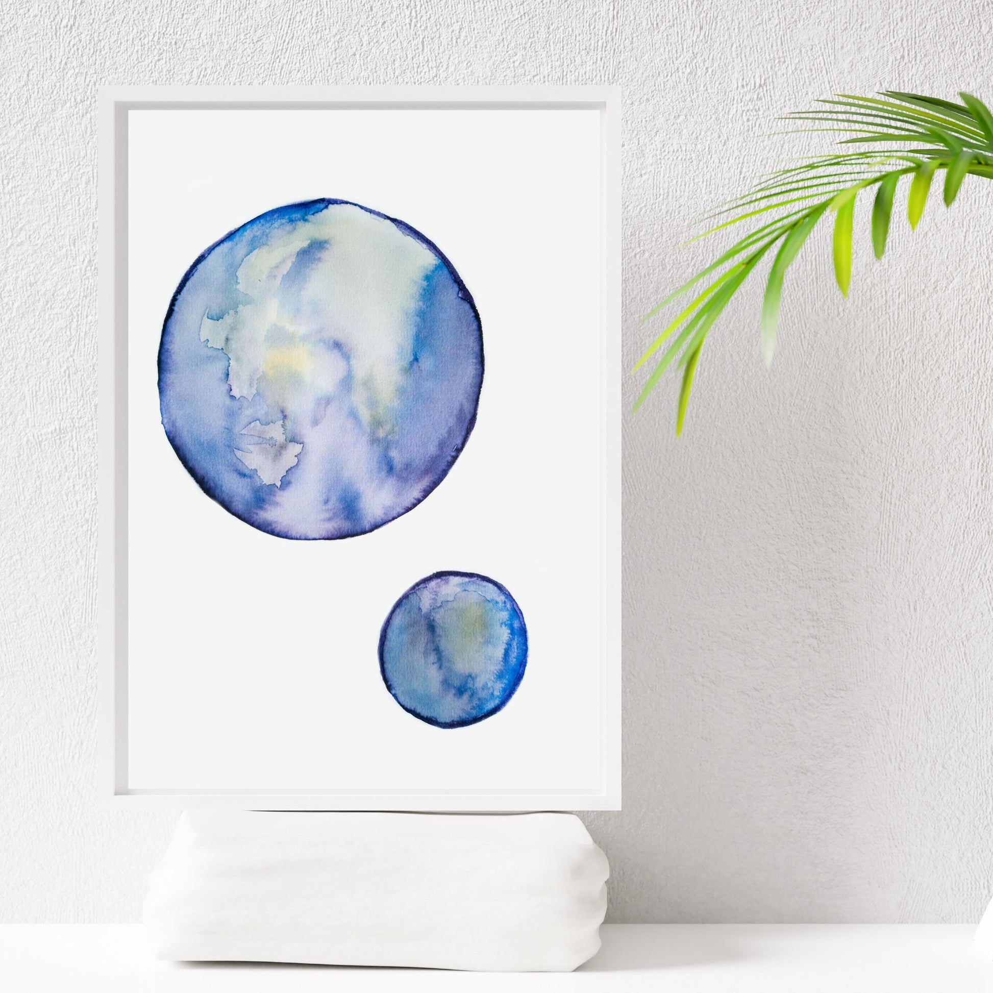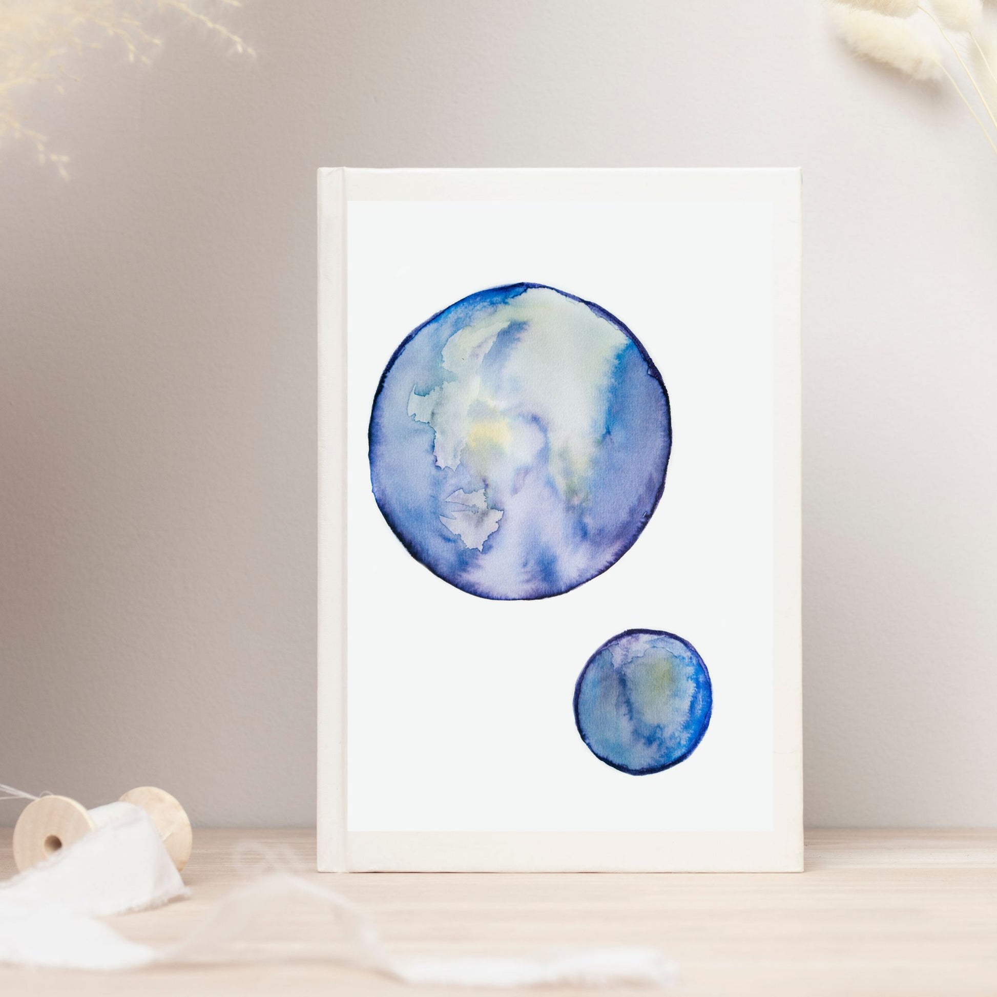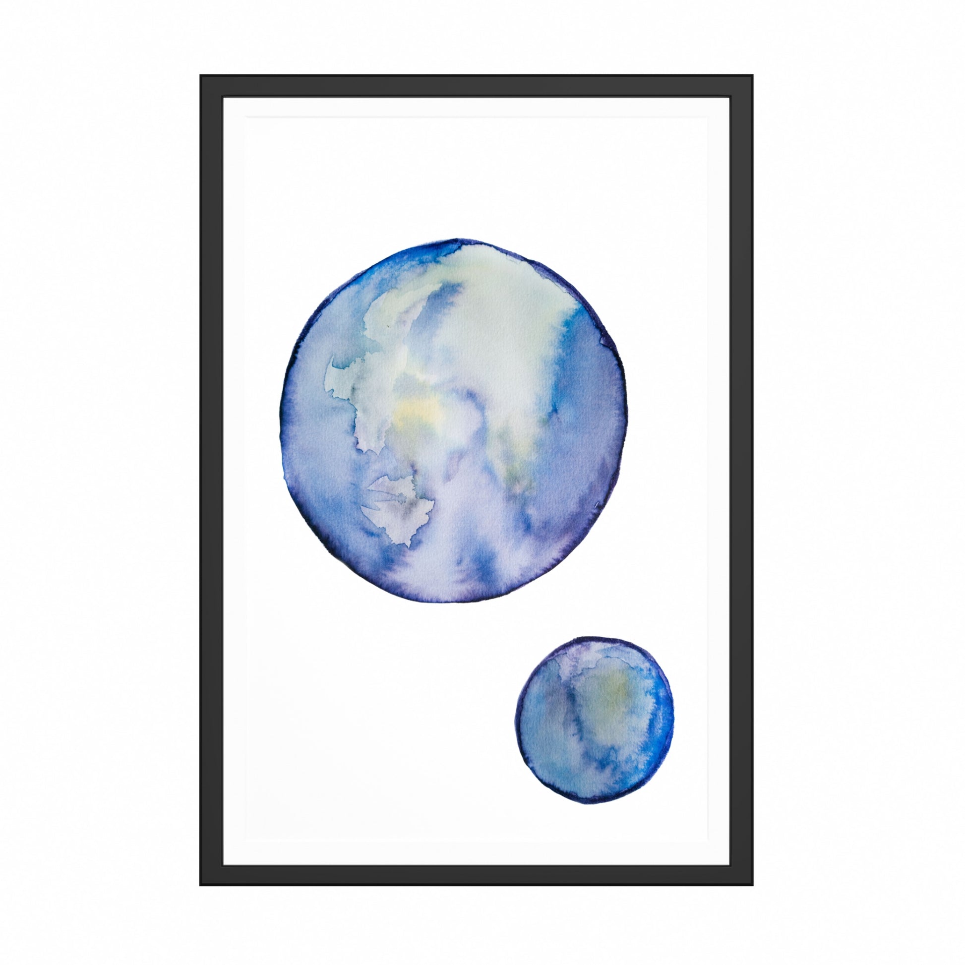 Her har jeg malt tvillingplaneter med akvarellmaling. Deilige blåtoner.